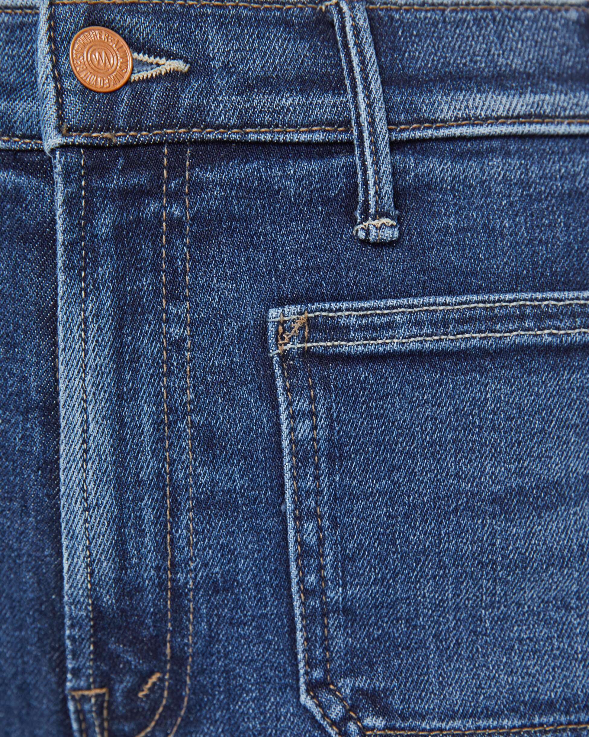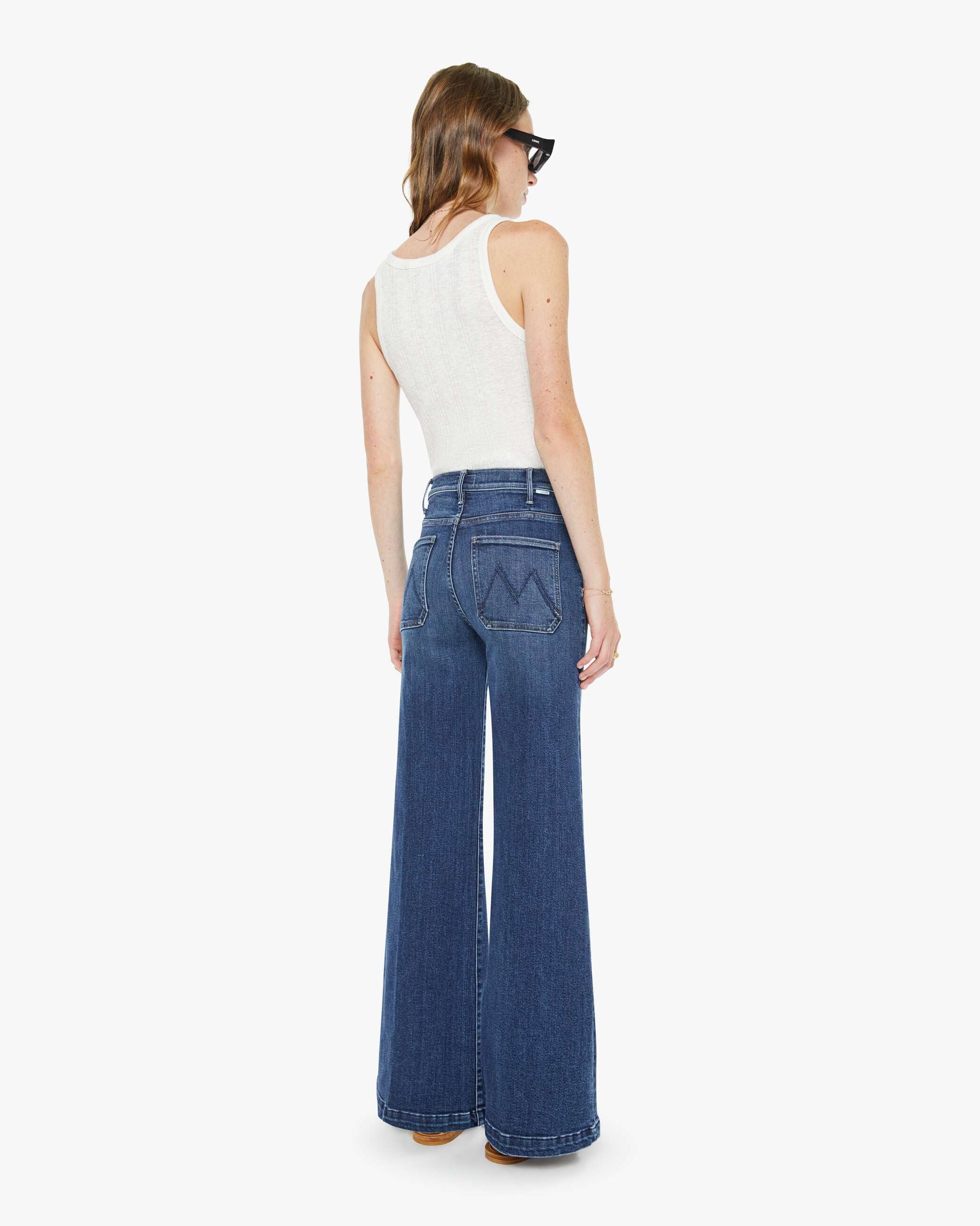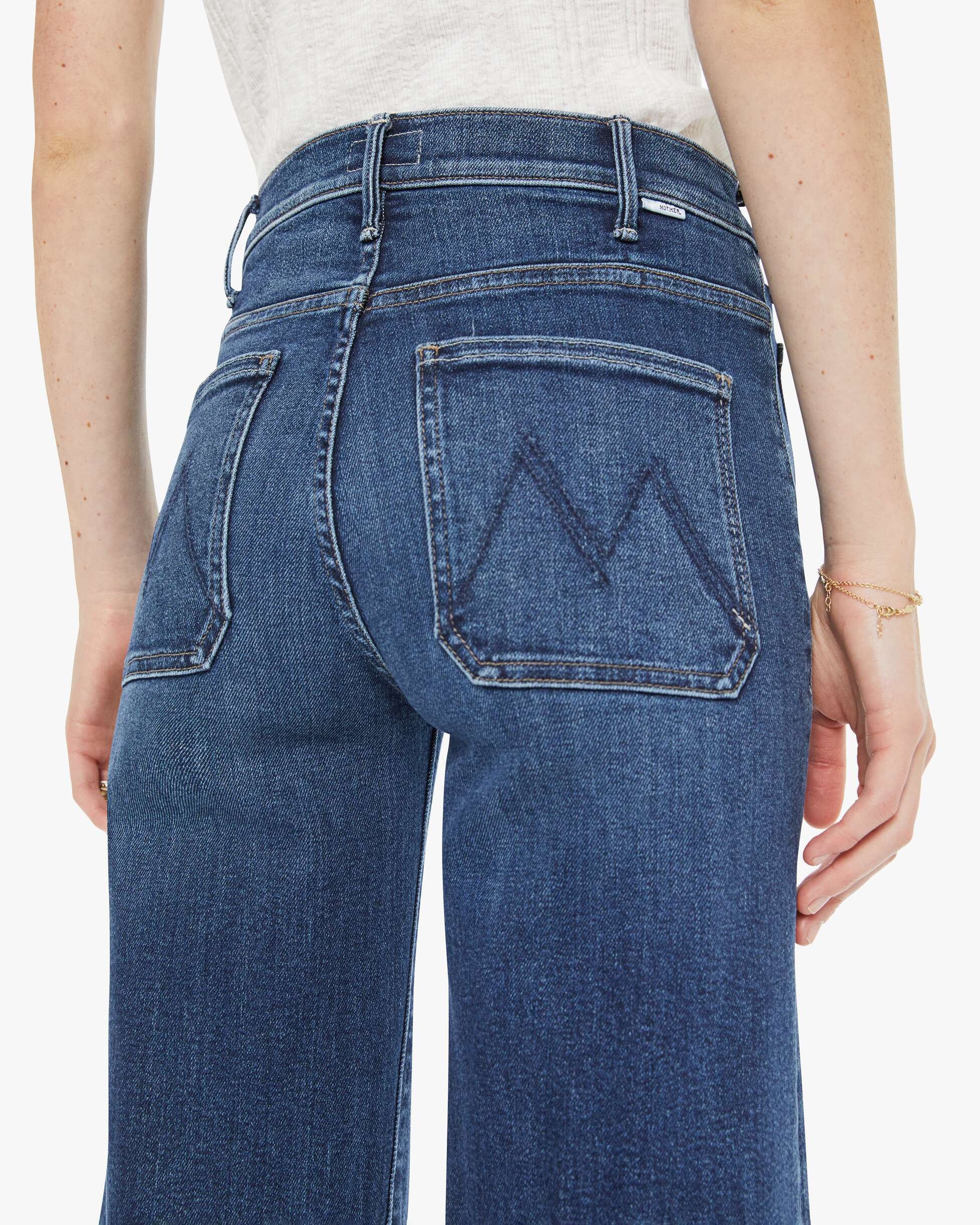 Hail Mary. 70s-inspired wide leg jeans with a high rise, zip fly, patch pockets, 31-inch inseam and a clean hem. Made from stretch denim, One Last Shot is a dark blue with subtle whiskering and fading at the knees.