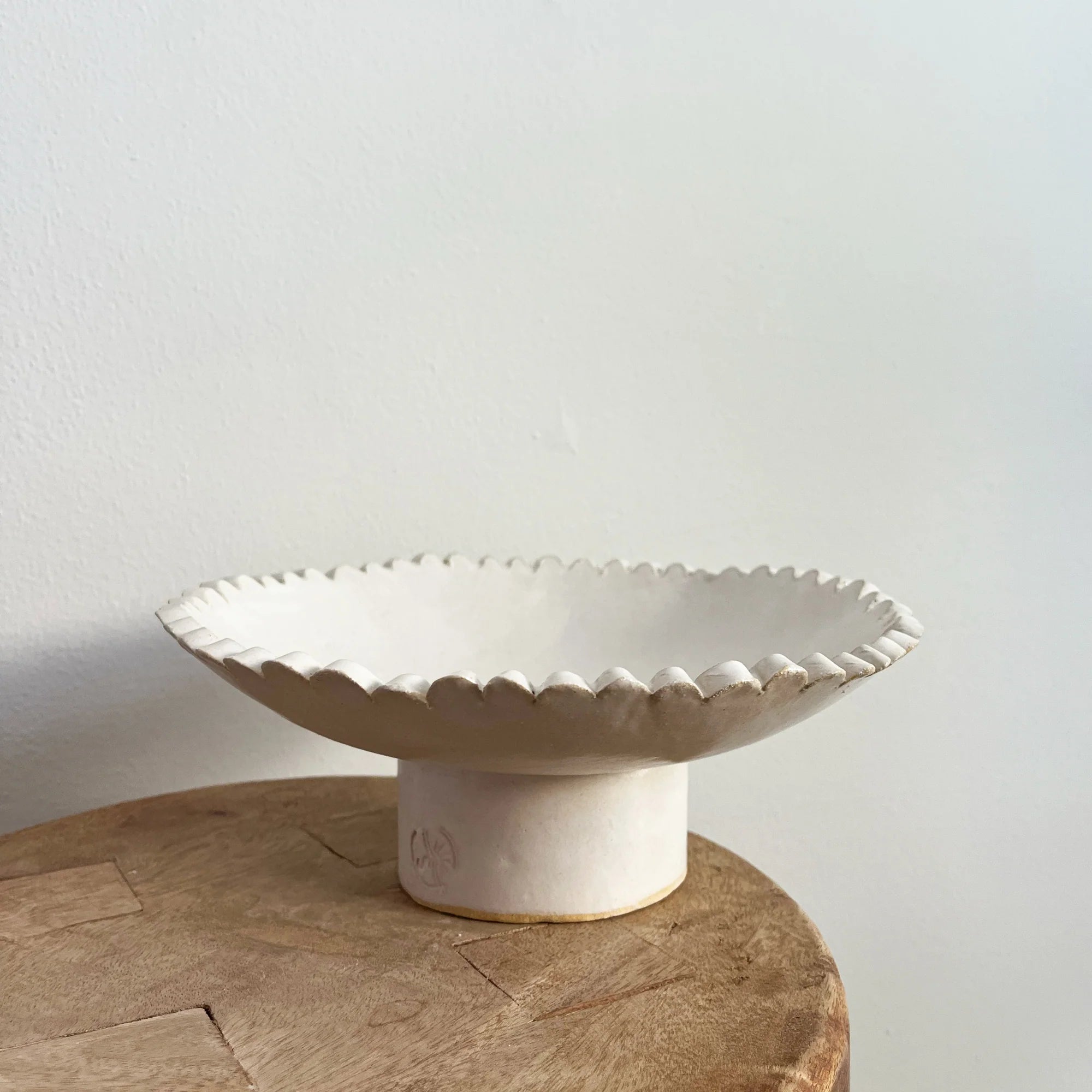 Shallow pedestal bowl with hand-cut scalloped trim. Just add fruit.