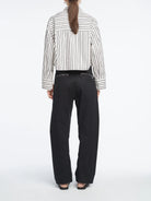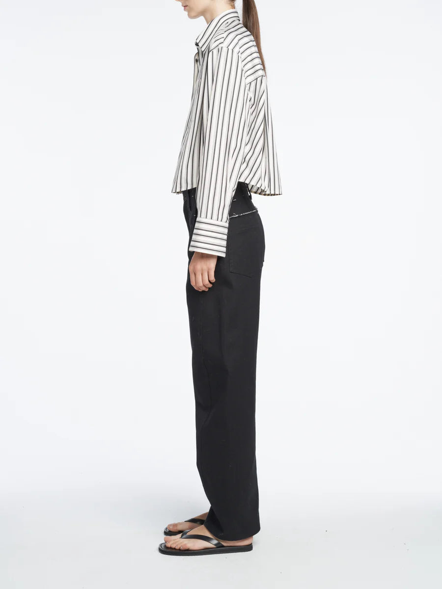 Our signature Cropped Shirt in in an ivory and black stripe made of 100% Organic Cotton Sateen and completed with out signature corozo buttons. The cropped silhouette has our signature yoke and hang loop on the back, revealing a slight cocoon affect for subtle volume.