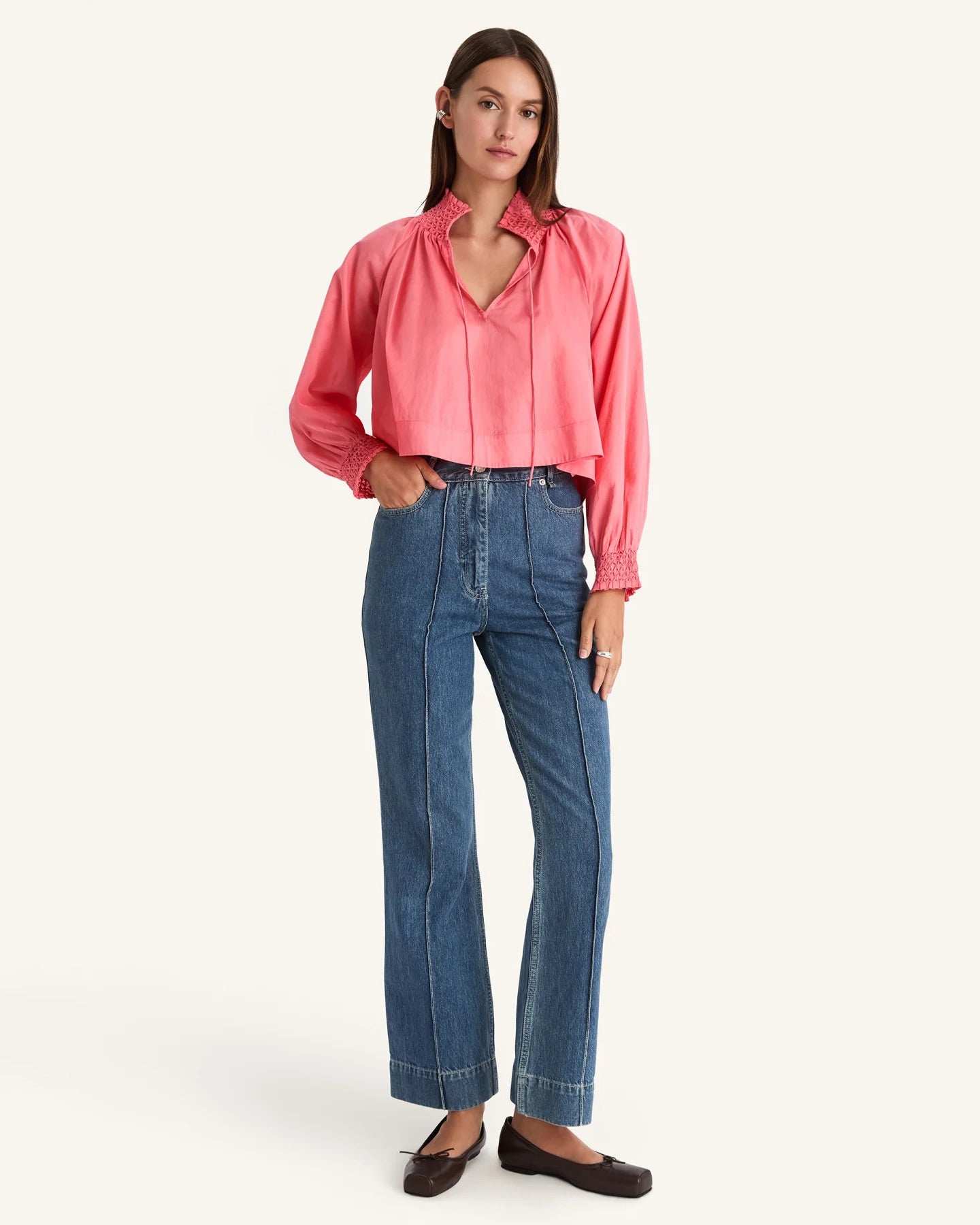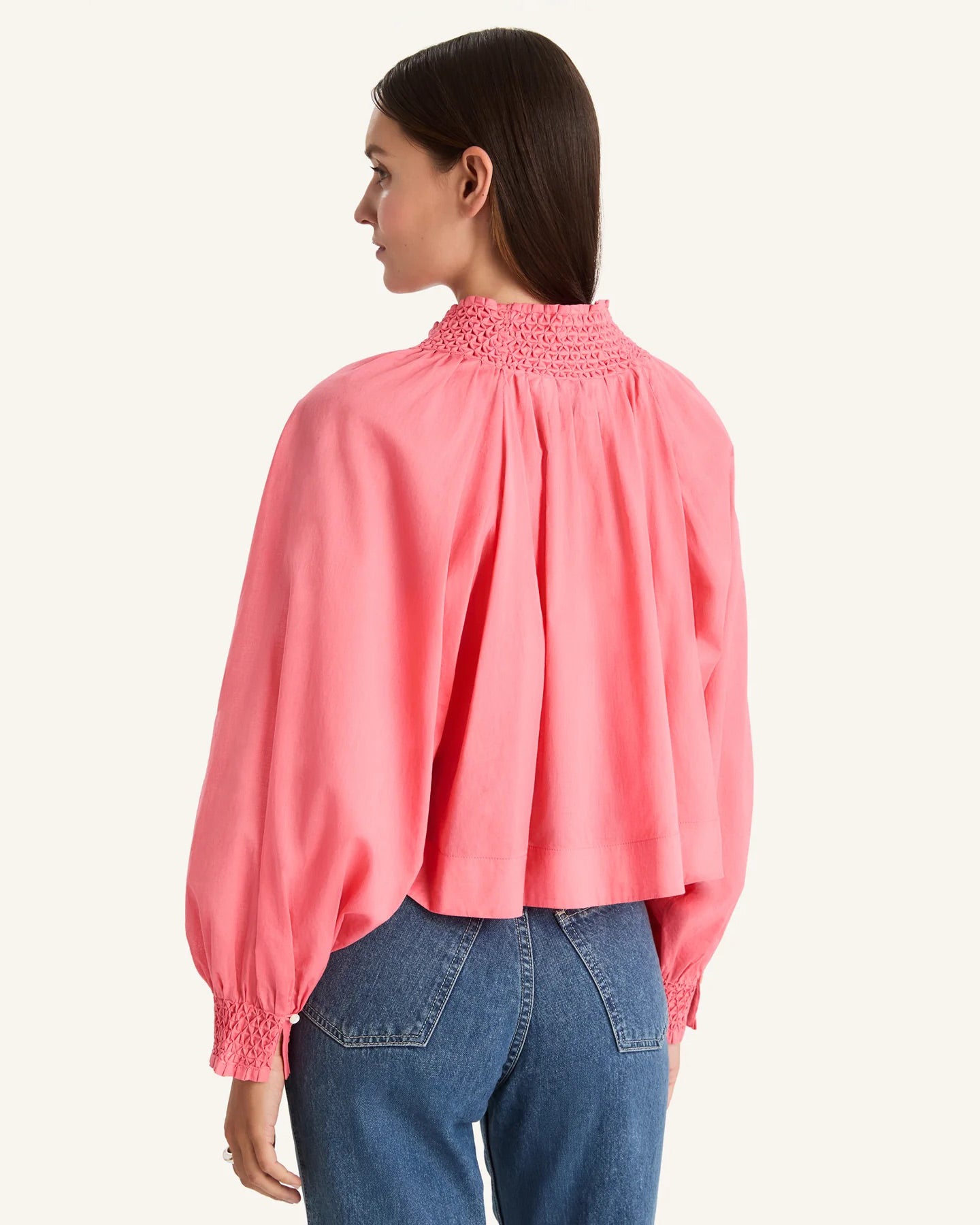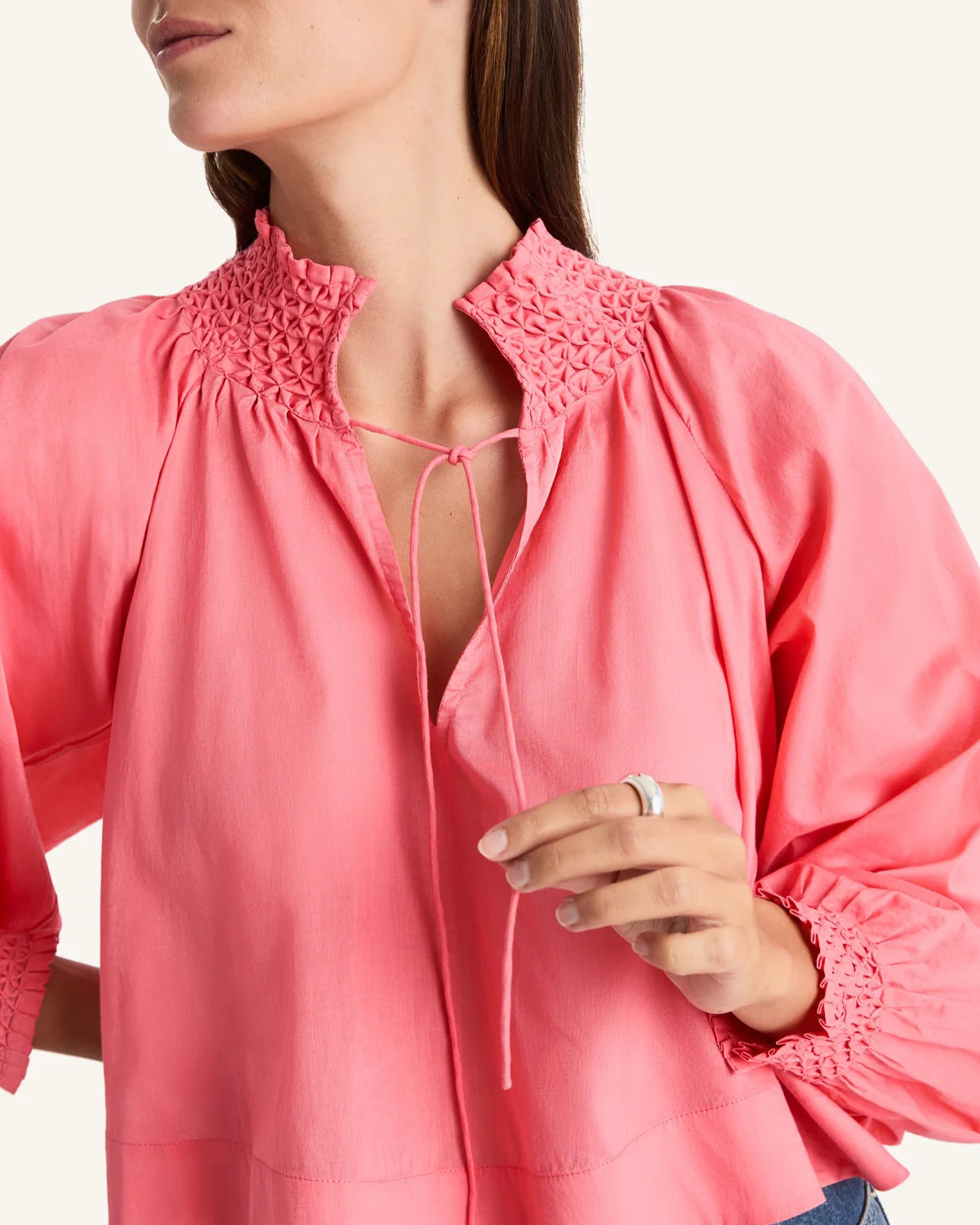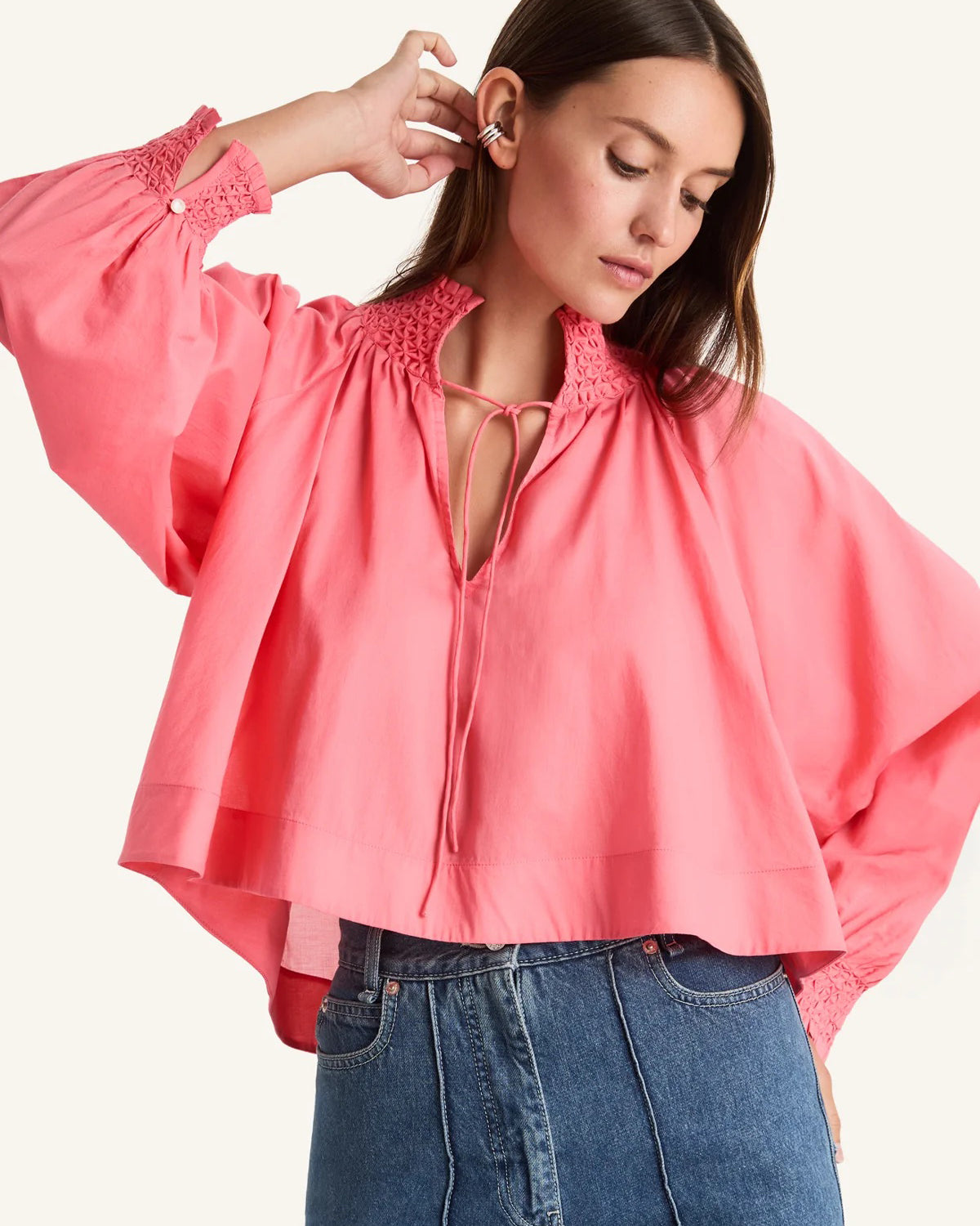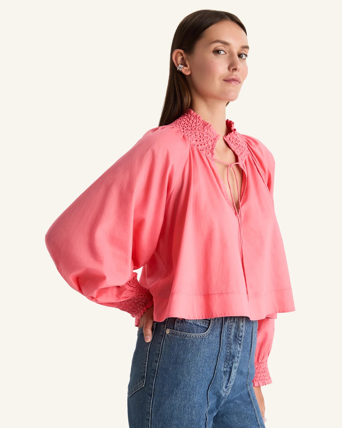 Crafted from 100% cotton voile, the HELENE Top exudes an effortless, romantic allure. Its cropped silhouette and flowy, lightweight fabric lend an ethereal feel. The V-neckline is accented by a front tie detail, allowing you to tie it closed or leave it open for a more alluring look. Intricate honeycomb hand-smocking along the neckline and sleeve cuffs adds a touch of artistry and texture. The button closure on the cuffed sleeves provides a refined finishing touch.