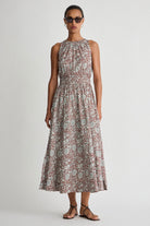 - Elastic at neckline and waist, fitted at the bodice, slits at both sides of skirt, side pockets
