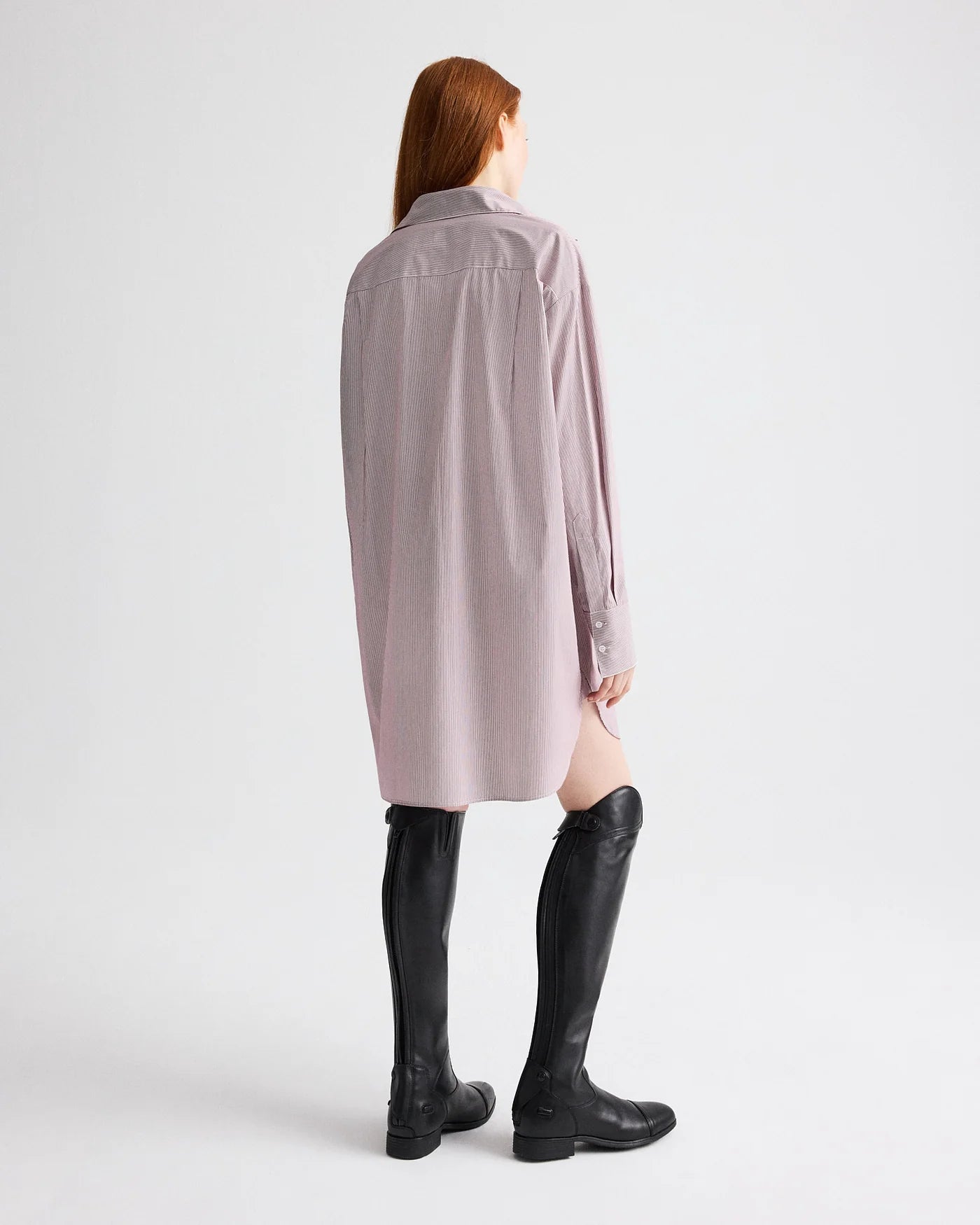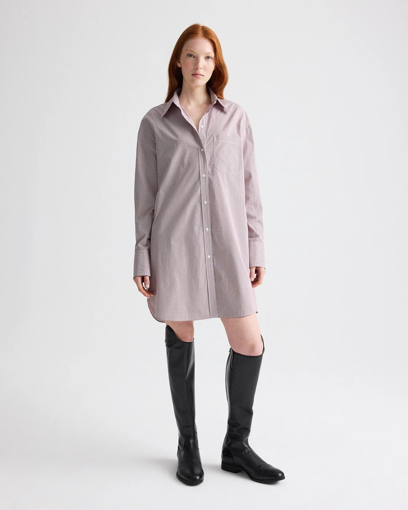 Oversized shirt dress in superfine mini stripe. The Big Joe Shirt Dress is a menswear-inspired, relaxed button-down silhouette. Finished with a chest patch pocket, button-front placket, French cuffs, and a tulip hem.