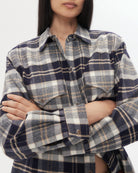 Oversized, western inspired work shirt in cotton flannel. Fabric is 100% cotton plaid with a 3-ply weave for softness, drape, and a cashmere-flannel finish. Utility details: chest flap pockets, a snap button placket and front yoke. Complete with button cuffs and contrast stitching at the seams.