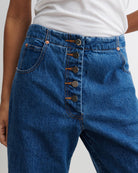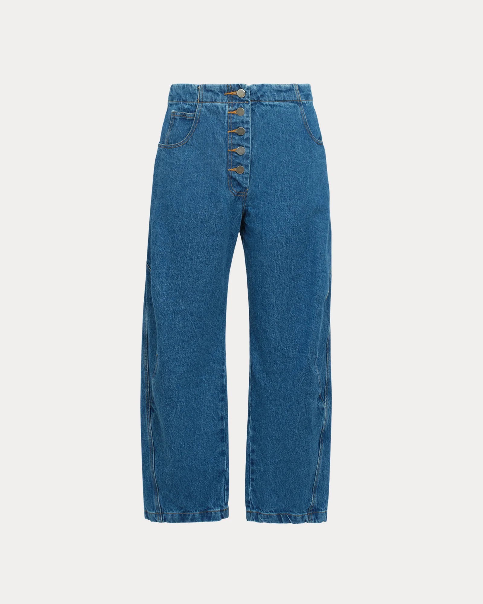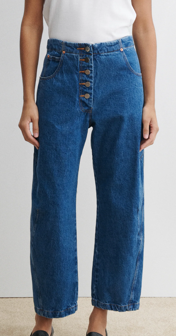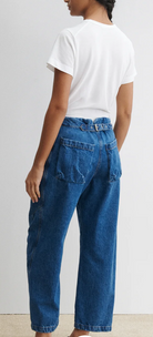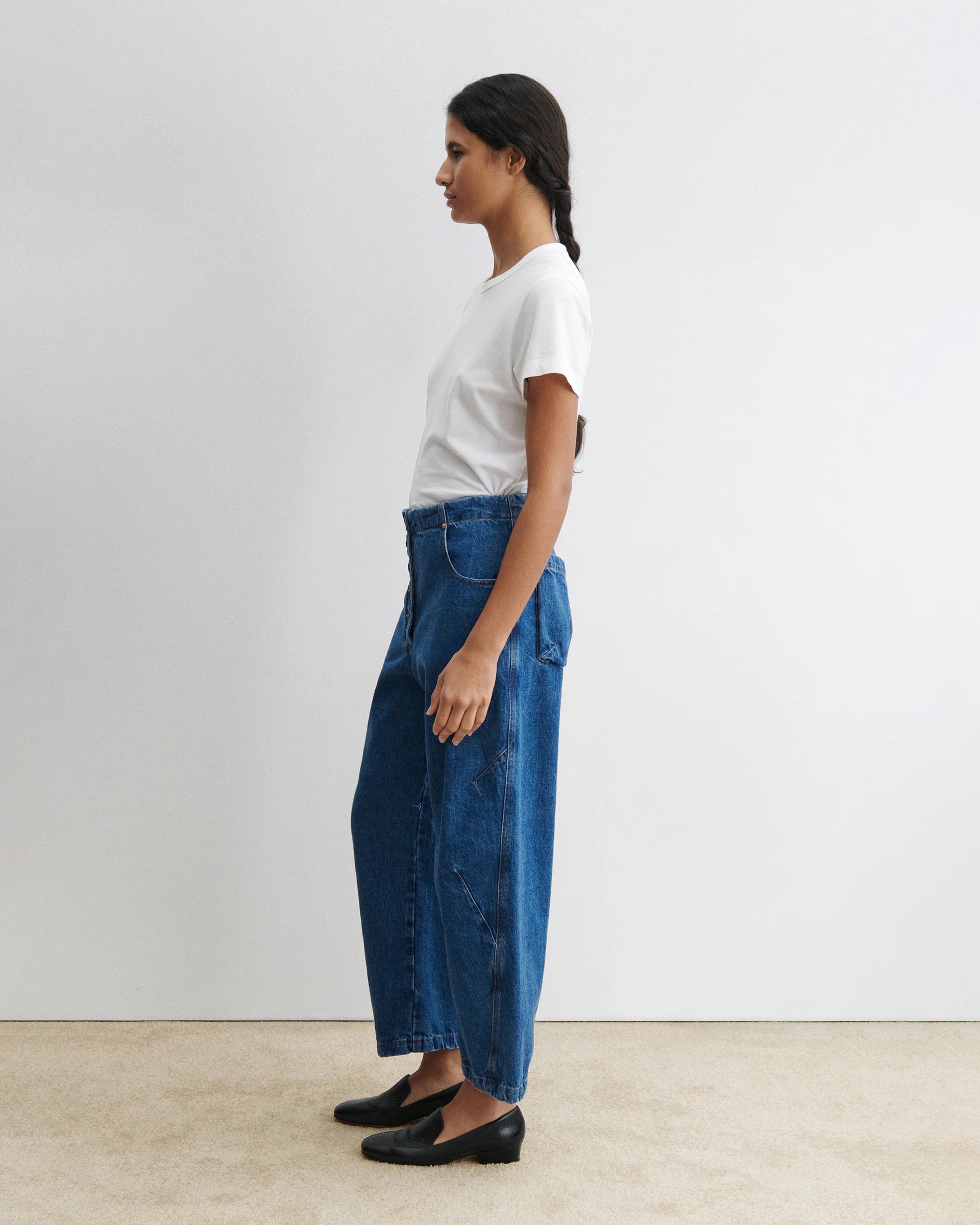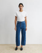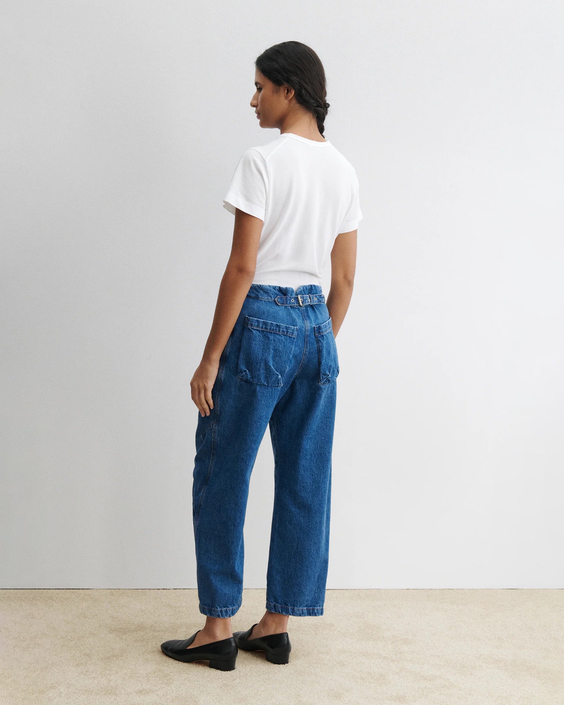 The Elkin Pant, one of our all-time favorites, returns this season in our soft Washed Mission Denim. Designed with an adjustable back buckle tab so you can wear at your preferred waistline -- be it low, hip-level, or cinched at the waist for a tailored silhouette. Angled darts give the leg a subtle cocoon shape, culminating in a chic crop.