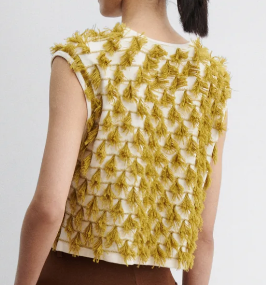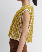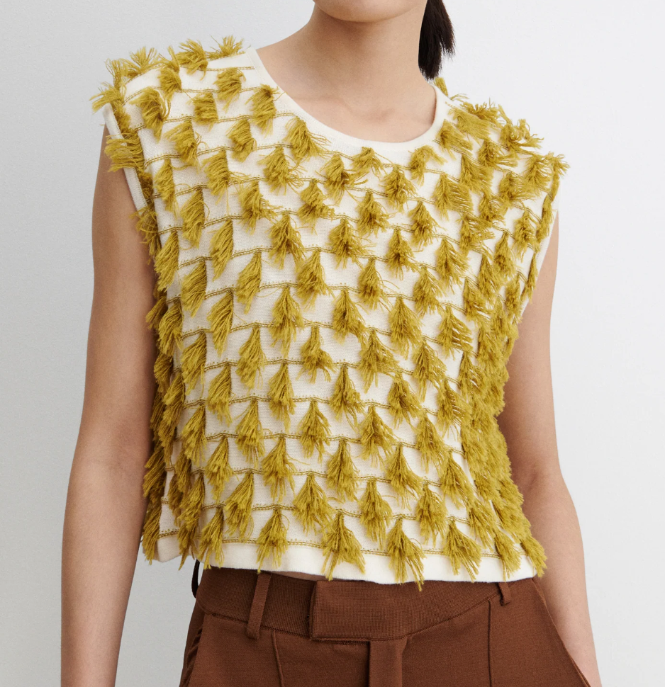 Sleeveless knit top detailed with rows of playful, three-dimensional fringes for movement and tactile interest. Designed with a relaxed, boxy cut and finished with a soft crew neckline.