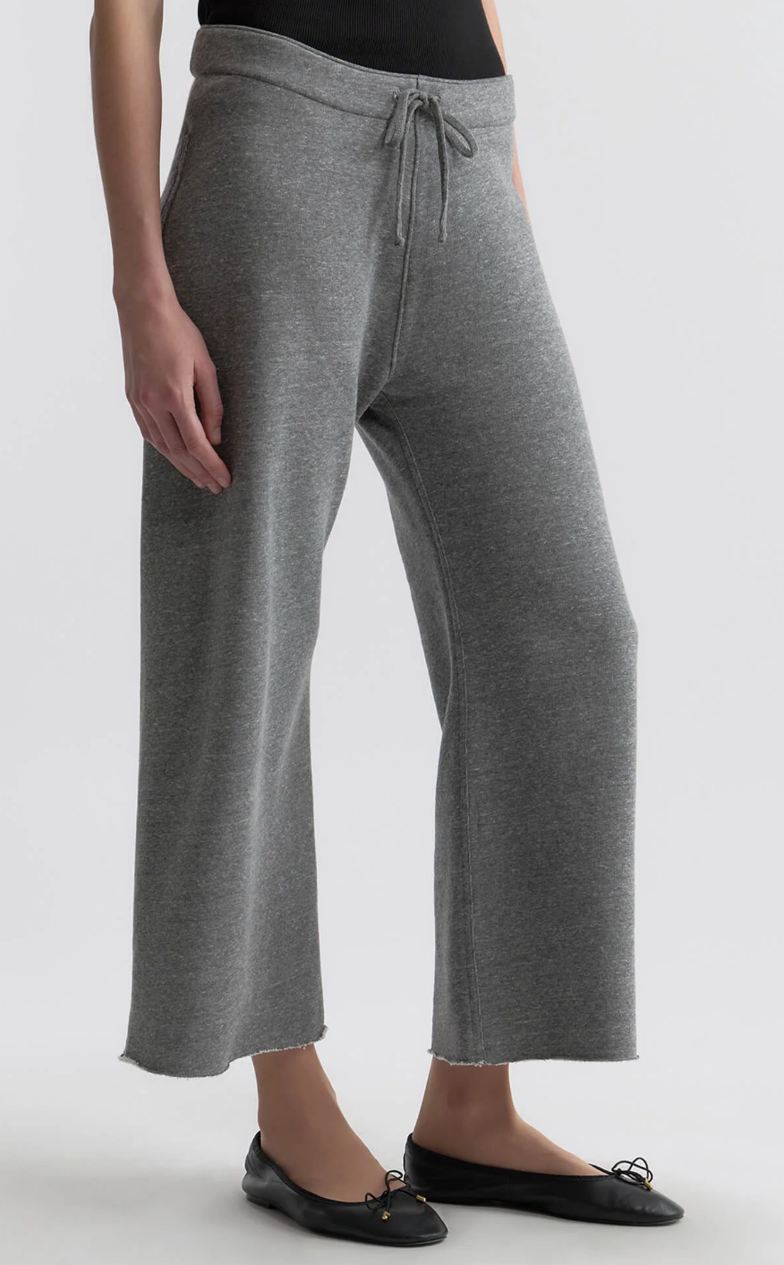 Wide-leg cropped sweatpant in classic French terry. Garment dyed with drawstring waistband, single back pocket in woven fabric combo, and raw-cut hem with subtle roll.