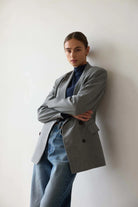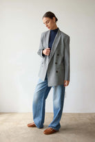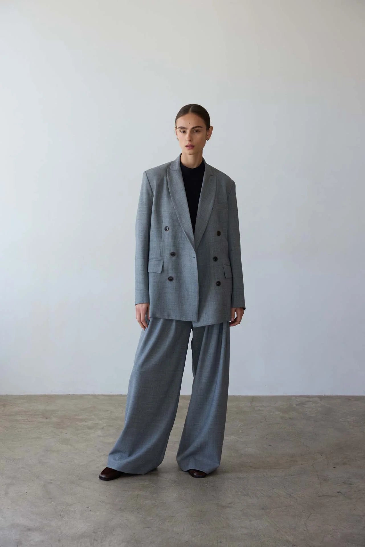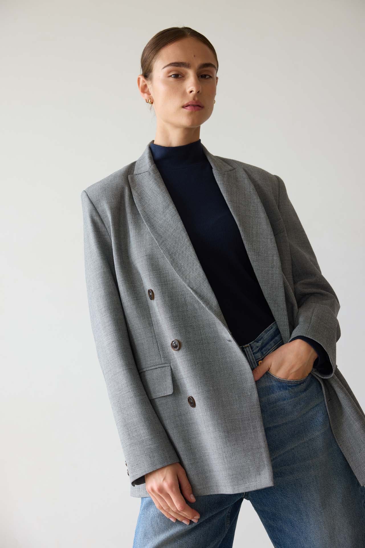 Oversized and chic, the DB blazer is a double breasted mens-inspired blazer. The cut is a little looser and longer with traditional button detailing and contrast lining. Tailored in a soft and drapy Italian suiting. A virgin wool blend with a salt and pepper effect.