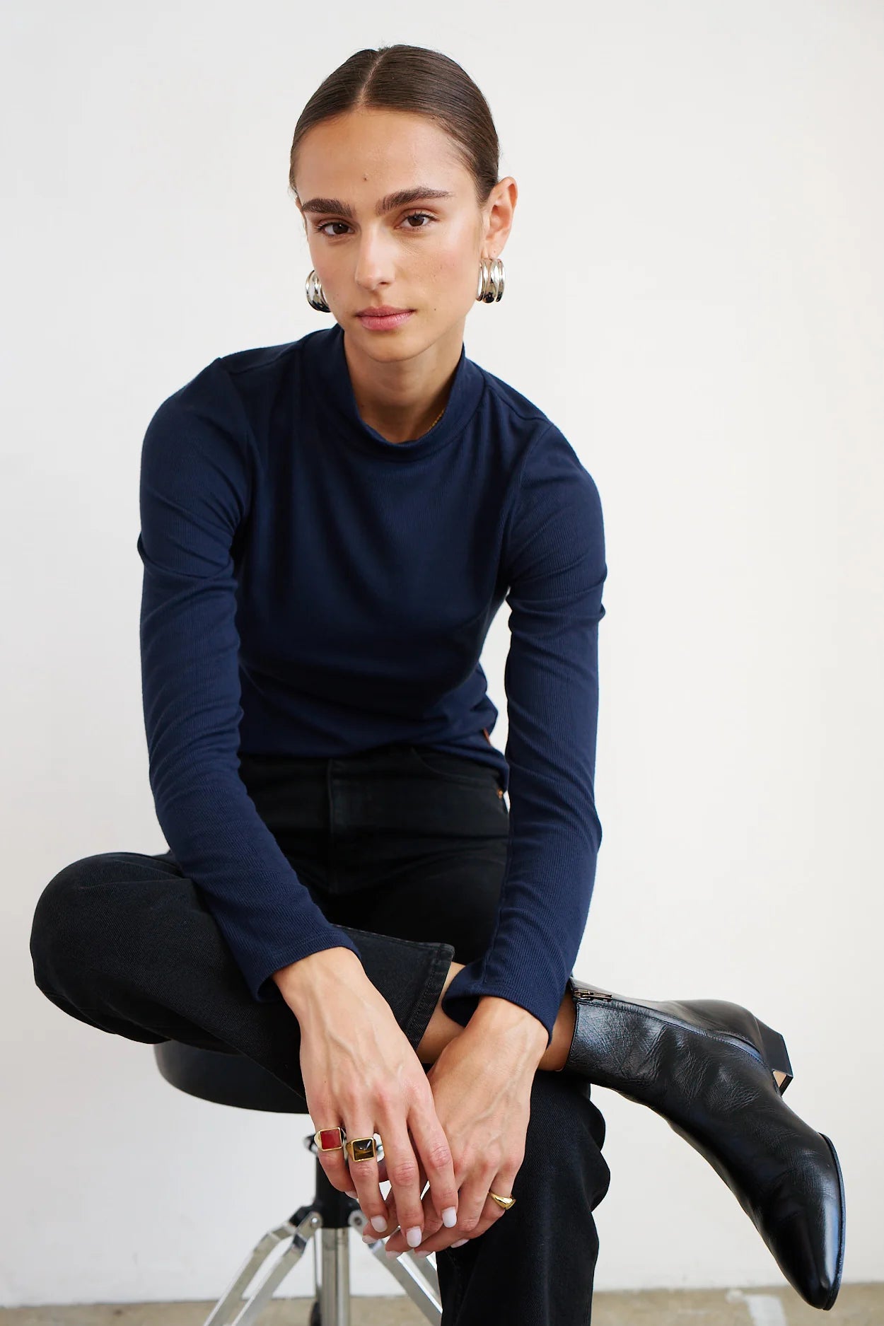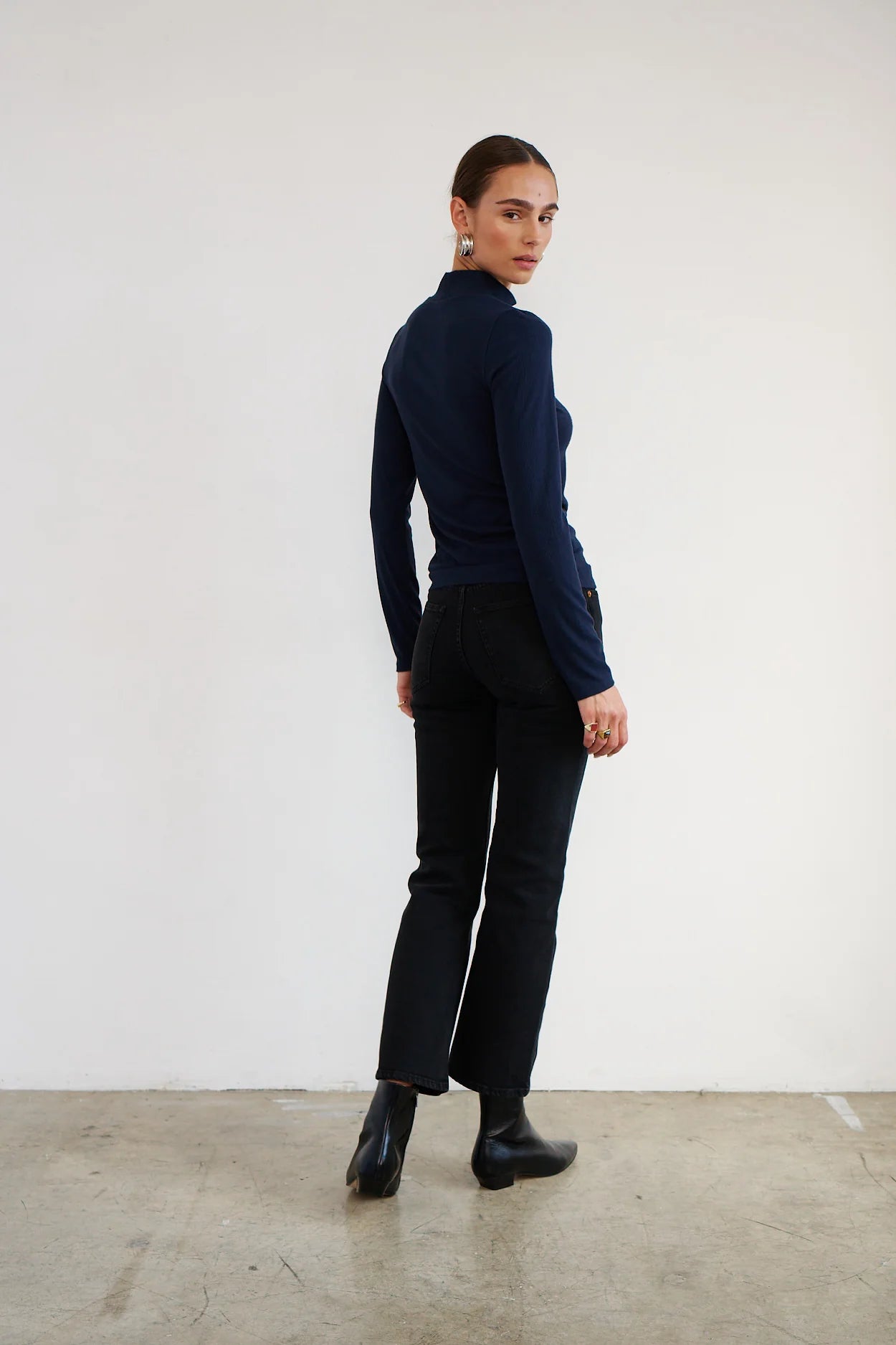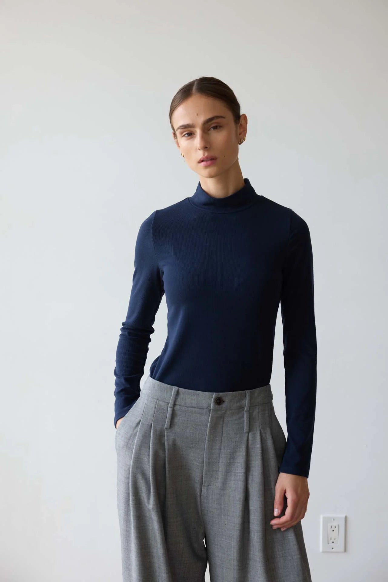A slim fit, rib tee with a folded mock neck rib detail and long slim sleeves. With soft structure, our rib provides ease and form.
