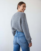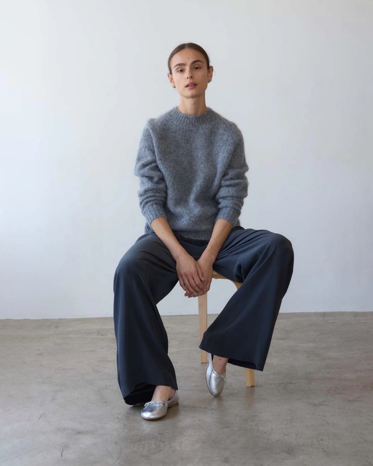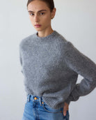 A classic crew with a slight raglan shape at the shoulder. A chunky knit neckline. Knitted in a soft and hairy yarn in a lightweight, chunky stitch.