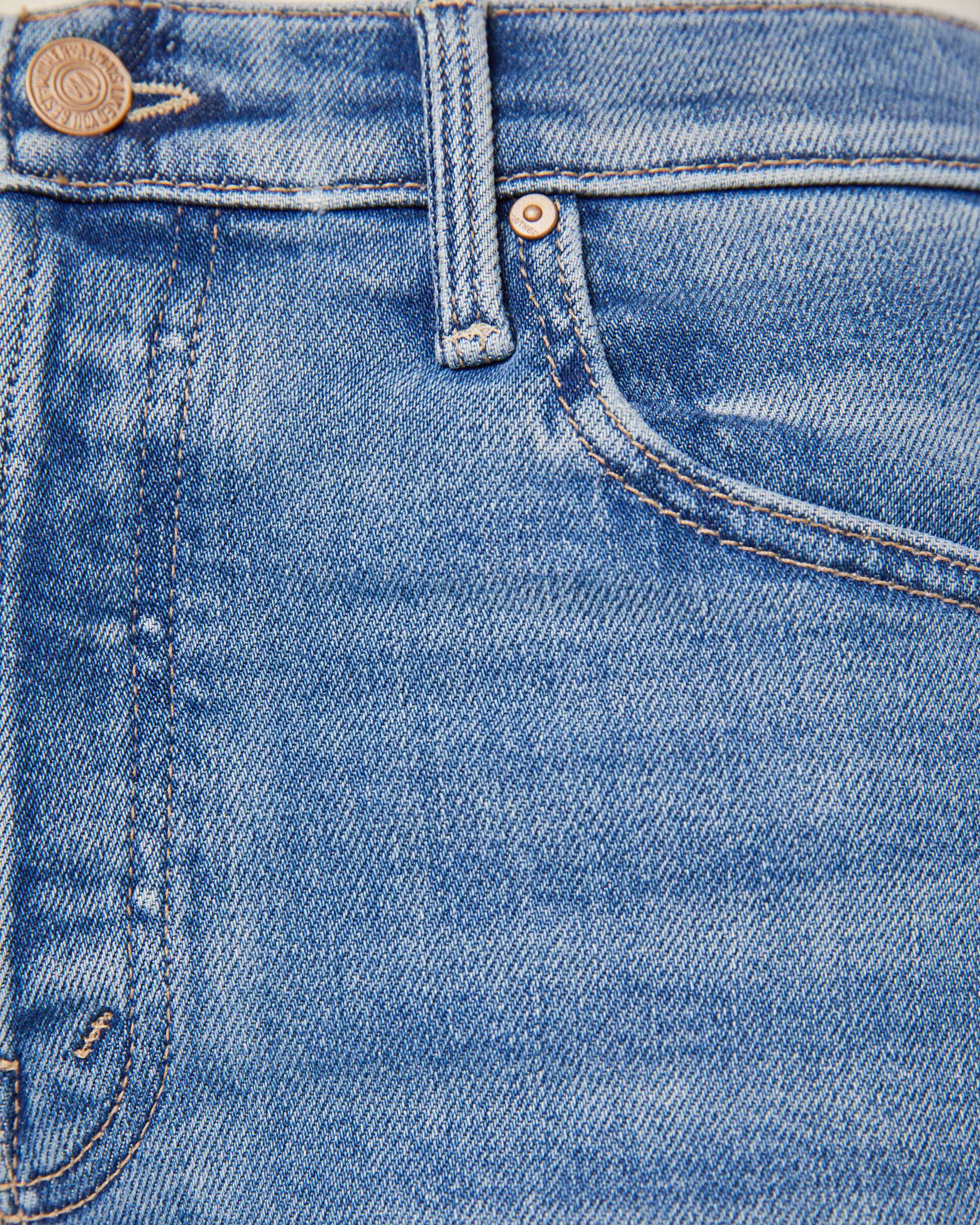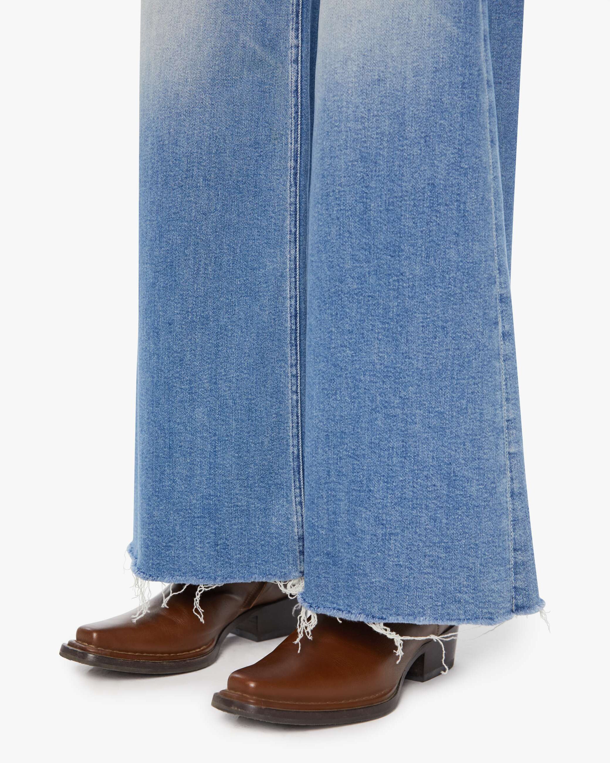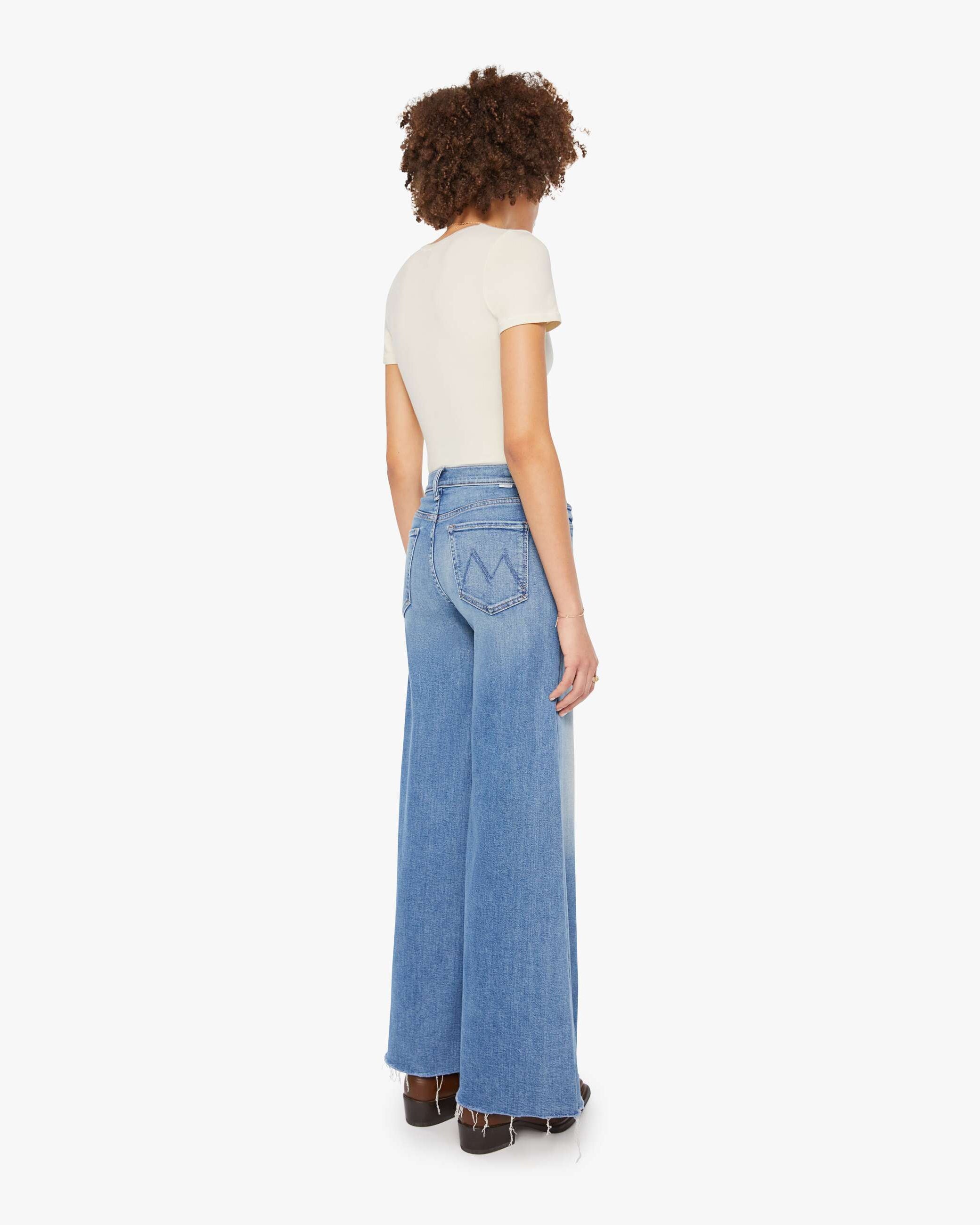 On a roll. High-waisted wide-leg jeans with a button fly, long 32-inch inseam and a frayed hem. Cut from stretch denim, Poppin' Wheelies is a mid-blue with whiskering and fading at the knees.