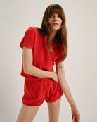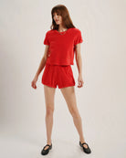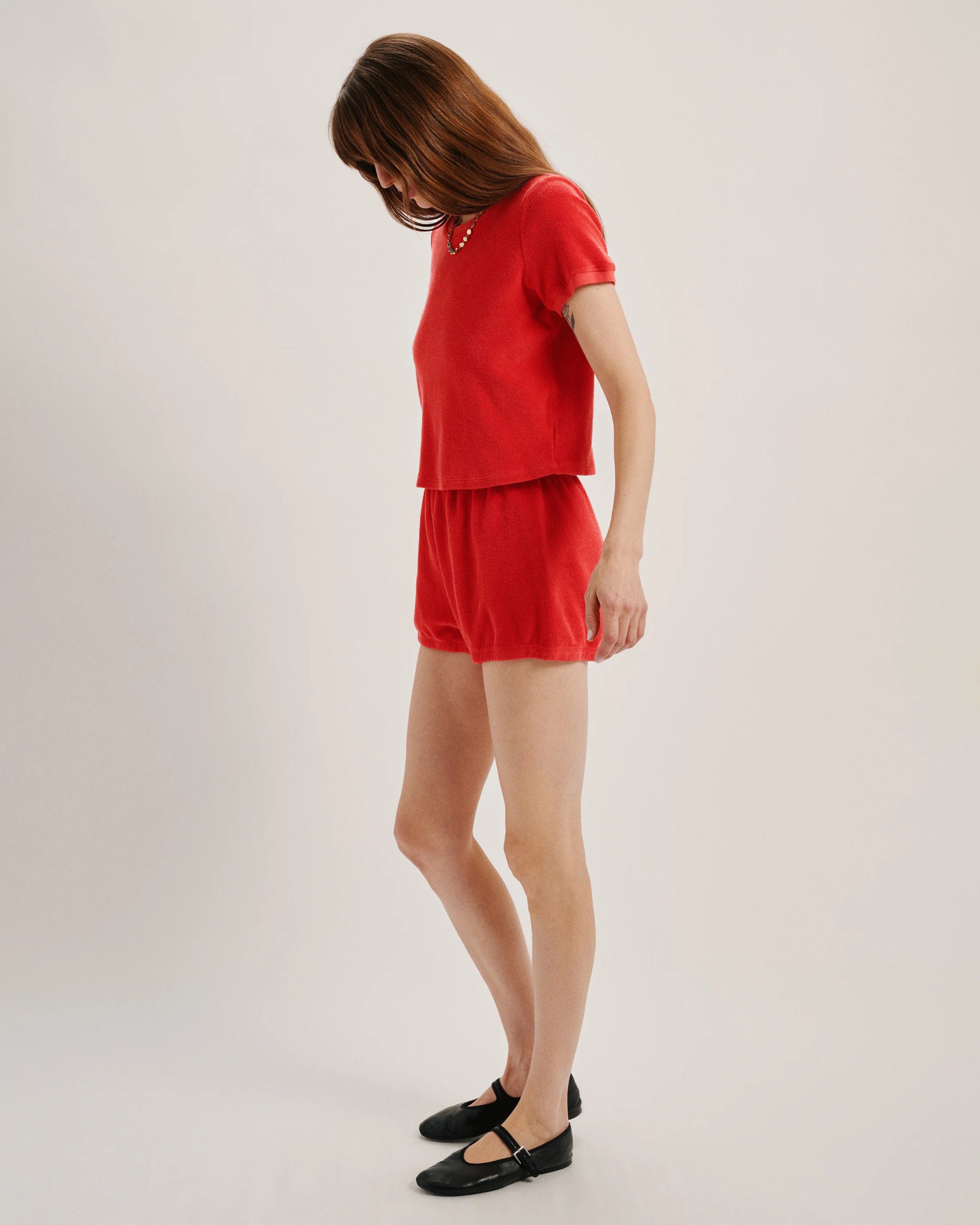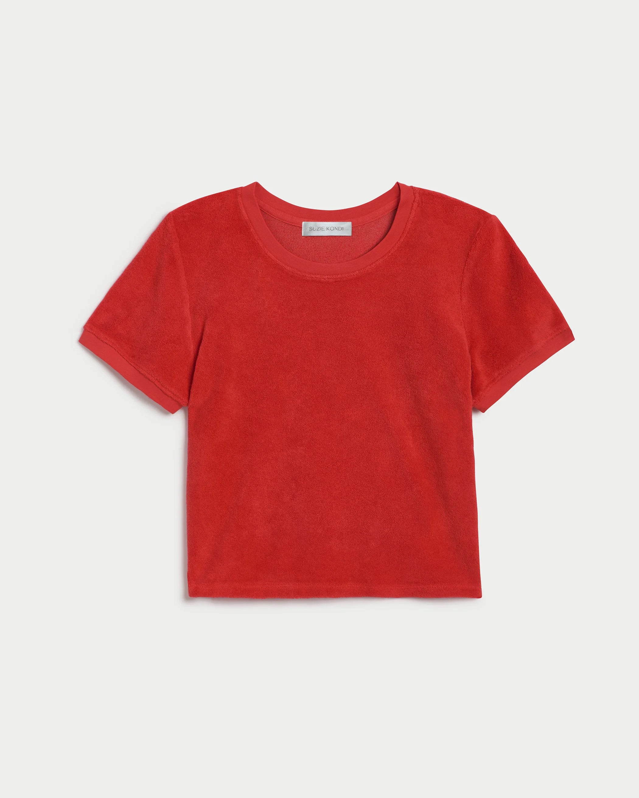 A terry fitted tee, made simple. Cropped at the waist with a gentle scoop neckline and rib-trimmed short sleeves for a sleek, streamlined silhouette.
