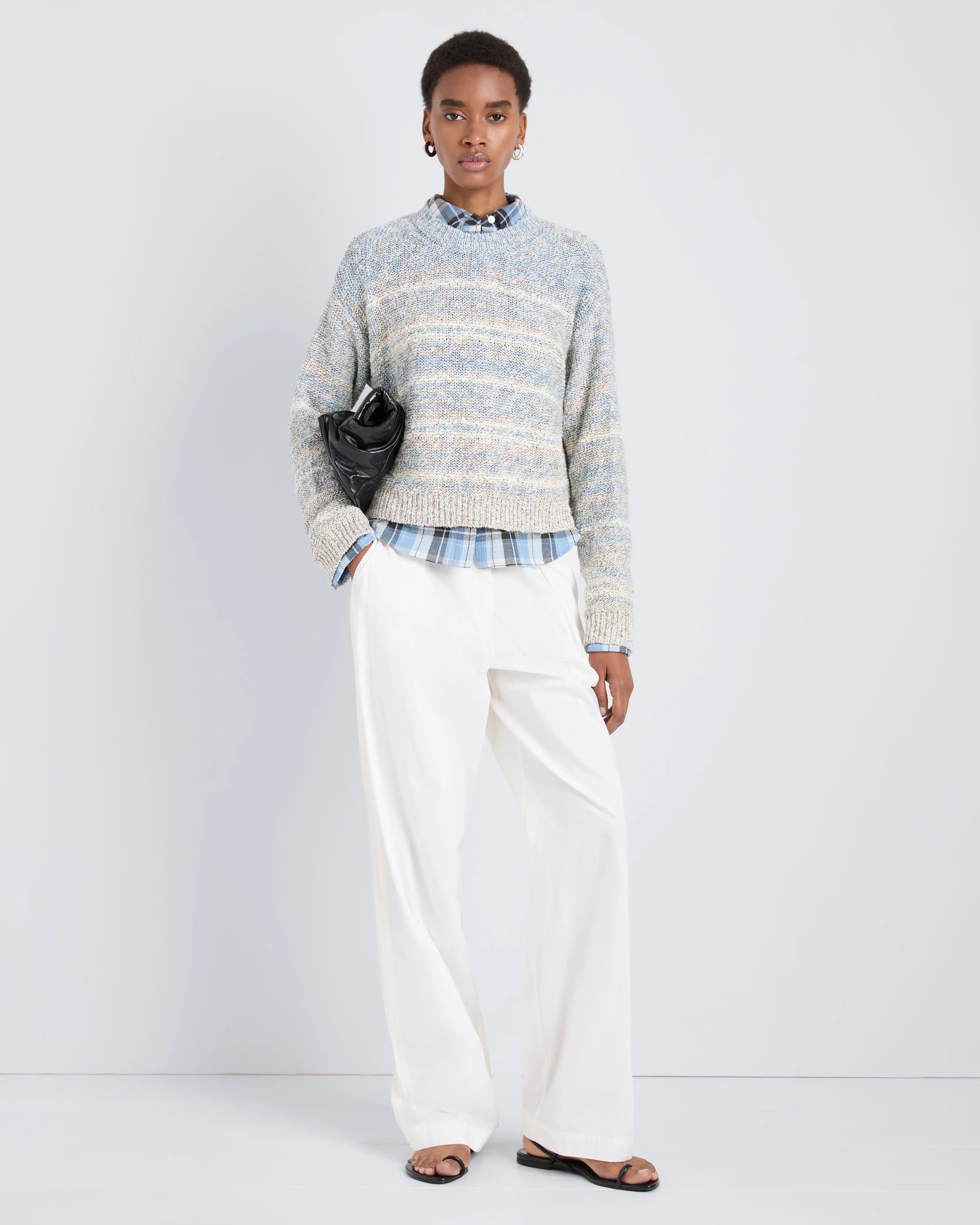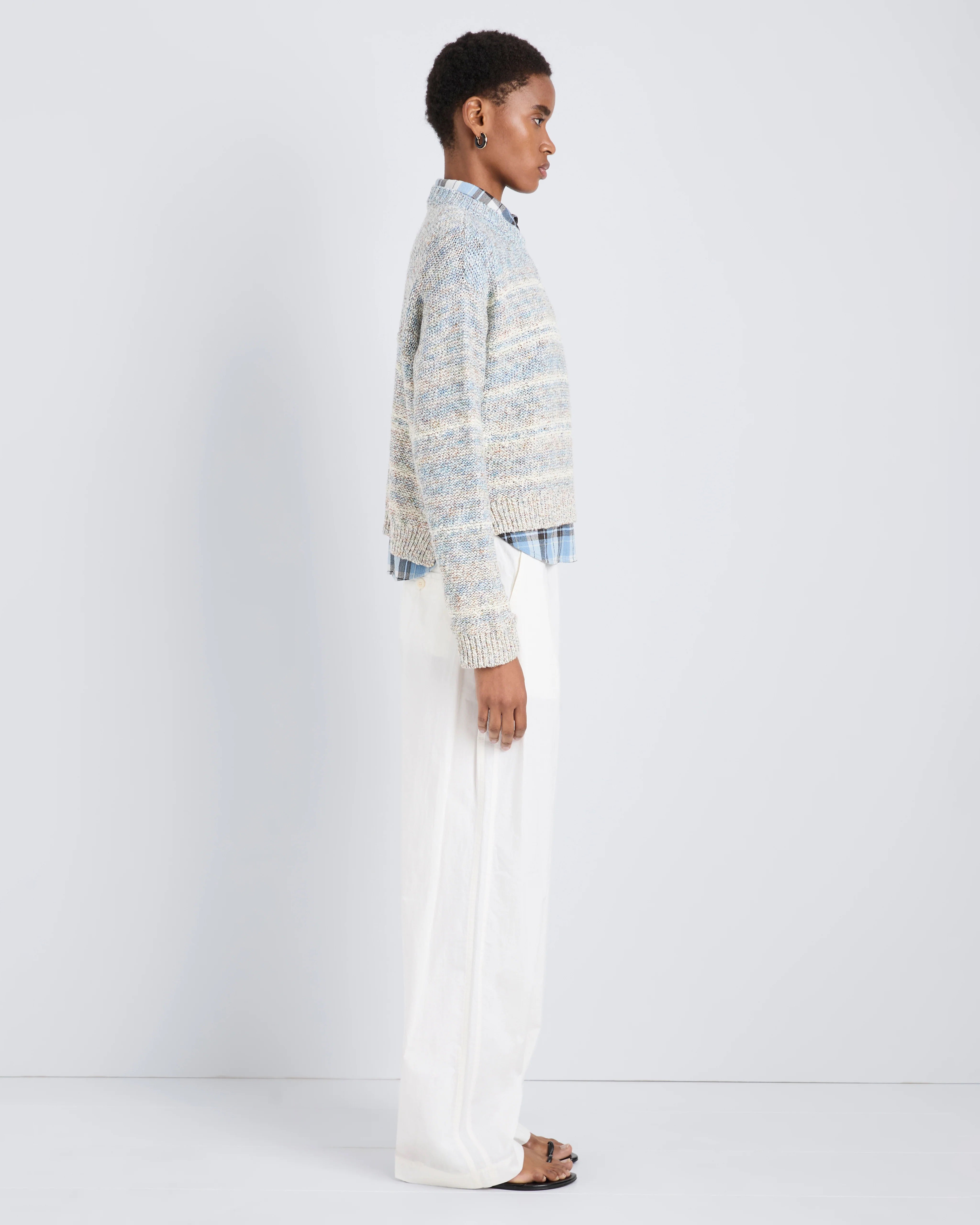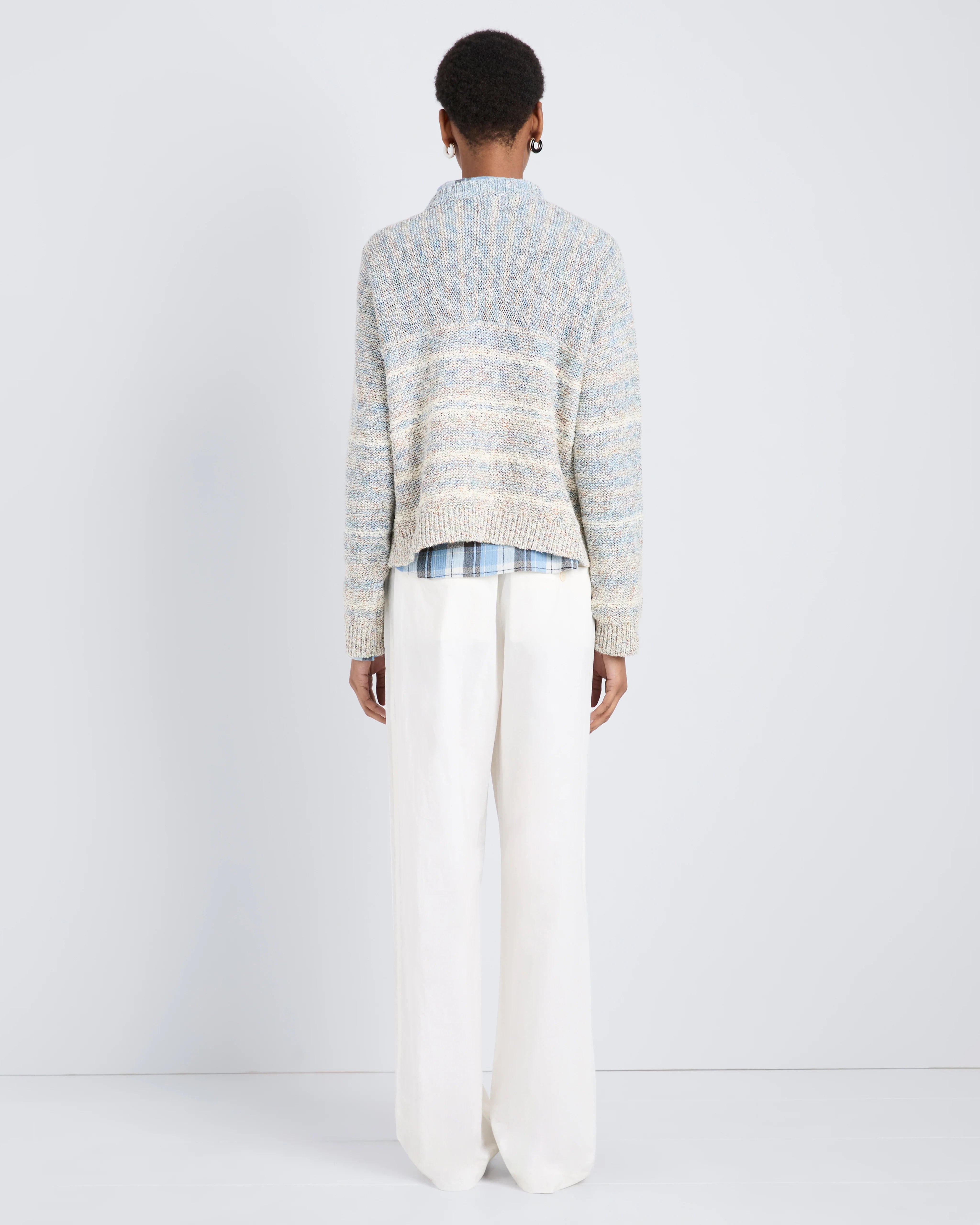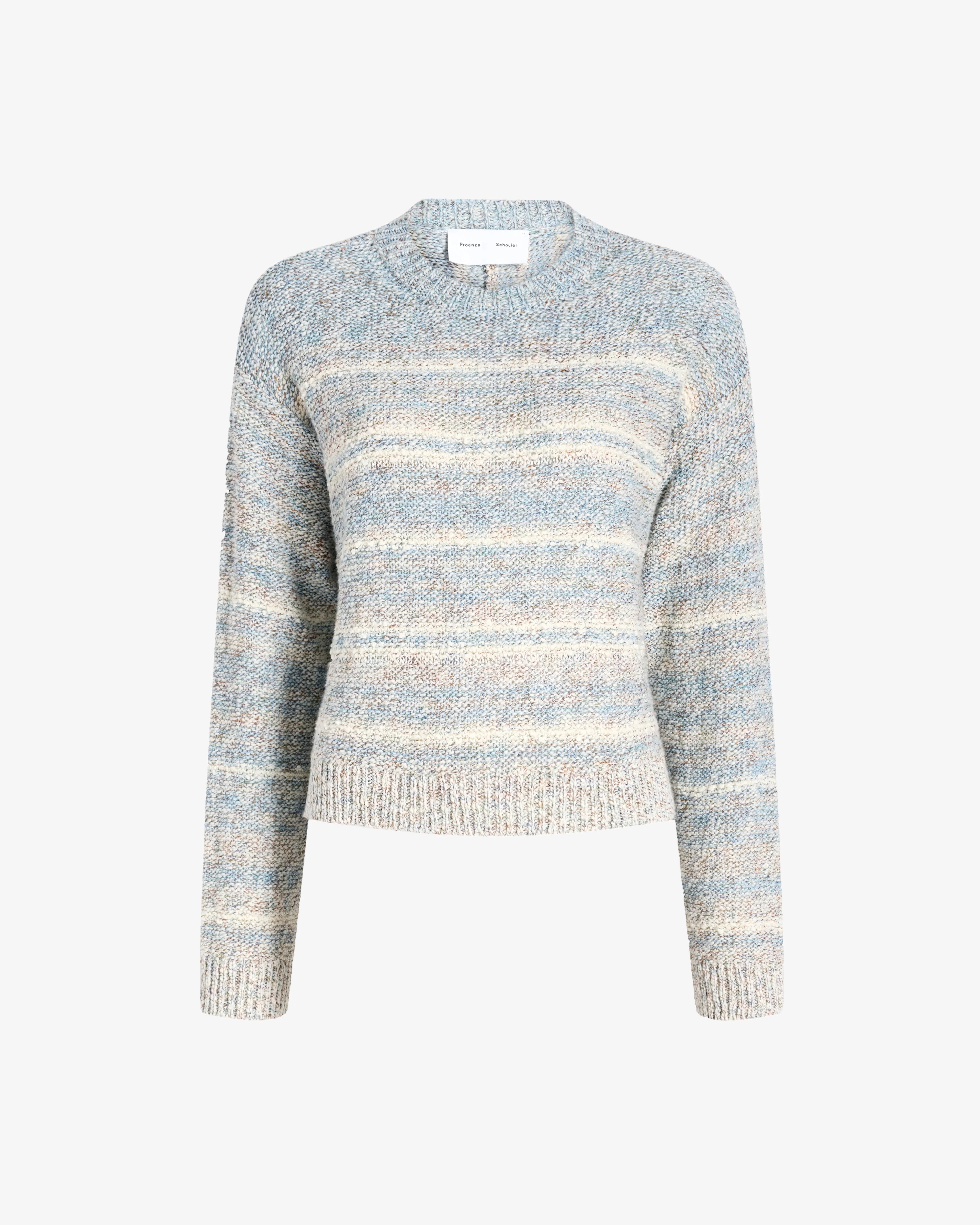 The Ivara Sweater in Space Dye is crafted from thick, textured knit in a relaxed, cropped silhouette with dropped shoulders, a rounded crew neckline, and ribbed trims.