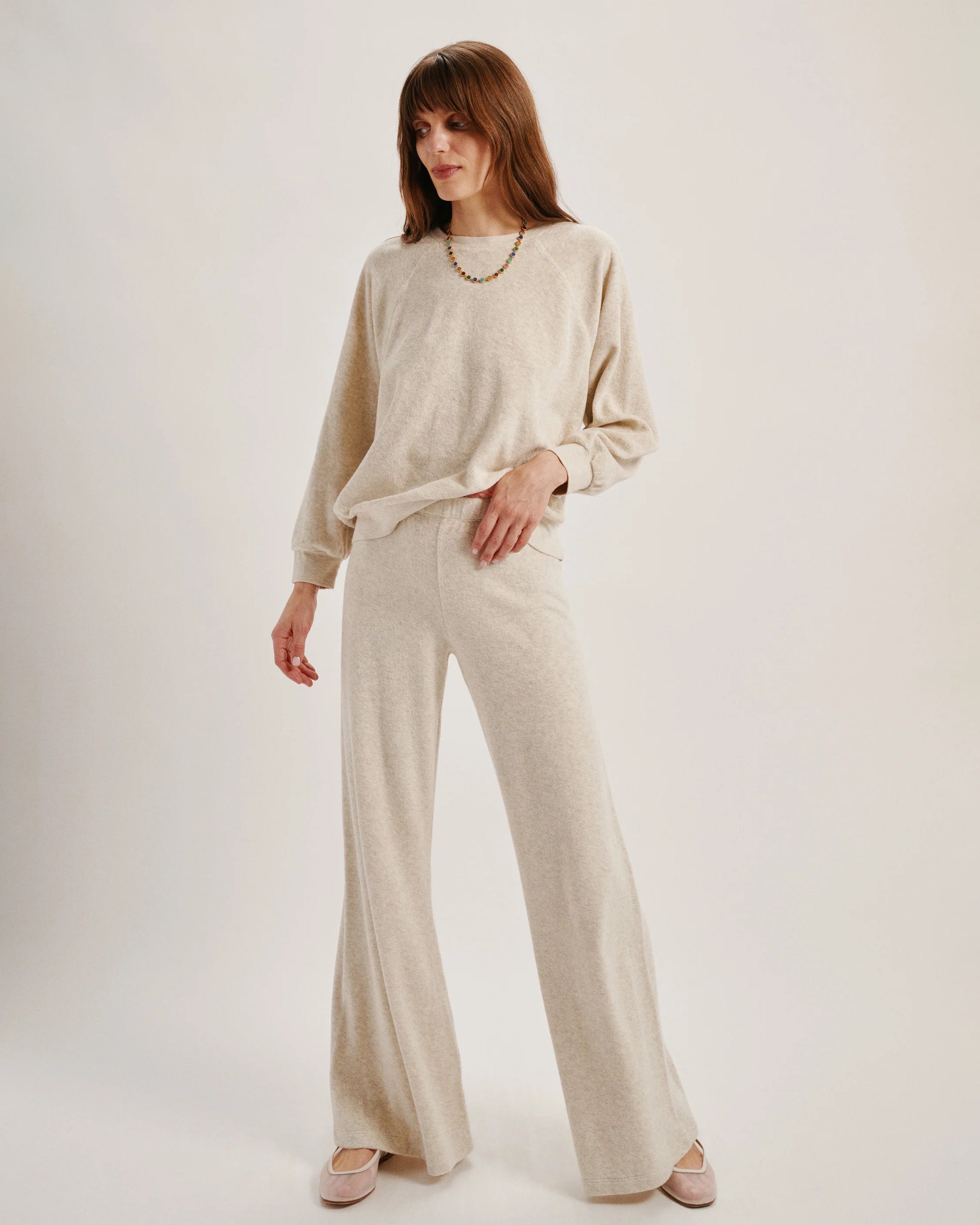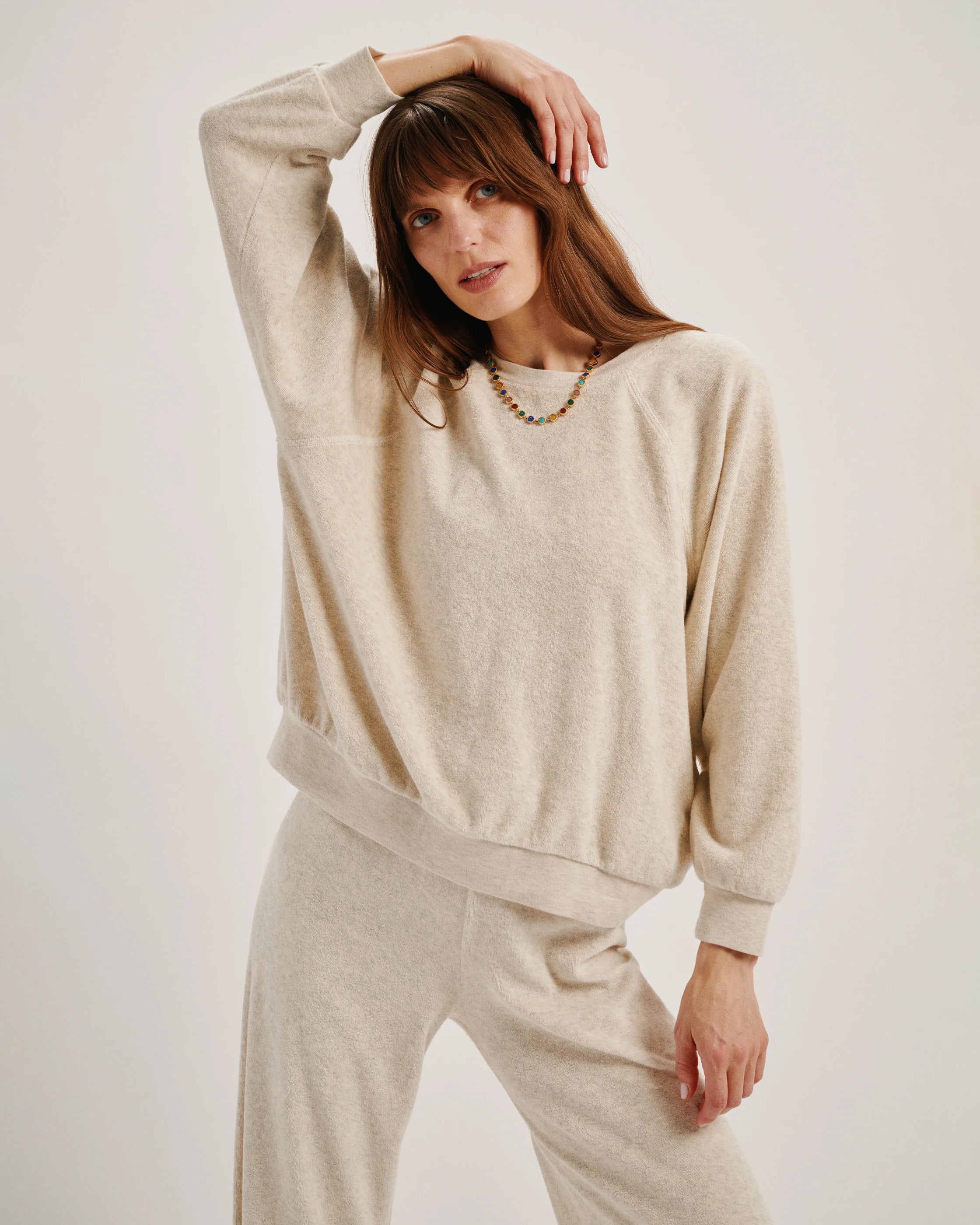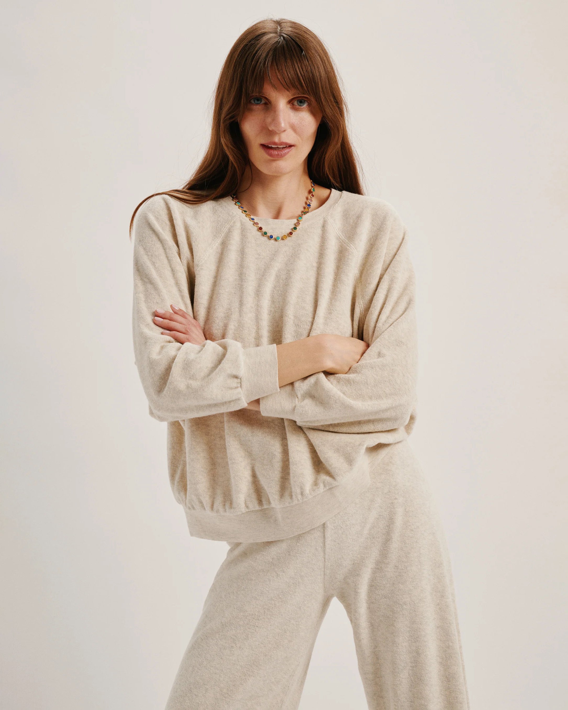A relaxed fit, perfect for travel. Silhouette-draping form and design, generous fit, and softly ribbed comfy sleeves.
