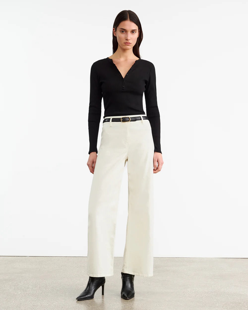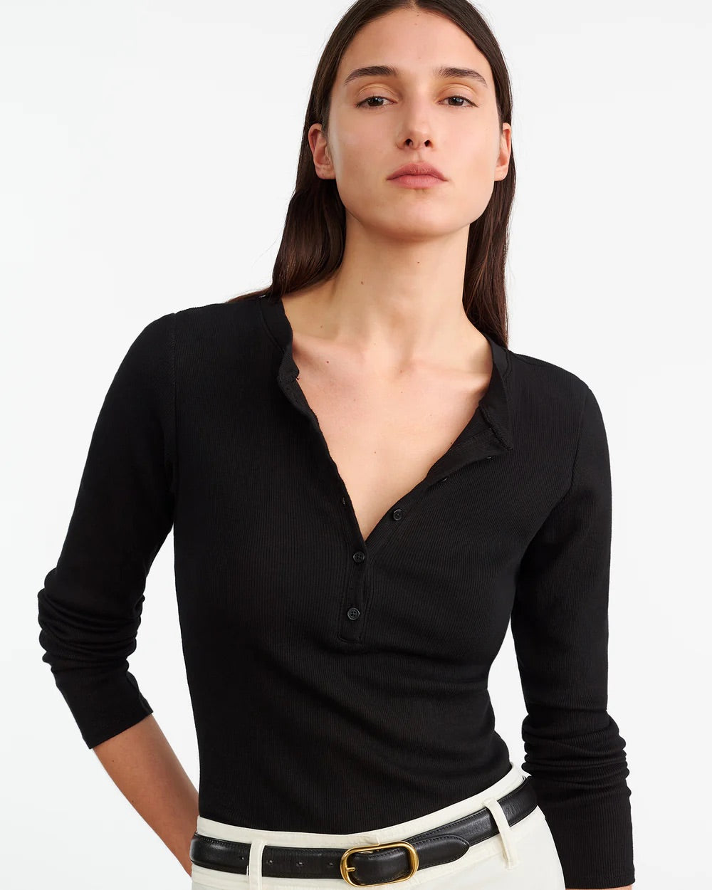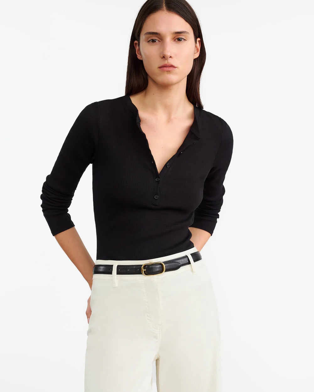 Slim rib long sleeve henley tee in cotton. Five center front buttons. Neck and placket finished with self trim.