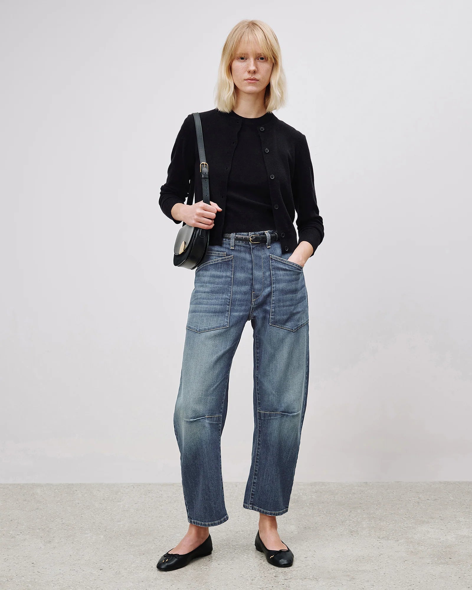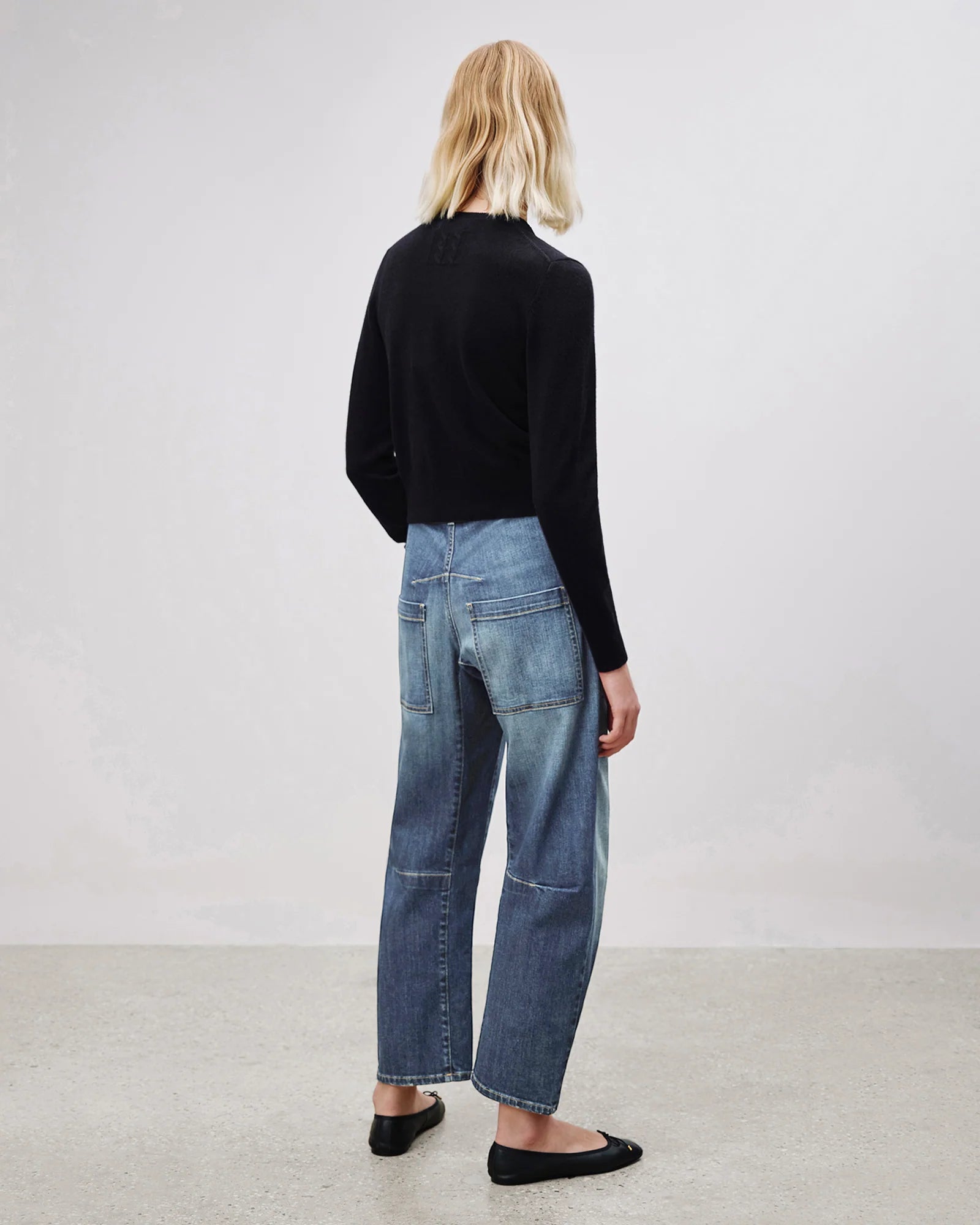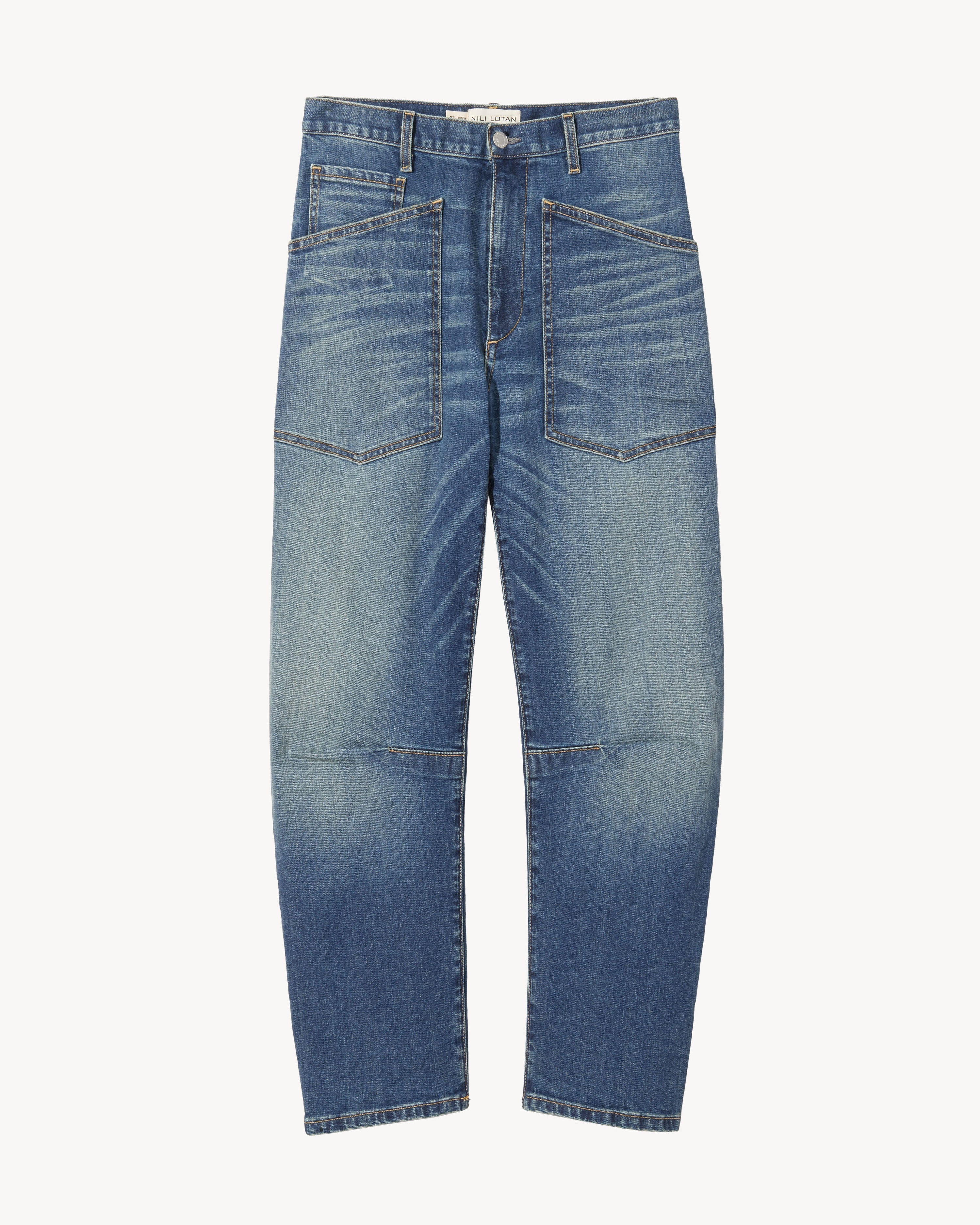 Mid-rise, relaxed fit jean in Japanese stretch denim. Uniquely curved silhouette. Seam detail at knees. Gusset at inseam. Zip fly. Shank closure. Top-stitched front and back patch pockets. Belt loops.