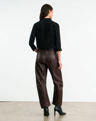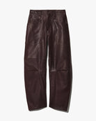 Mid-rise, relaxed fit pant in Italian lambskin leather. Uniquely curved silhouette. Seam detail at knees. Gusset at inseam. Zip fly. Shank closure. Top-stitched front and back patch pockets. Belt loops. Fully lined.