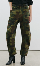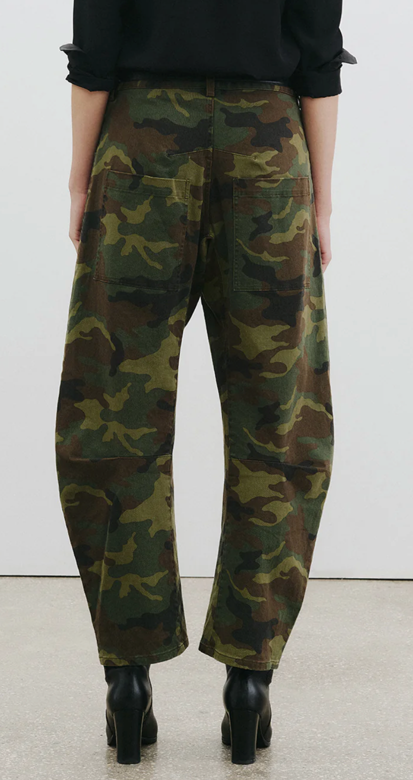 Mid-rise, relaxed fit barrel leg pant. Uniquely curved silhouette. Seam detail at knees. Gusset at inseam. Zip fly. Hidden hook-and-bar closure. Hidden stay button closure. Top-stitched front and back patch pockets. Belt loops.