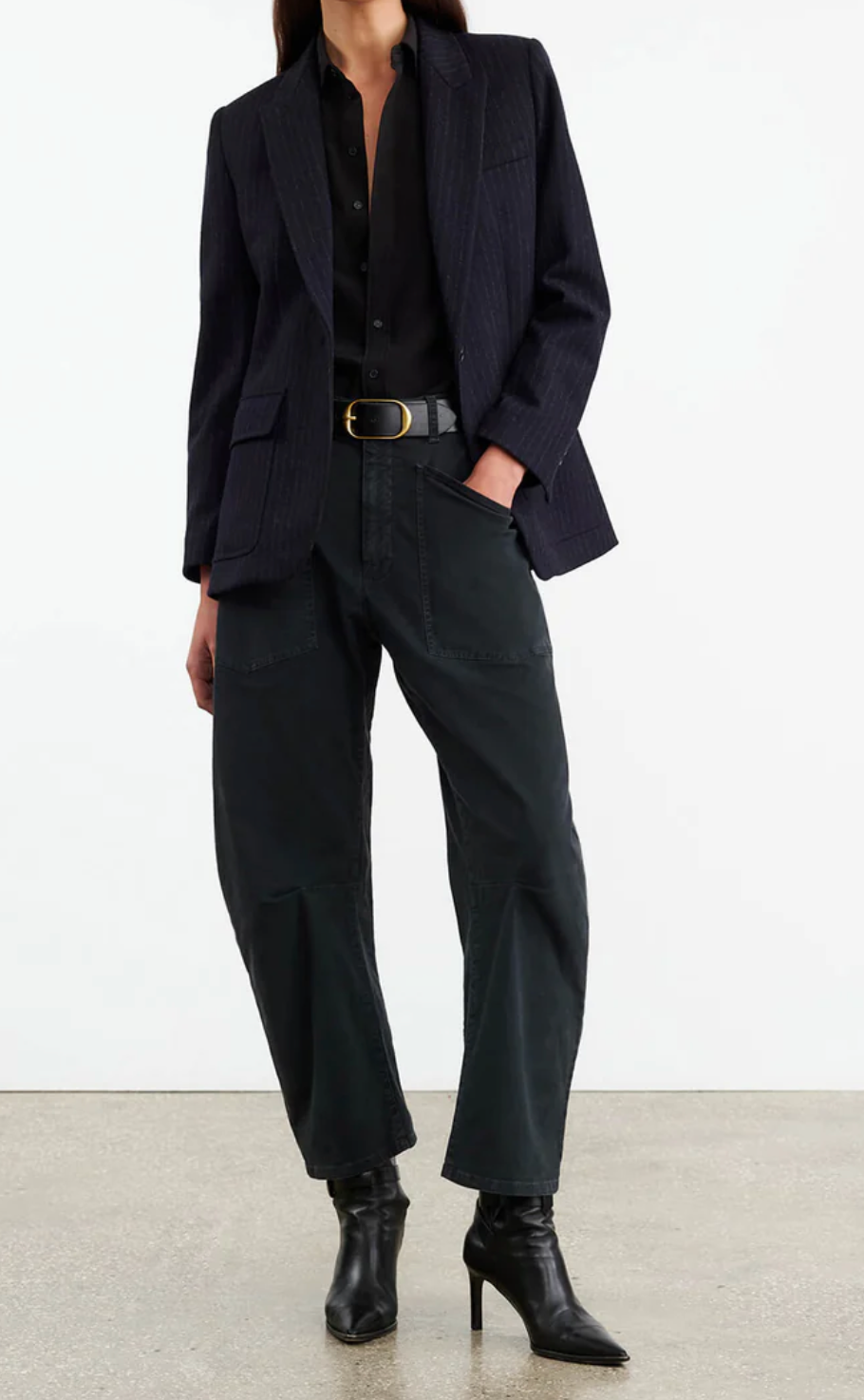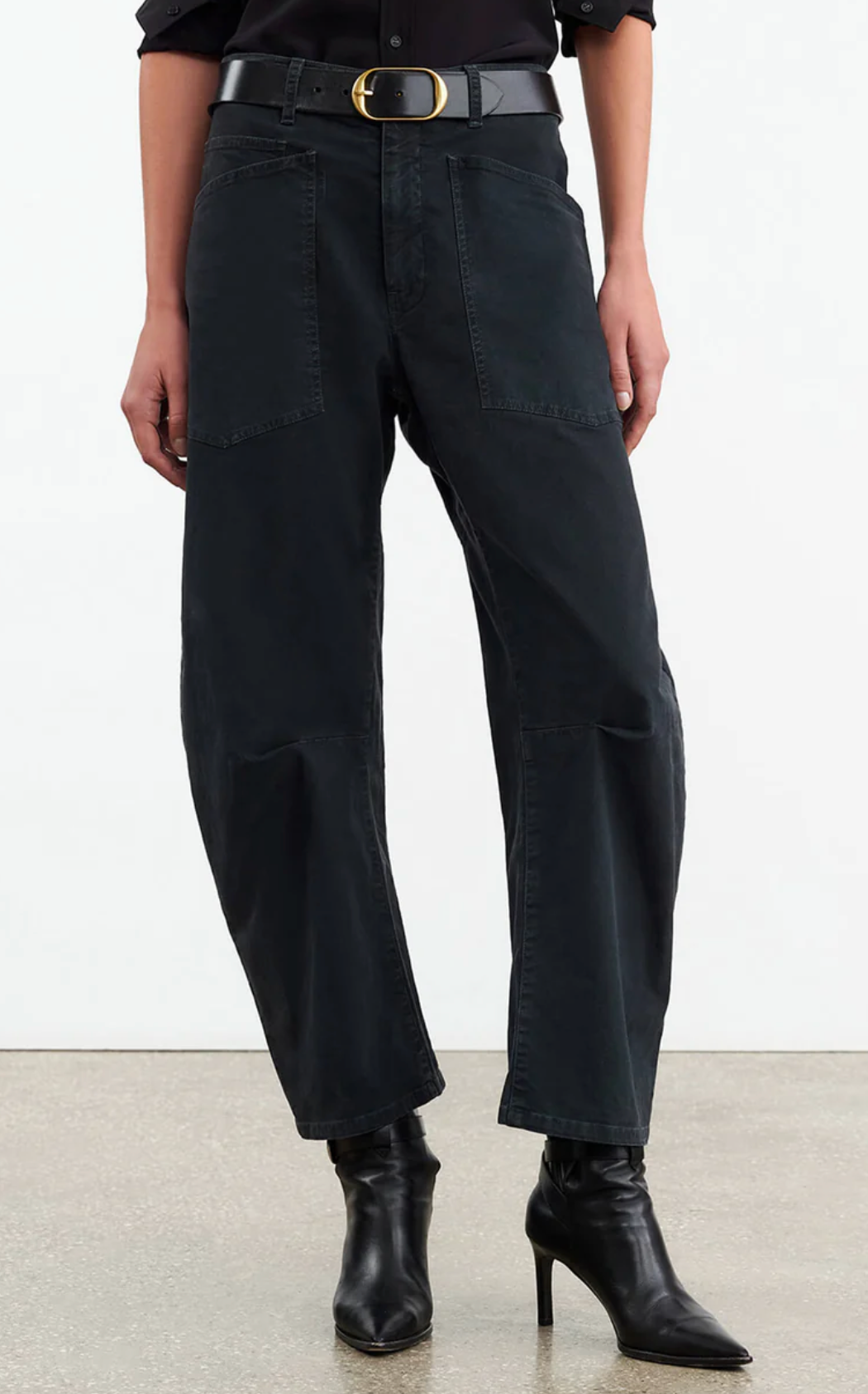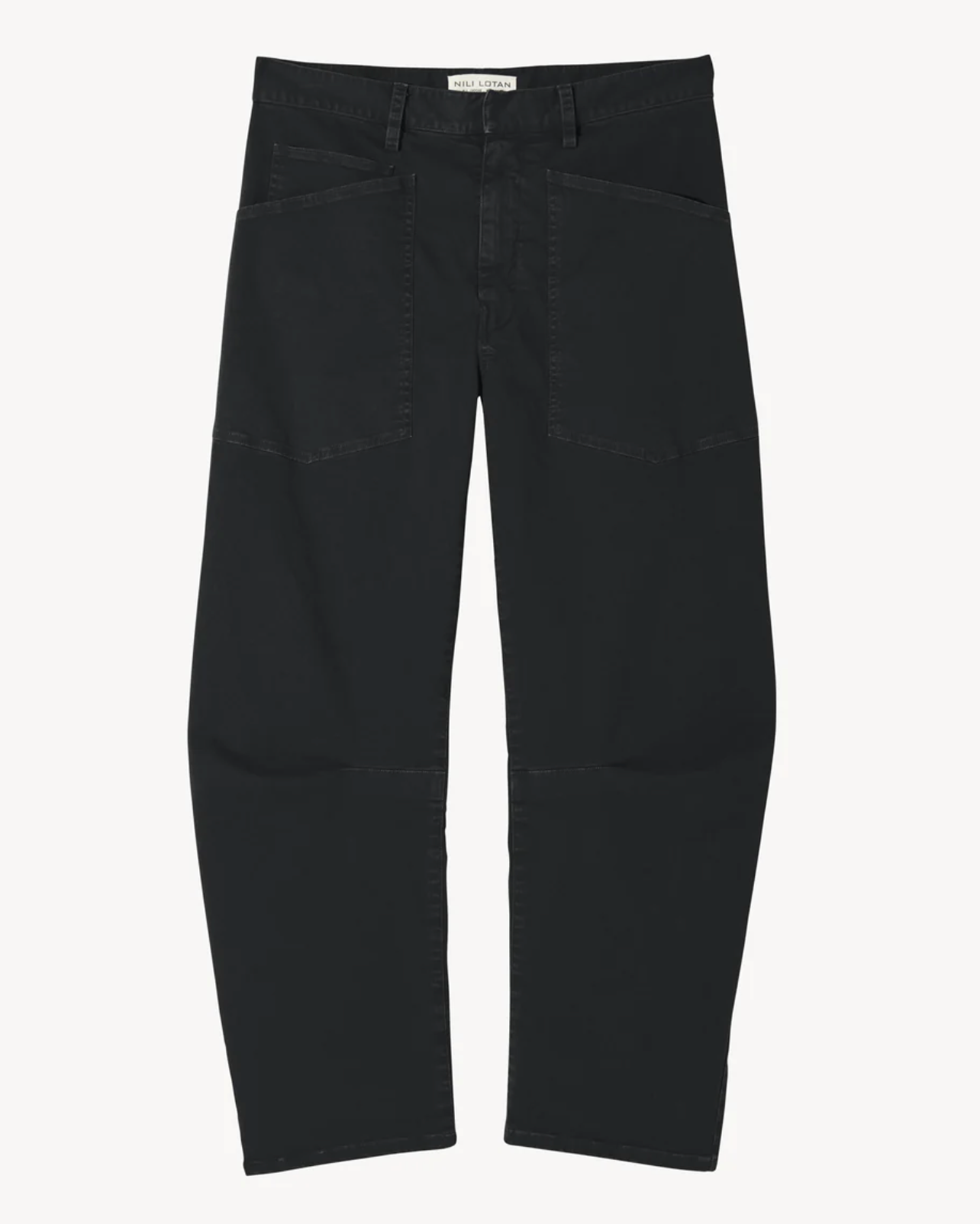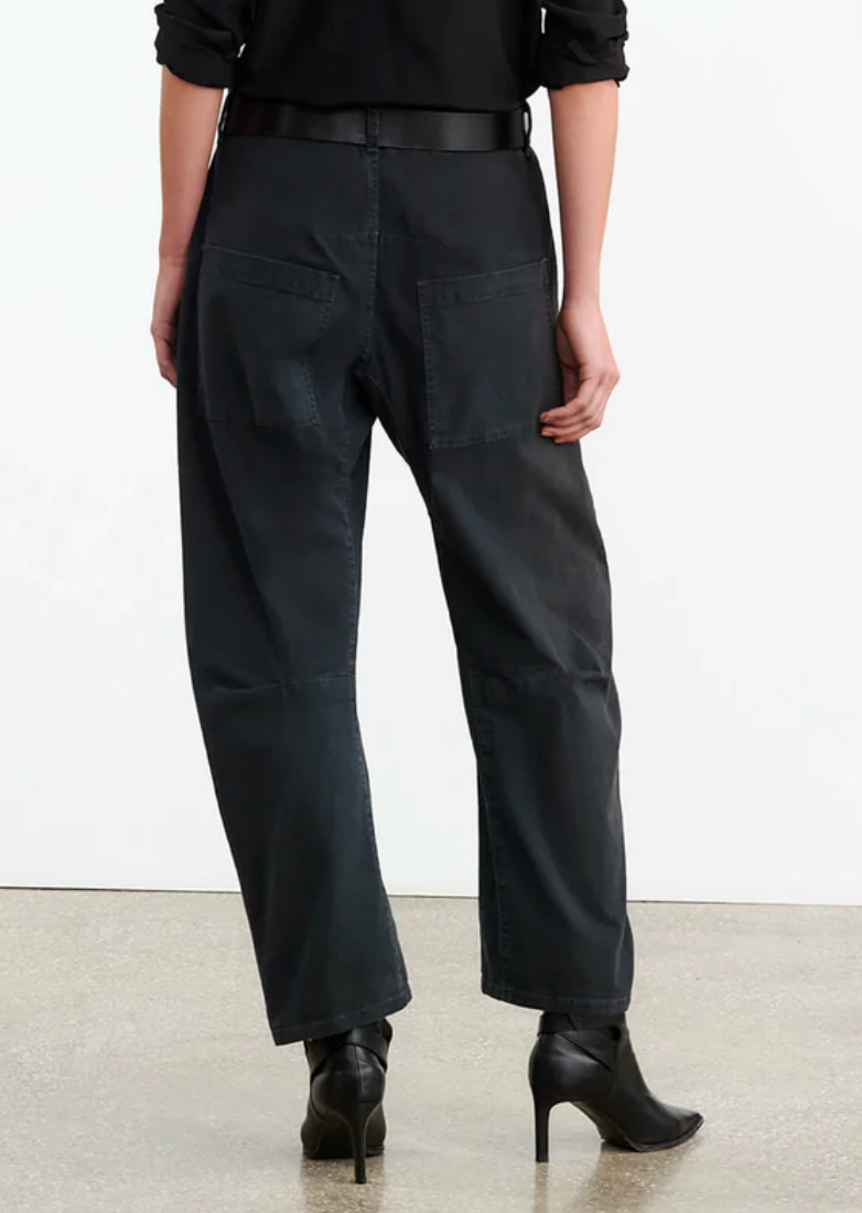 Mid-rise, relaxed fit pant in brushed stretch twill cotton. Uniquely curved silhouette. Seam detail at knees. Gusset at inseam. Zip fly. Hidden hook-and-bar closure. Hidden stay button closure. Top-stitched front and back patch pockets. Belt loops.