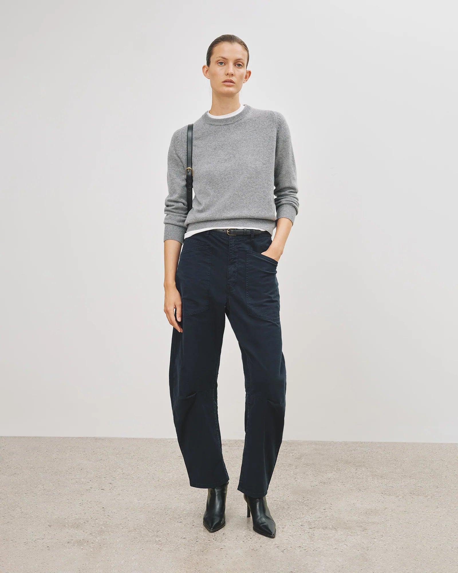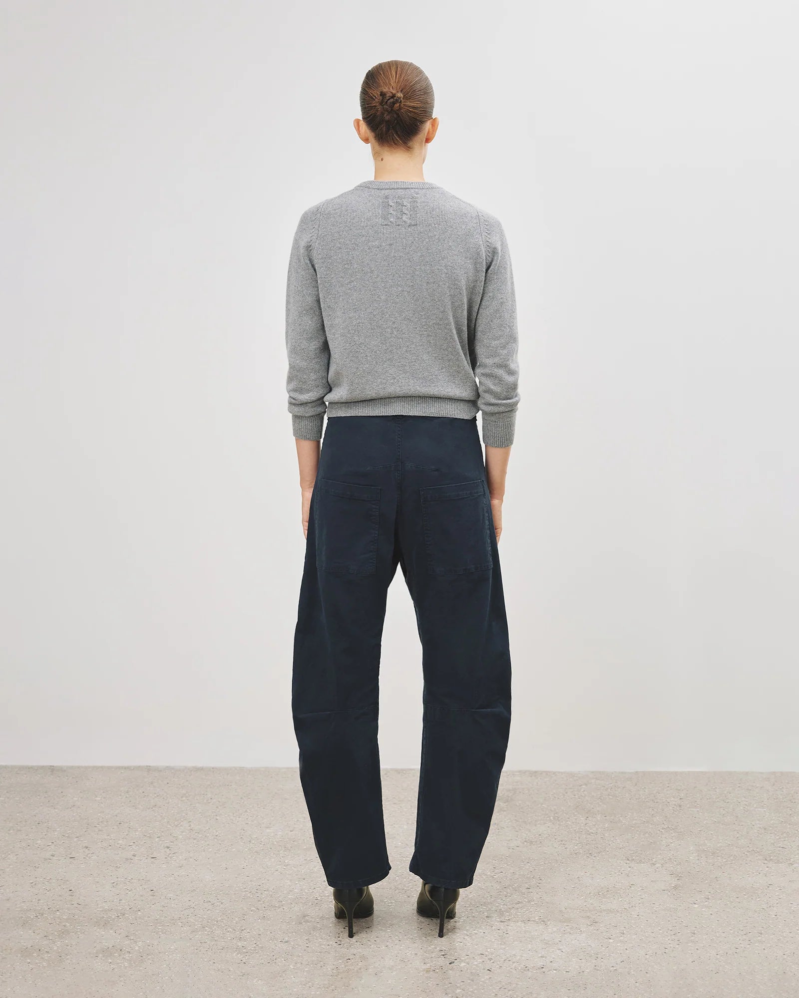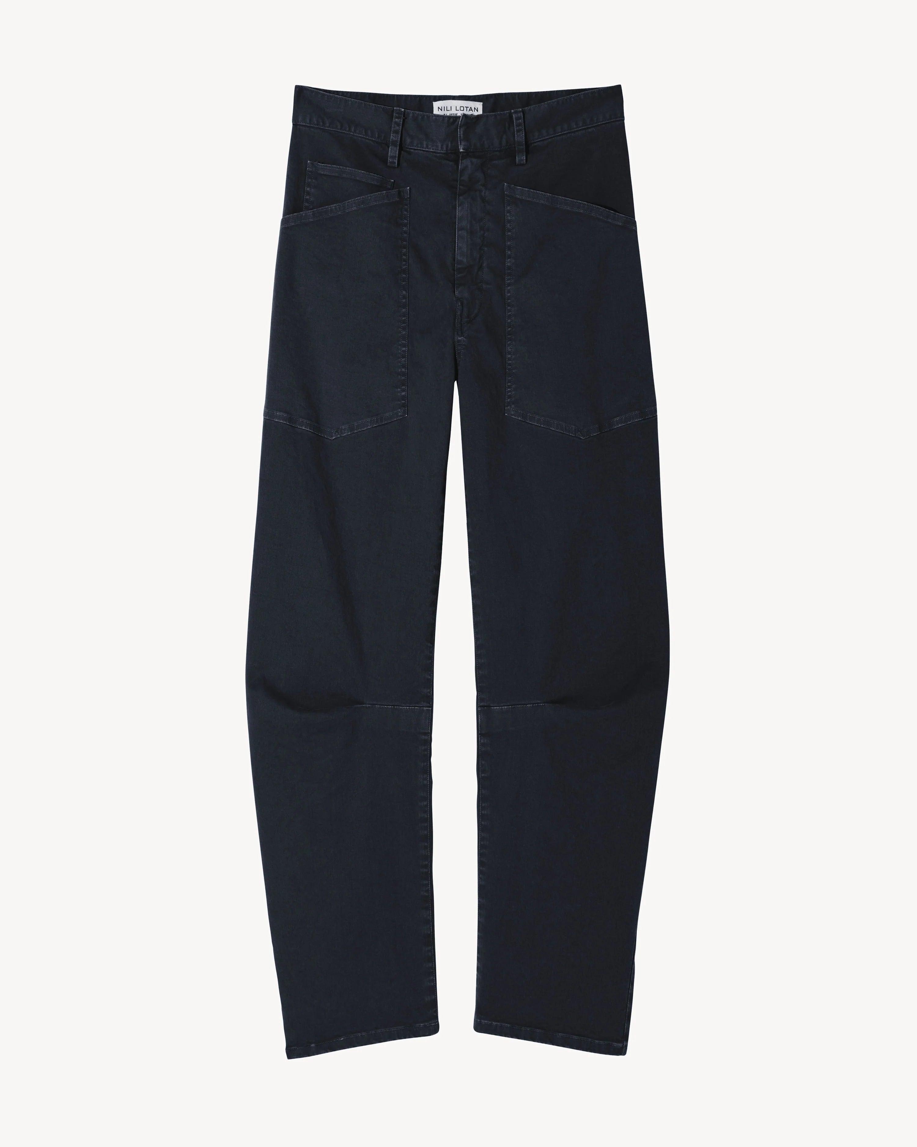 Mid-rise, relaxed fit pant in brushed stretch twill cotton. Uniquely curved silhouette. Seam detail at knees. Gusset at inseam. Zip fly. Hidden hook-and-bar closure. Hidden stay button closure. Top-stitched front and back patch pockets. Belt loops.