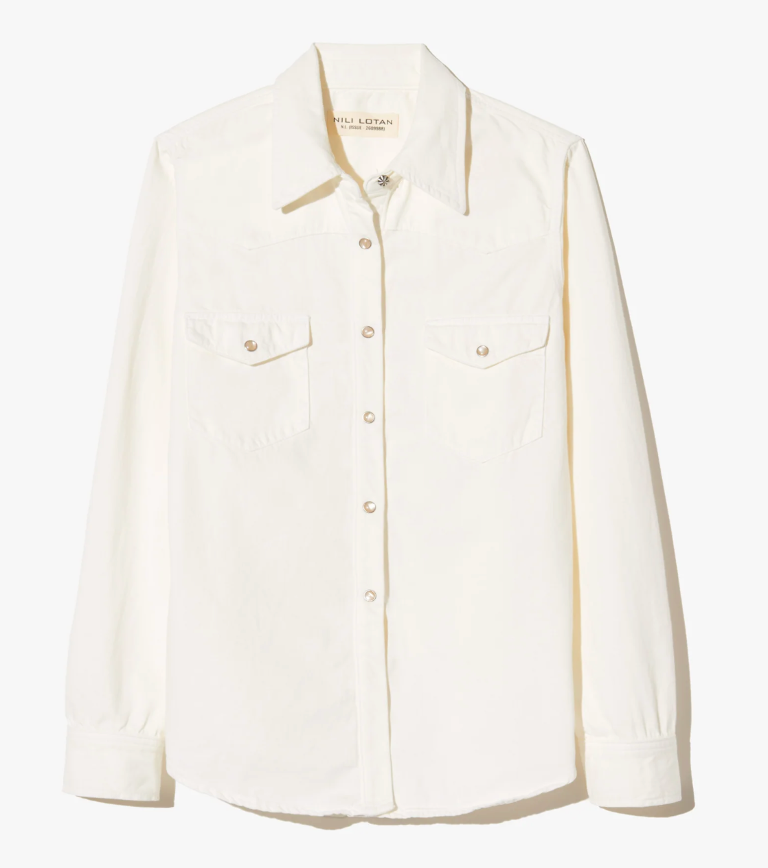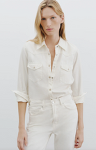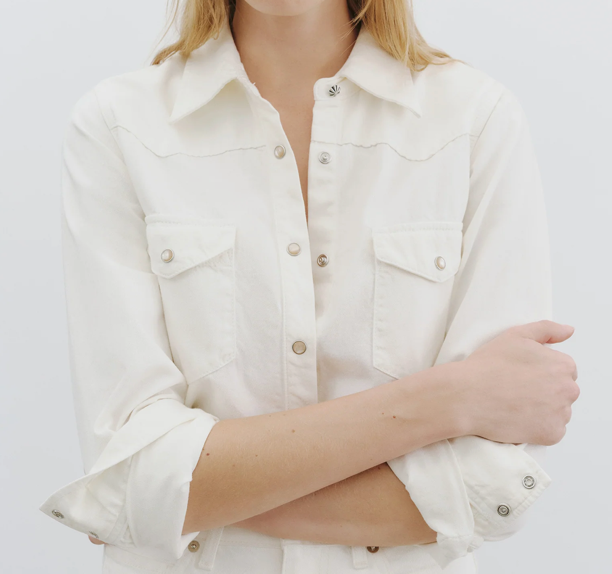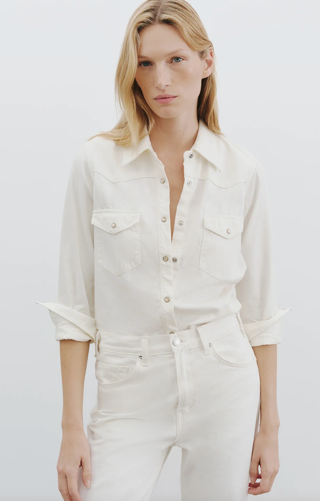 Classic, straight fit collared jean shirt in Japanese denim. Western details. Pearl snap buttons. Chest flap pockets. Standard placket. Center front buttons. Buttons at cuff.