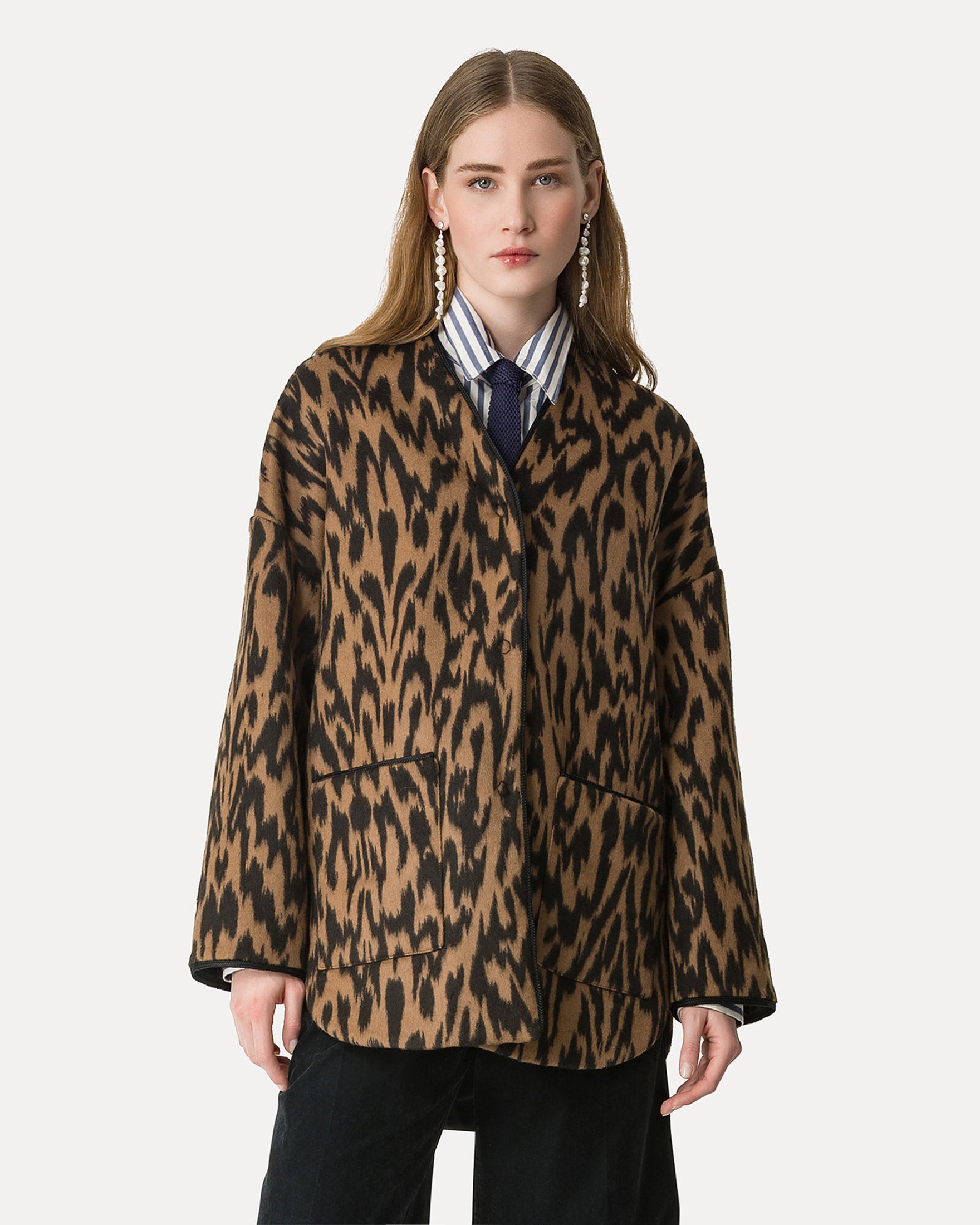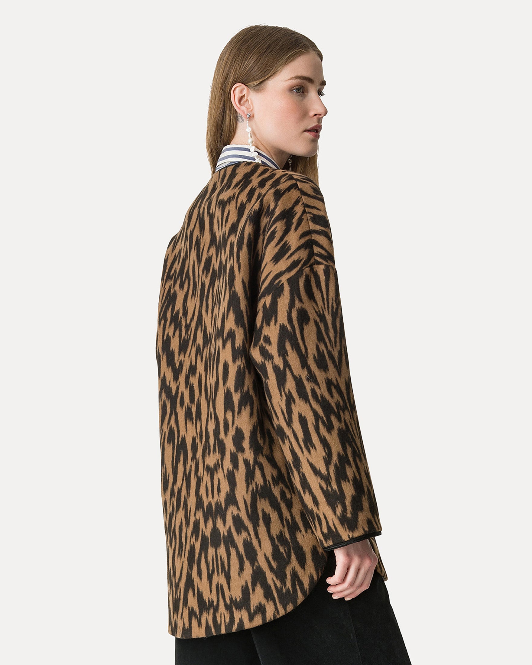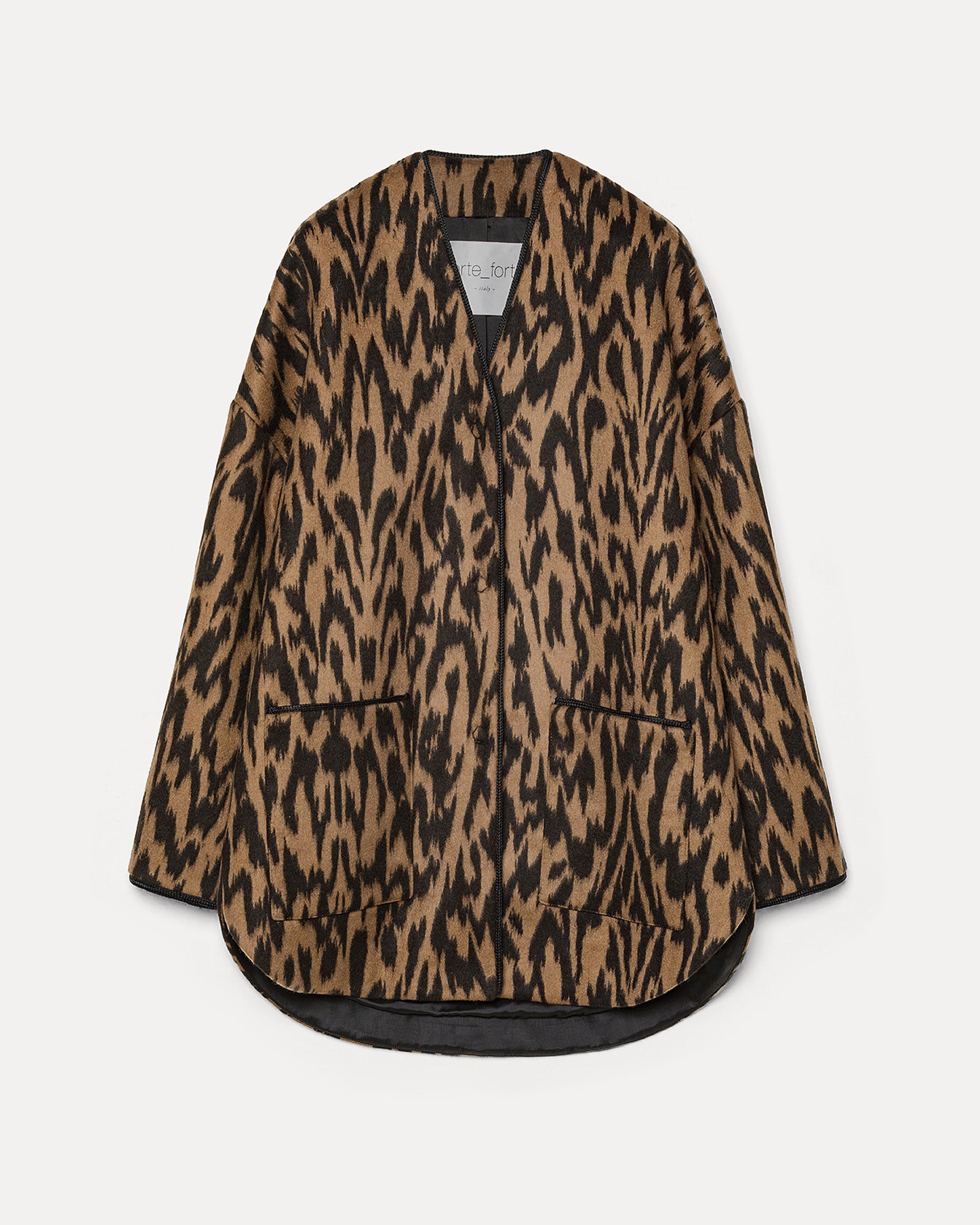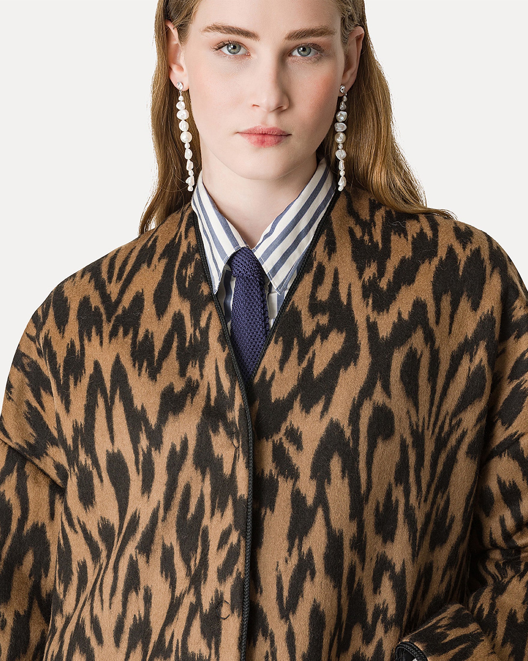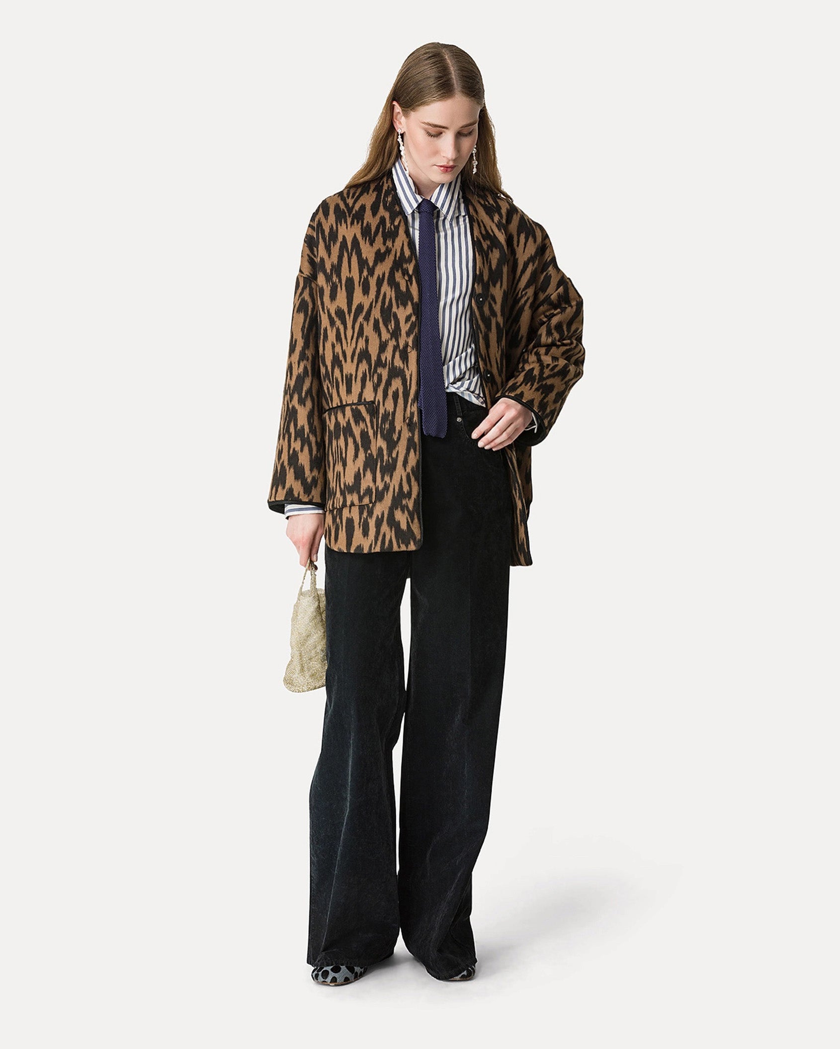 with a soft unstructured silhouette, this jacket in “moiré”–effect cloth strikes an effortless balance between a bold pattern and décontracté feel. the trim in a contrasting shade, asymmetrical hemline with rounded vents and the patch pocket temper the weighty grandeur of the wool and cotton blend.