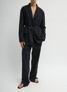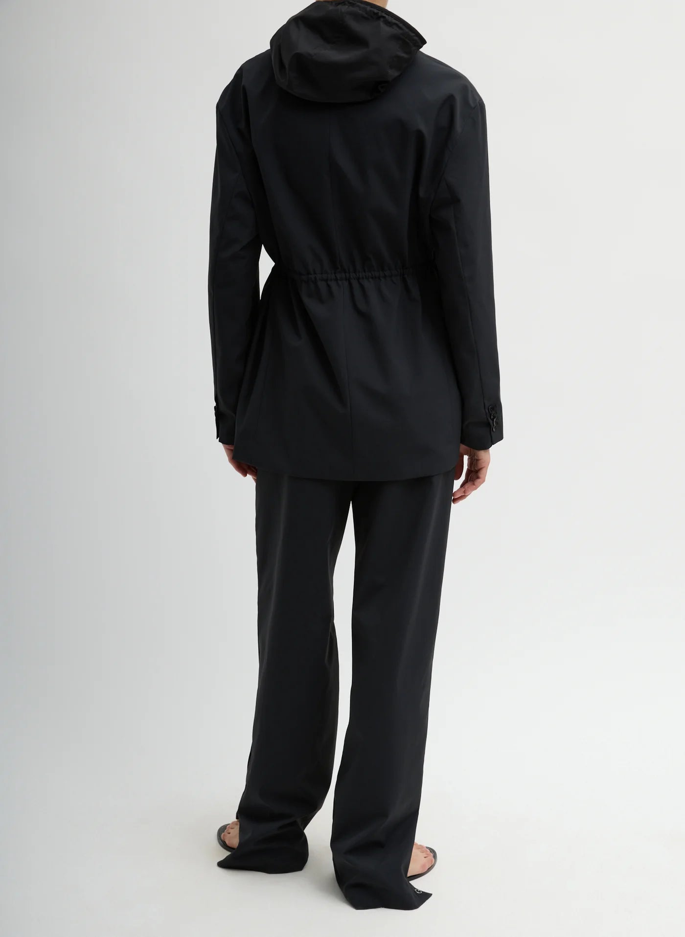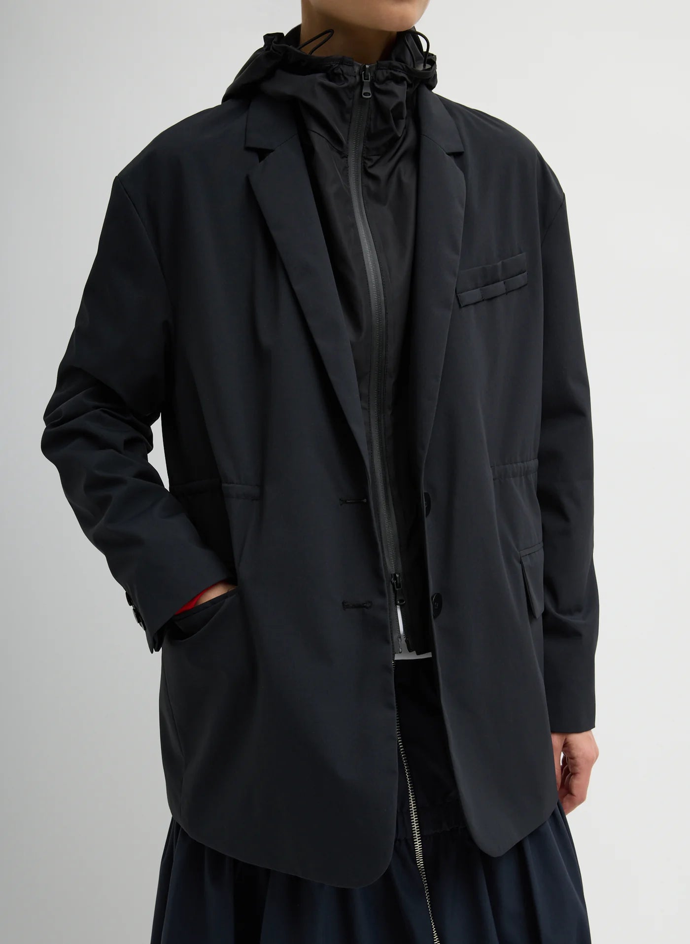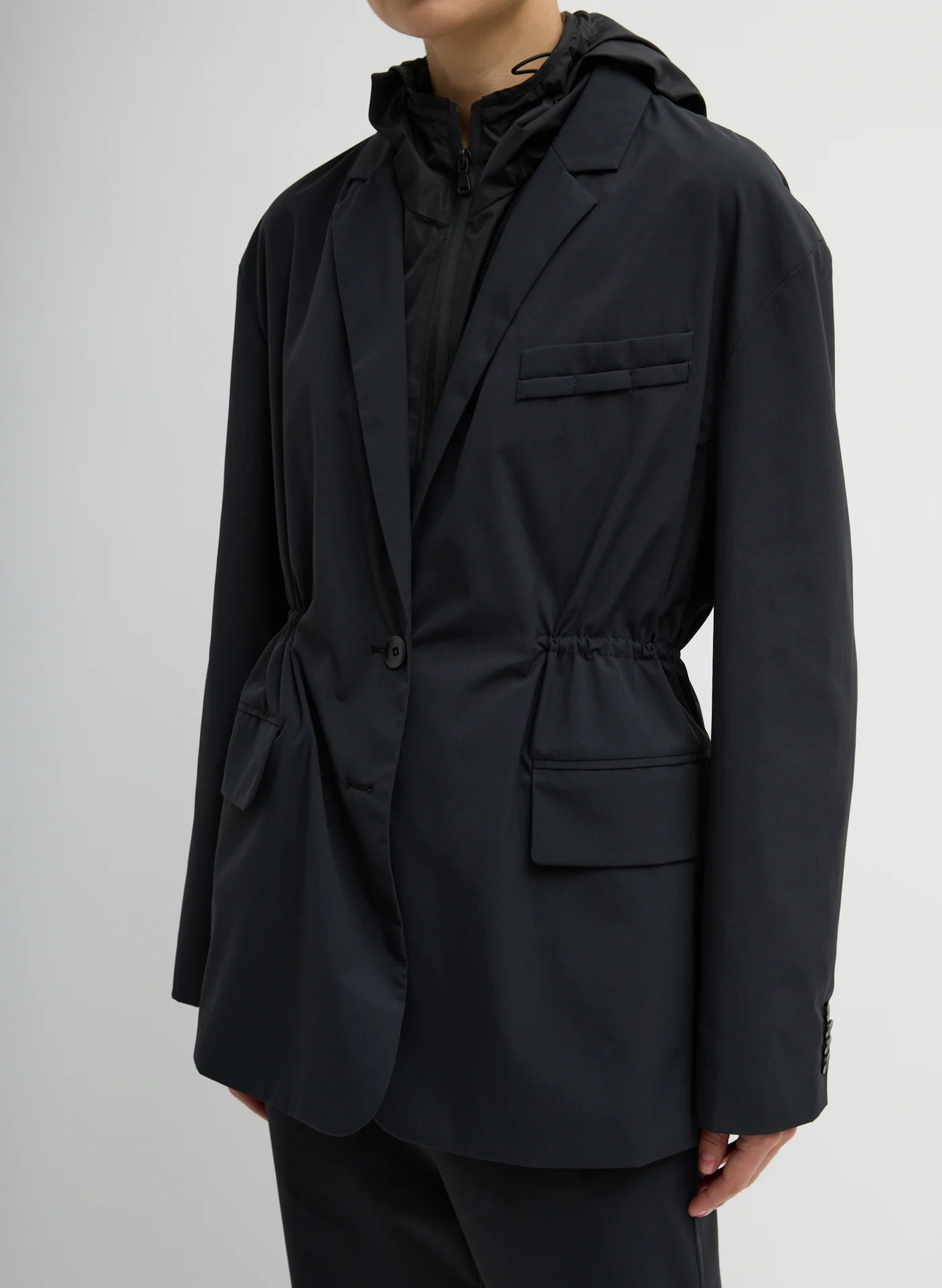 The Tech Suiting Anorak Blazer redefines functional tailoring. Crafted from waterproof bonded nylon with a smooth, durable finish, this style includes a detachable hood and adjustable waist cords that cinch to create a peplum effect. Available in Black and Dark Hazelnut, it pairs effortlessly with the Mark Trouser or Asymmetrical Skirt for a full suit that blends precision and practicality—or wear it solo as outerwear for transitional weather.