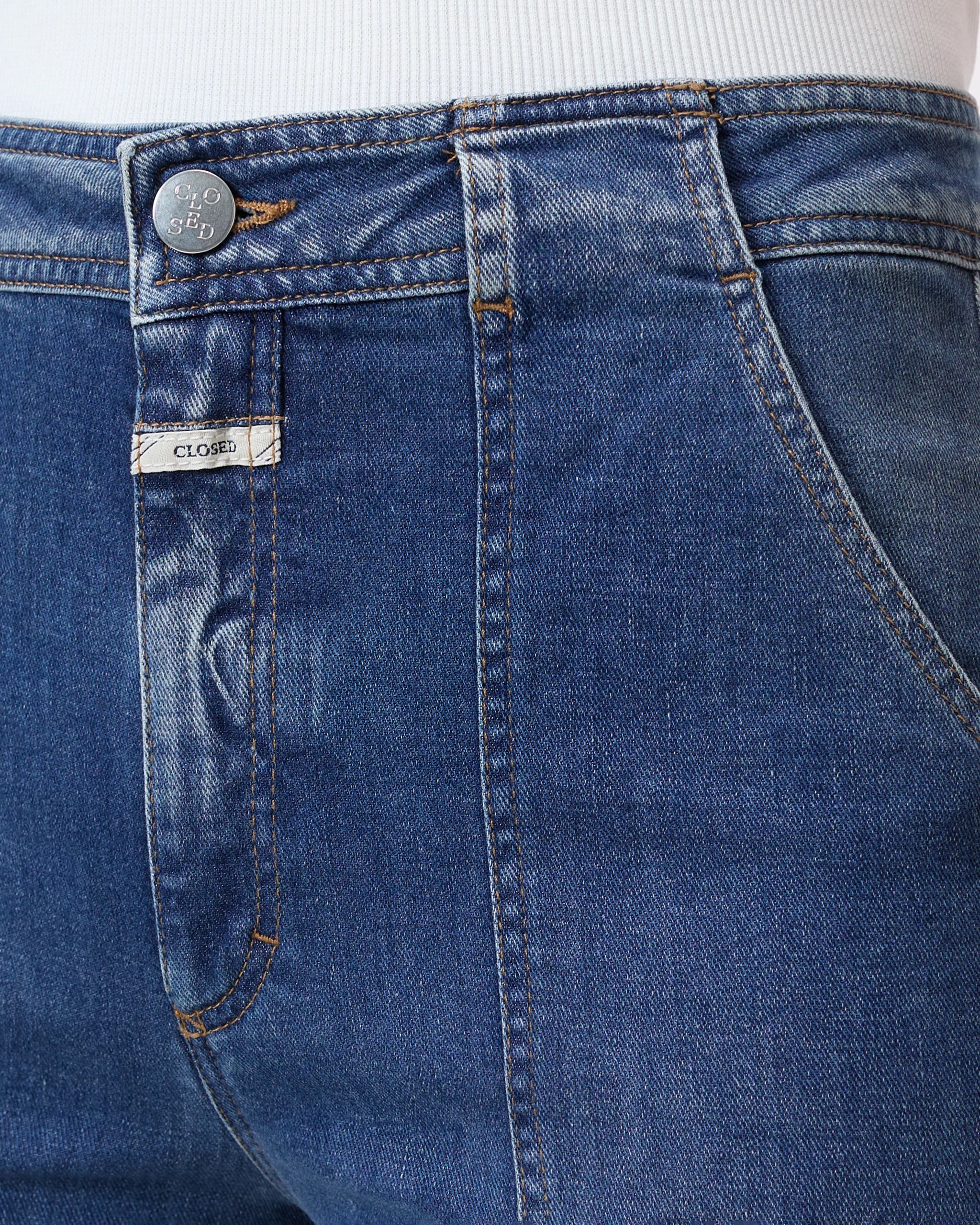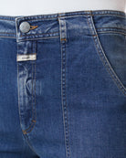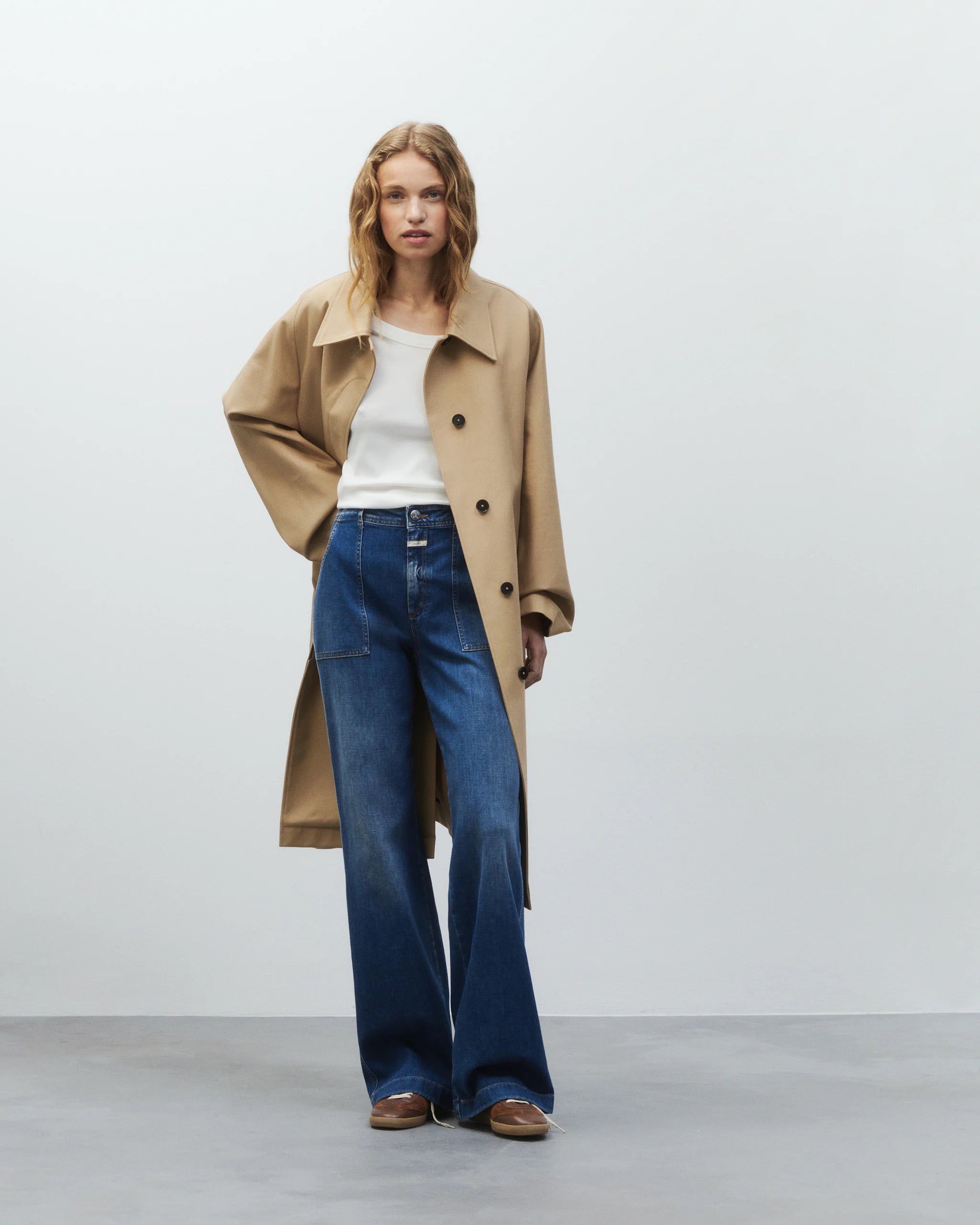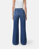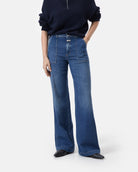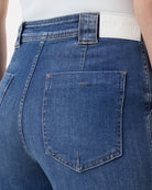 The Aria denim features a flared fit with a high waist and long legs. Made in Italy from 10 oz. stretch denim with a 3/1 left hand twill structure. Functional design with patch pockets, button closure, and belt loops. Crafted with regenerative cotton and eco-friendly vegetal sizing for a natural fade.