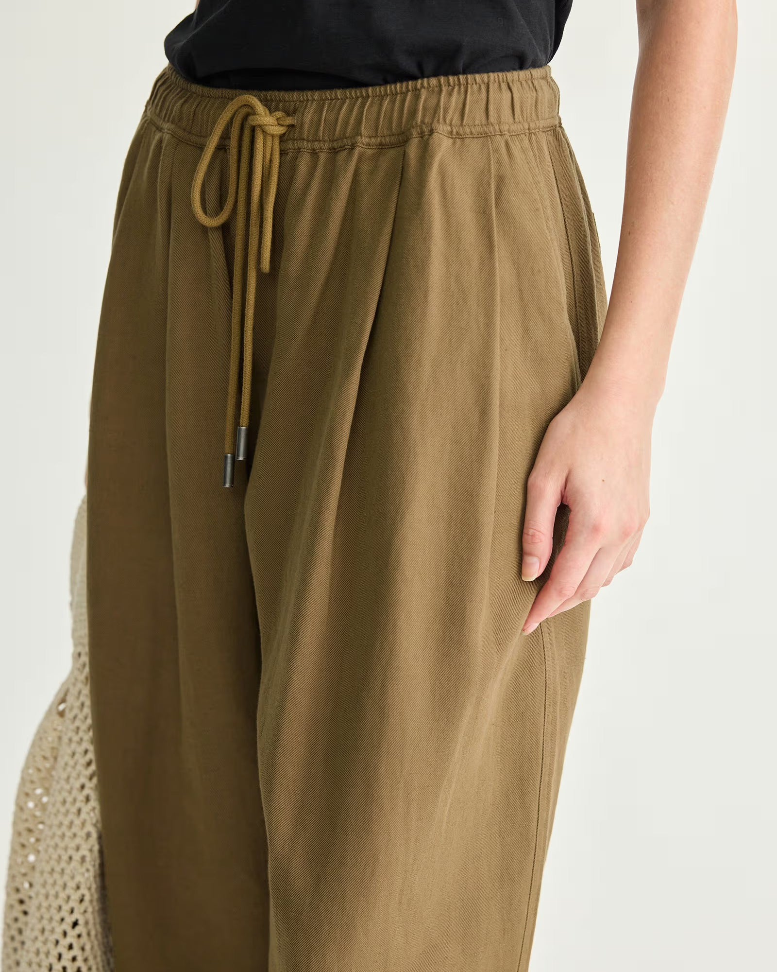 A new silhouette built in a core fabric, bringing structure and presence to the ease of a drawstring pull-on. Casual enough for daily wear, strong and structured enough to anchor a look, this pant offers comfort and functionality.