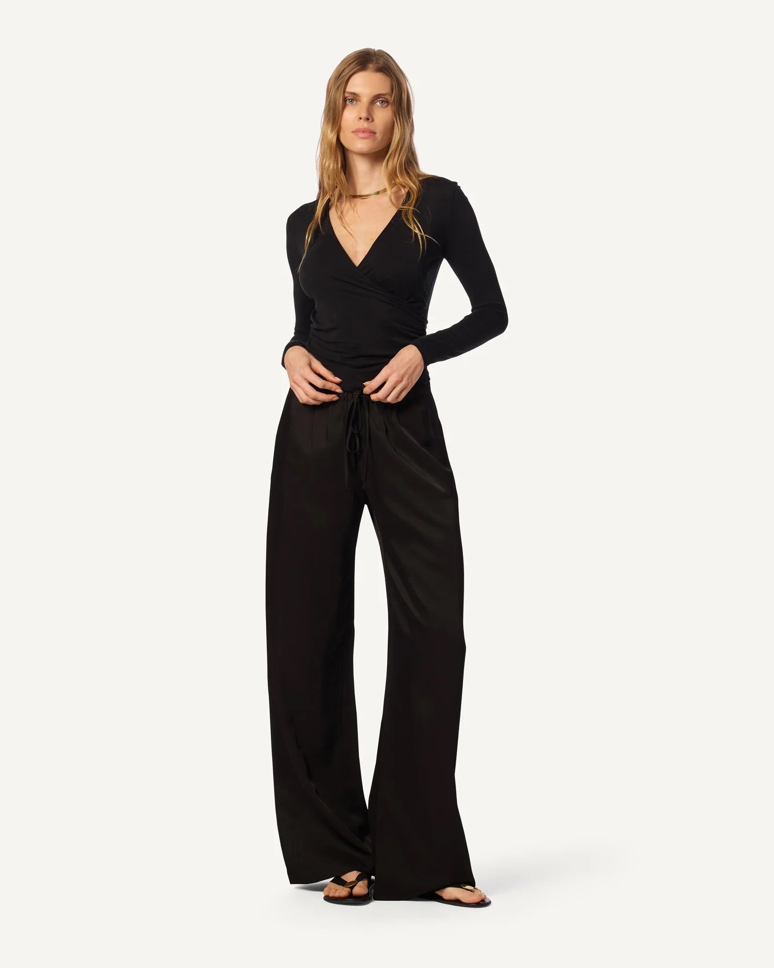 Pull-on, straight-leg pant with a drawstring waistband and four pockets.