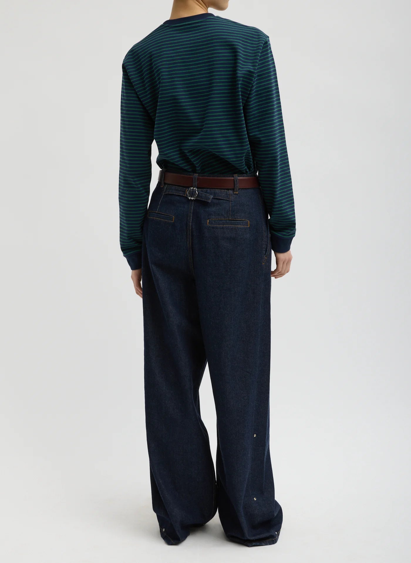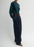 The Indigo Denim Triple Pleat Jean reimagines raw indigo denim through a sculpted, wide-leg silhouette. With three adjustable hemline options, this pant adapts effortlessly to your day—merging the structure of tailoring with the ease of denim. A true hybrid design, it brings proportion and polish to every look. Pair it with the Perfect Striped T for an easy take, or dress it up to transition from Play to Work to Dinner with ease.