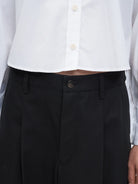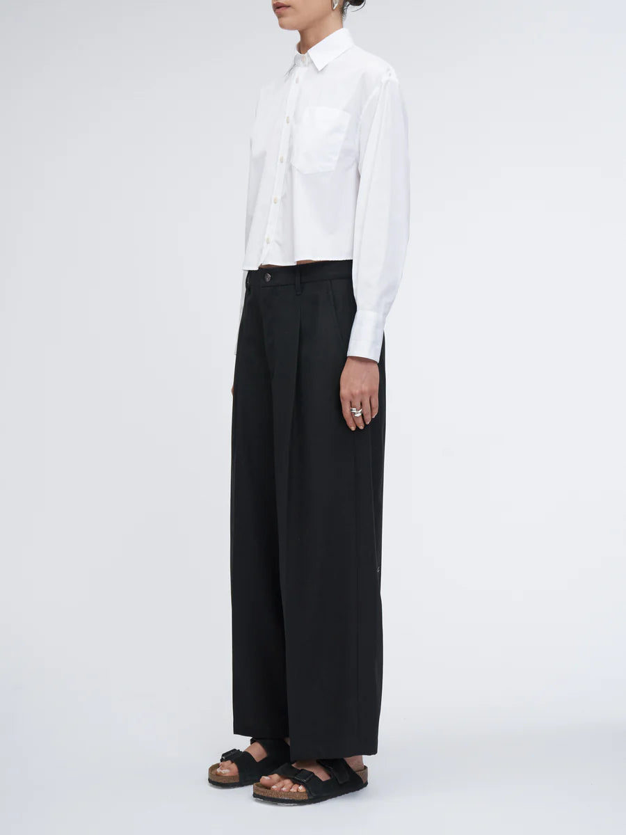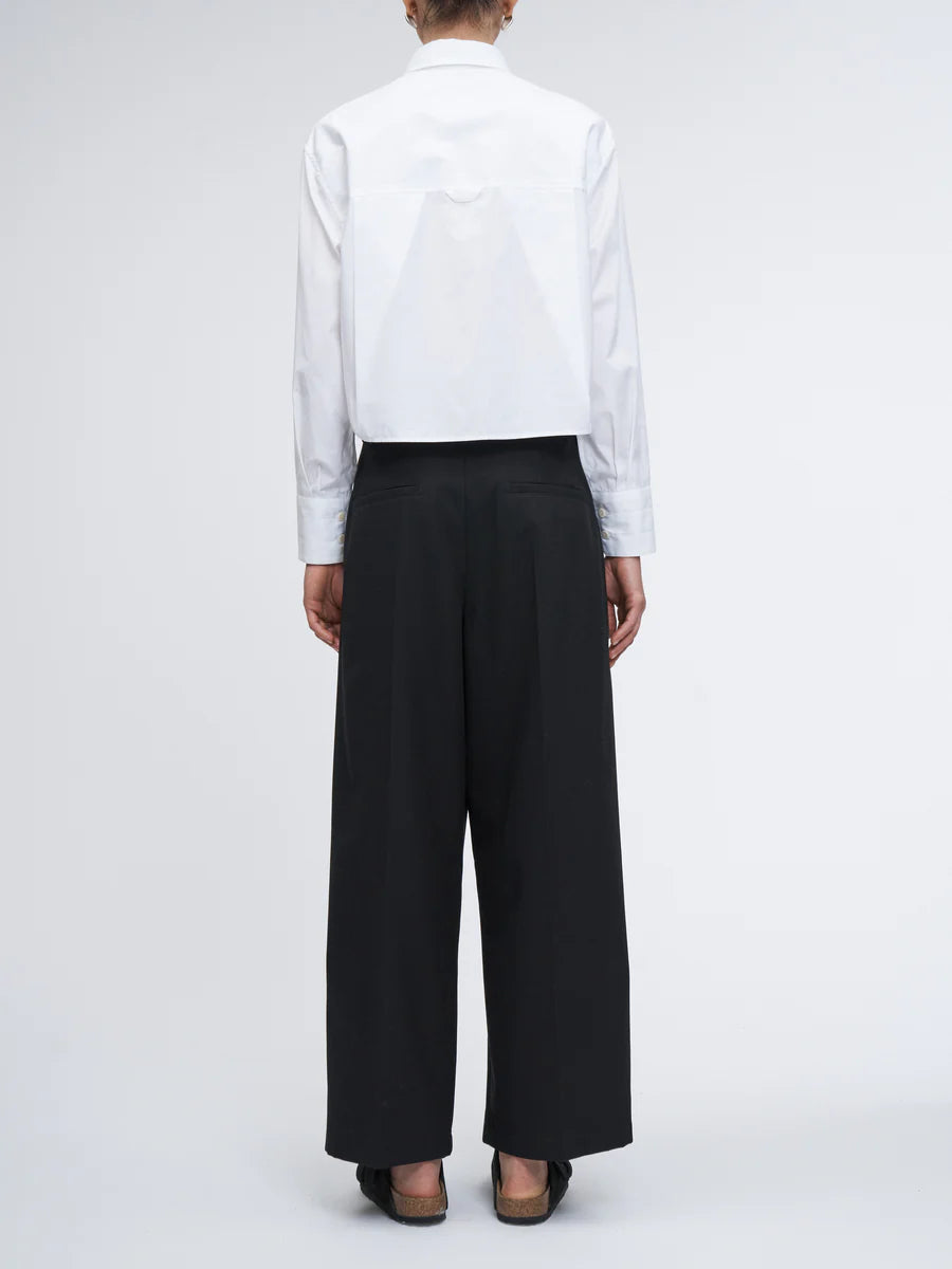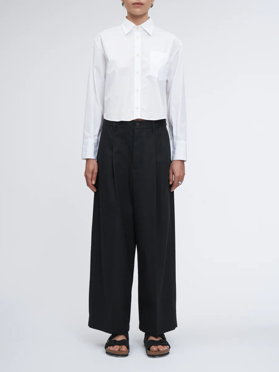 Made from our signature Japanese high-twist cotton, this mid-rise pant combines a wide-leg silhouette with front pleats that bring structure and shape. The cropped length lends a sharp, clean finish. Completed with two welt pockets on the back and fastened with our recycled metal shank button, this trouser balances comfortability and fine tailoring.