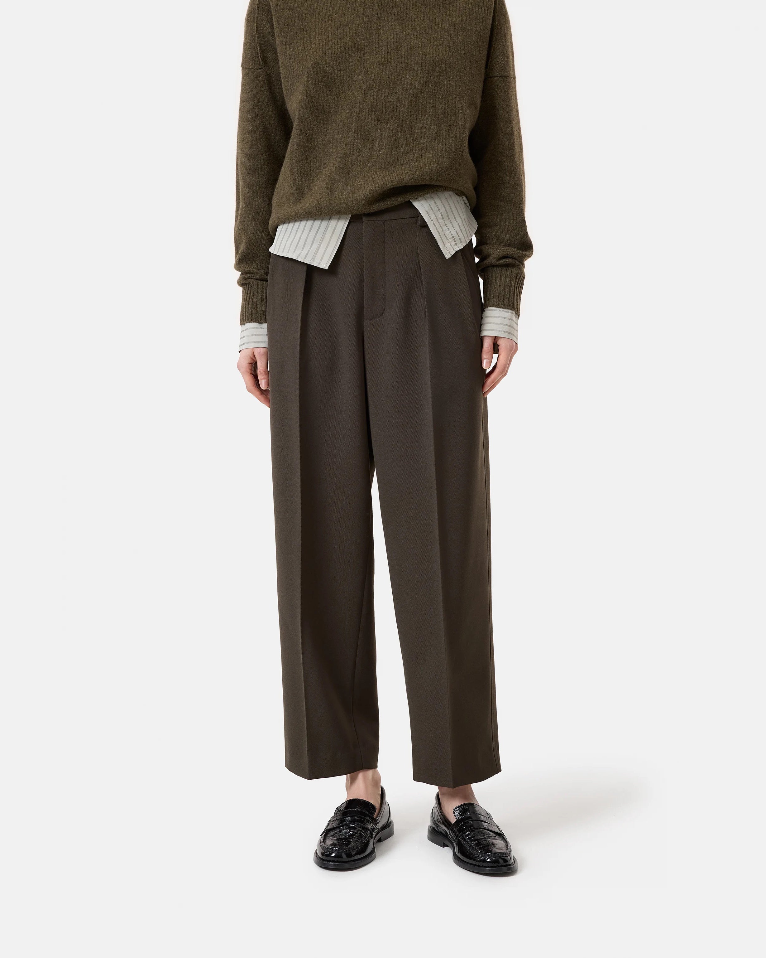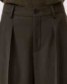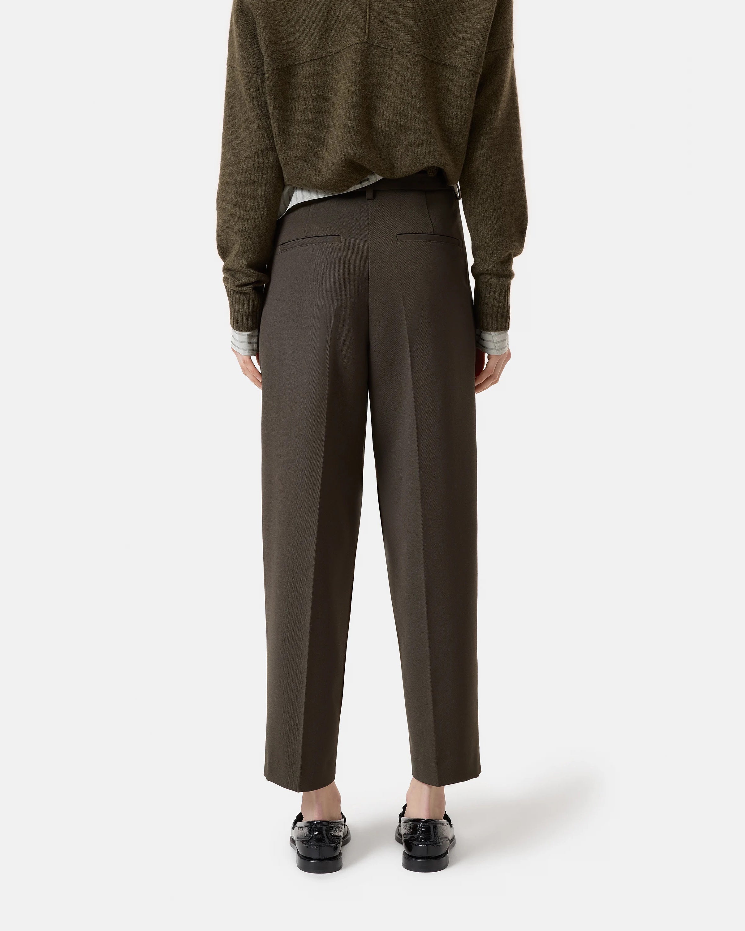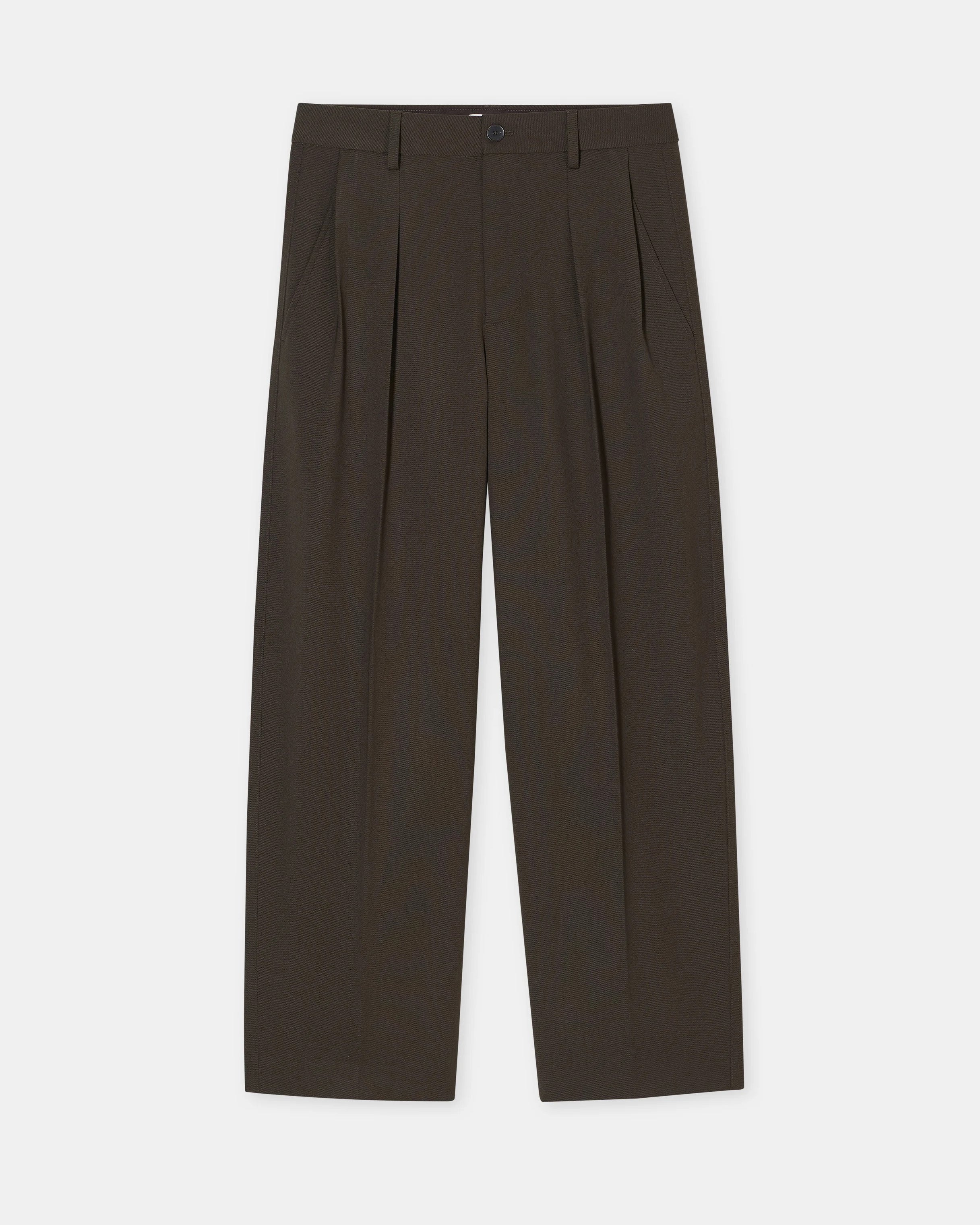 Our new relaxed fit pants Ruthy come with a wide leg and mid-rise waist. They are made from soft stretch-wool-blend twill with a vibrant piece-dye finish. Featuring front pleats, press creases in the front and back, and back welt pockets. Can be worn as a complete suit with the matching blazer. Made in Romania.