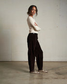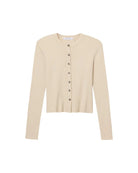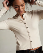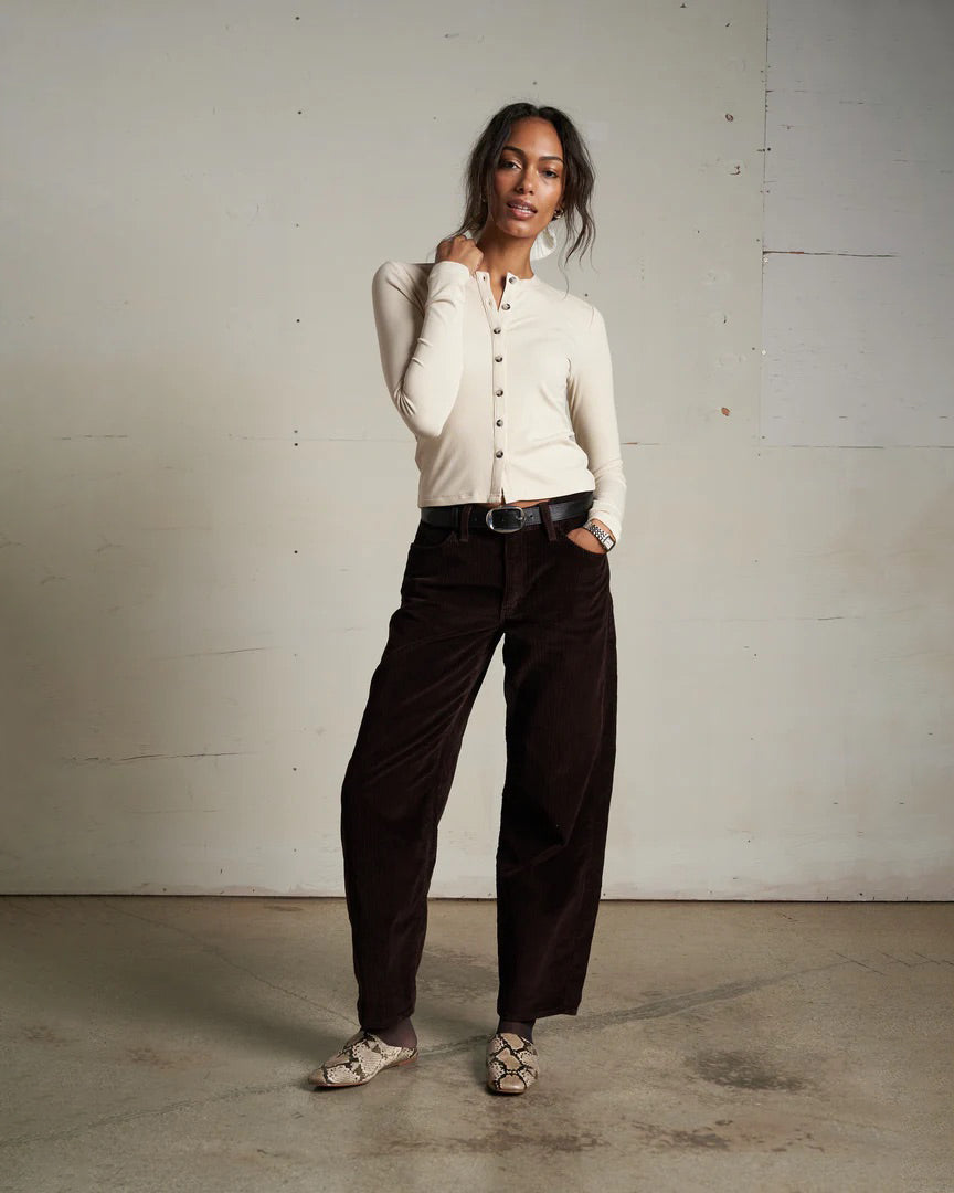 the maureen top is your fitted button-down, upgraded. made from our luxe rib, this long sleeve style is soft, sculpted, and hits right below the belly button. with just the right amount of stretch and a clean silhouette, she layers with ease and holds her own when worn solo.