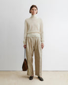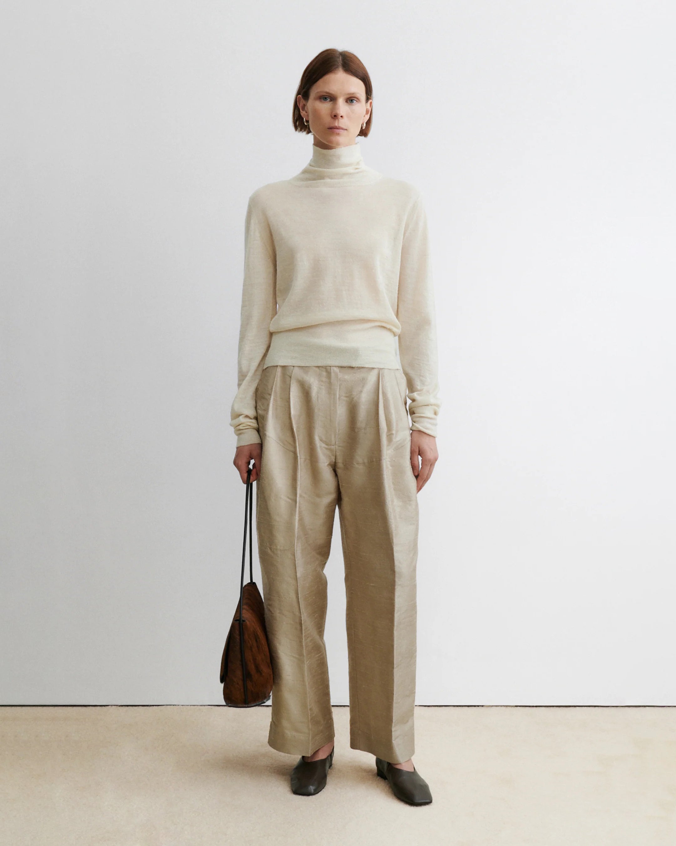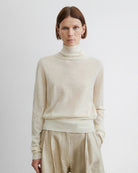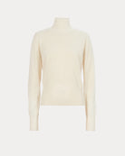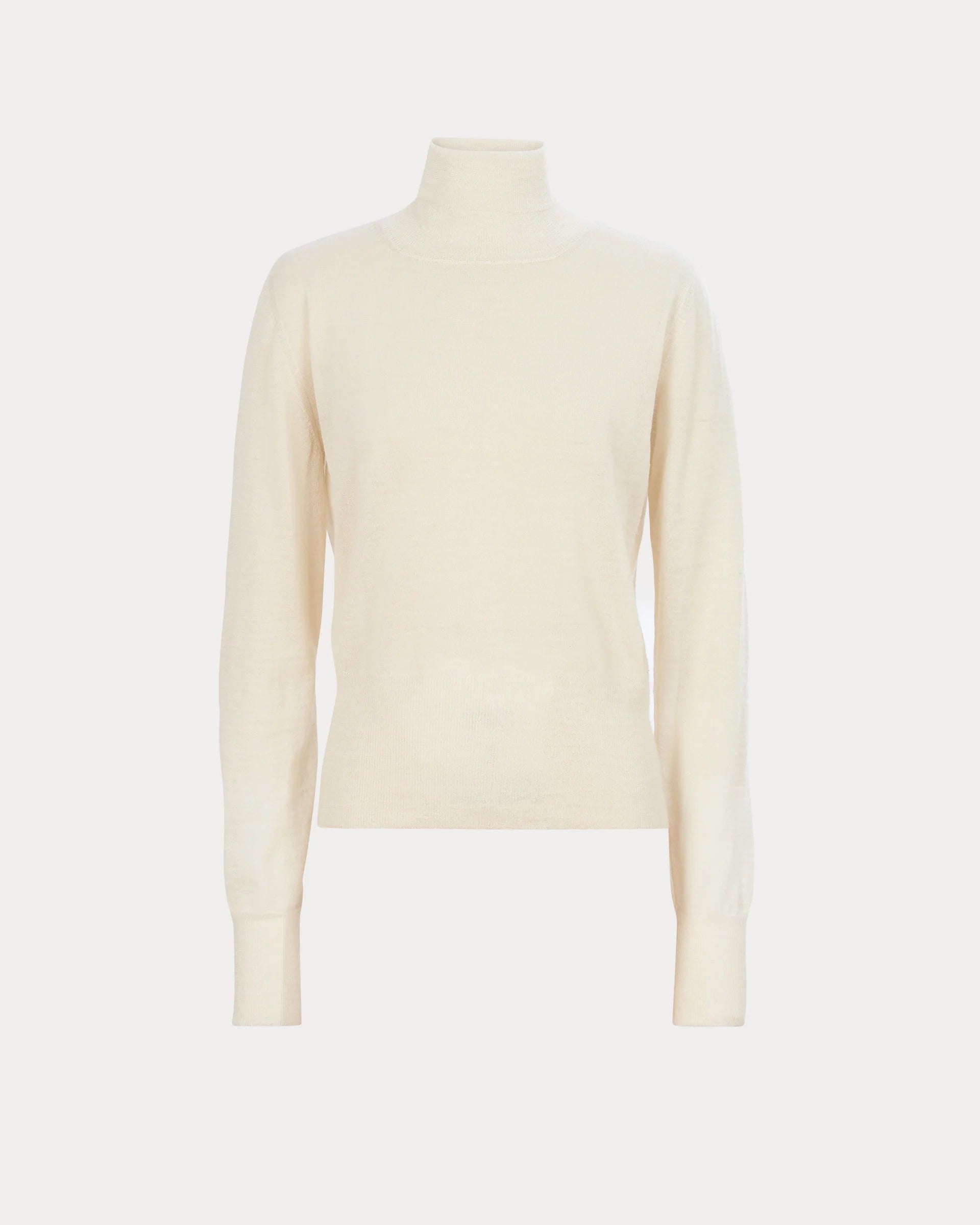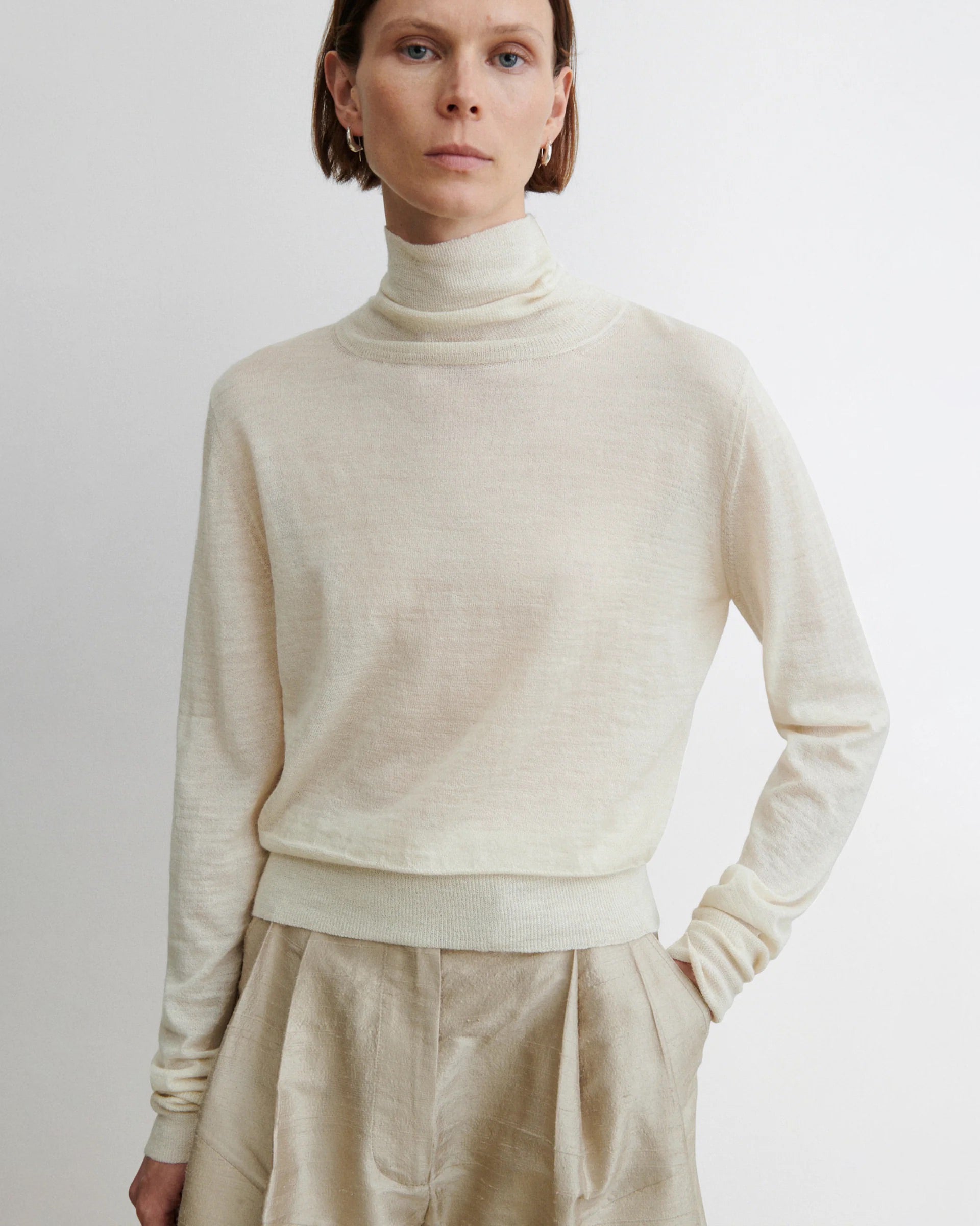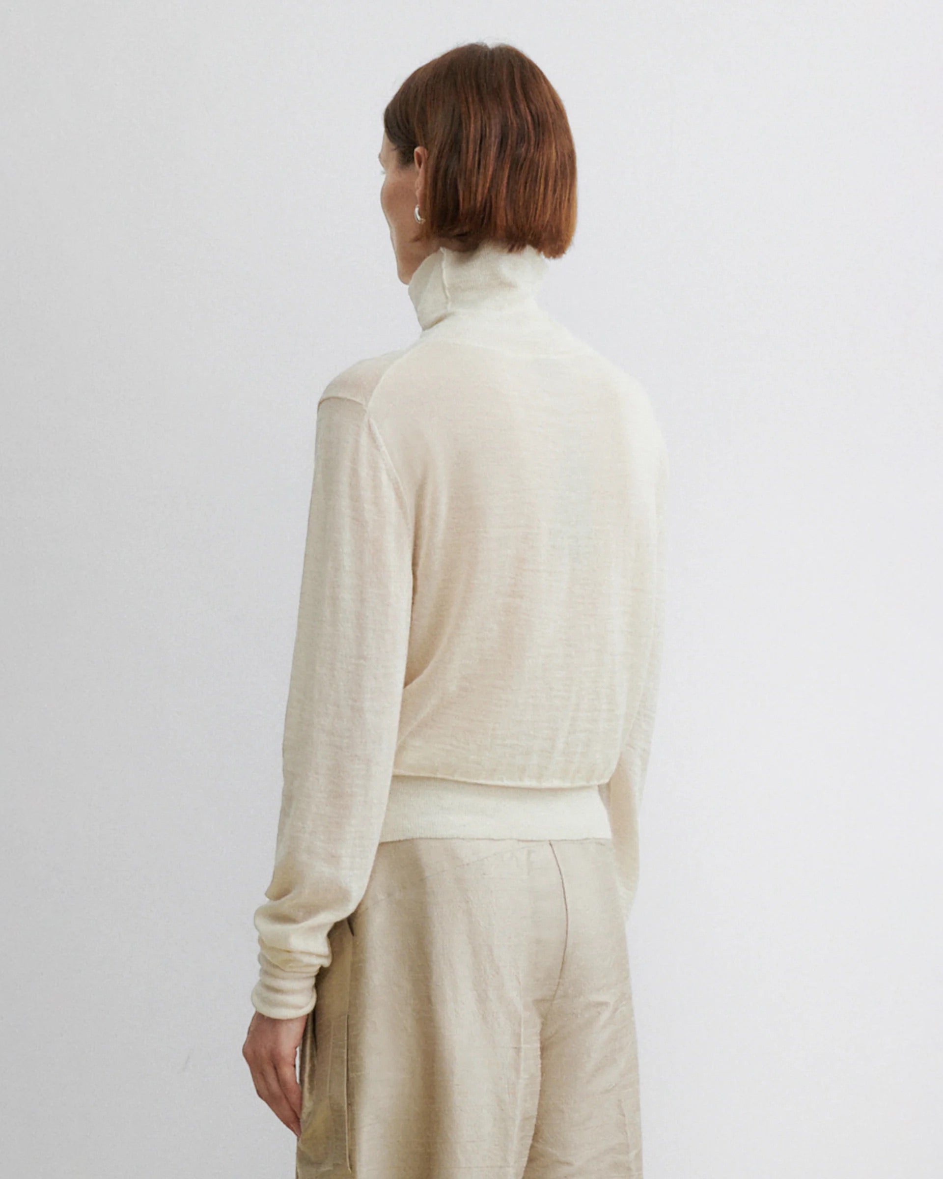 Slim turtleneck blouson sweater in a lightweight Alpaca-Silk knit with a crisp, breathable hand and subtle striations from the silk. Finished with fine ribbing at the collar, cuffs, and hem—an elevated layering piece designed to pair with tailoring.
