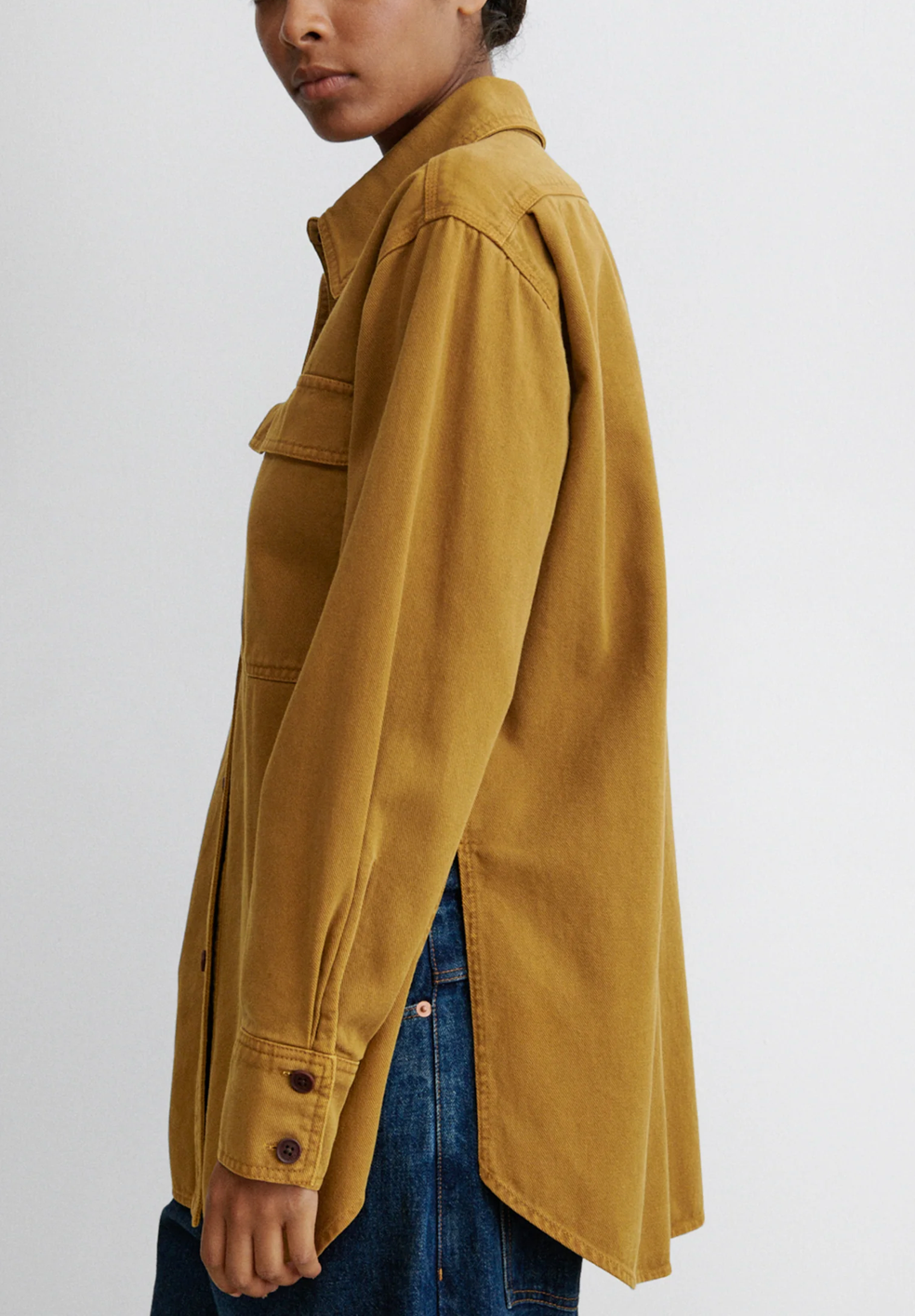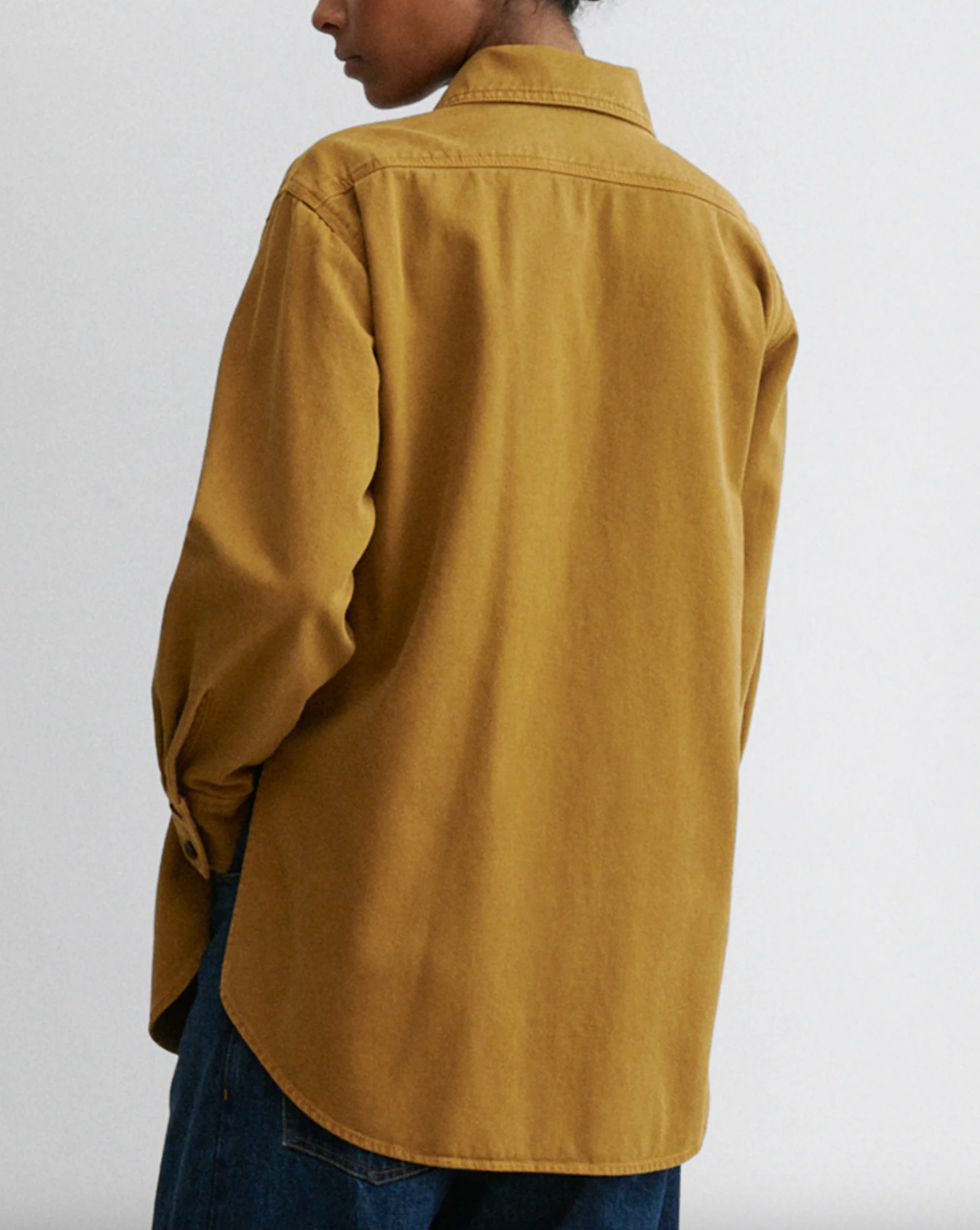 An RC classic oversized workwear shirt cut in Brushed Bull Denim. Wear it open as a lightweight jacket or layer with a turtleneck for extra warmth.