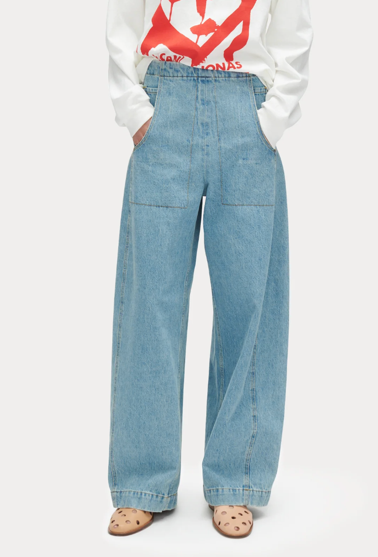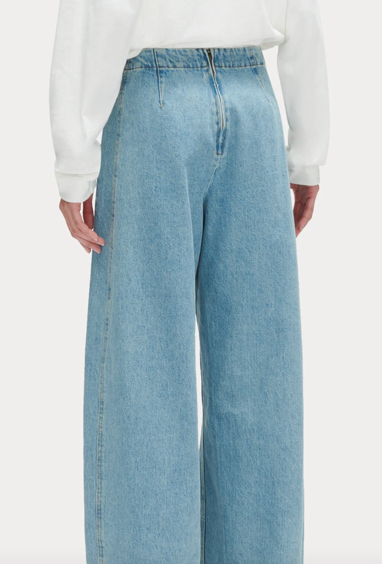 Relaxed-fit high-waisted jeans in Washed Mission Denim, featuring a discreet back zipper and rear darts for a flattering fit. Cut to a wide-leg silhouette, offering a relaxed and spacious feel, with deep square pockets and unique coin pockets for functionality.