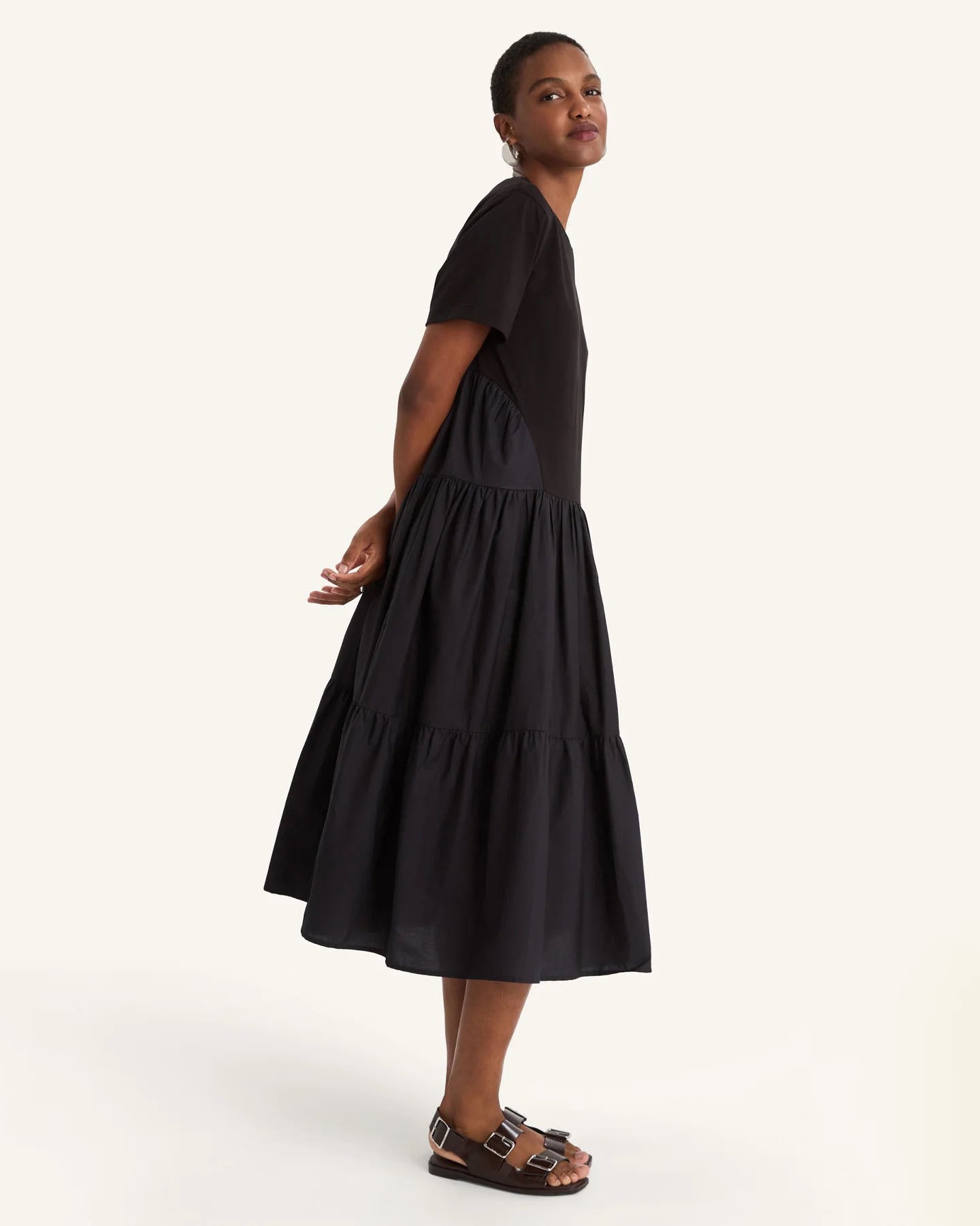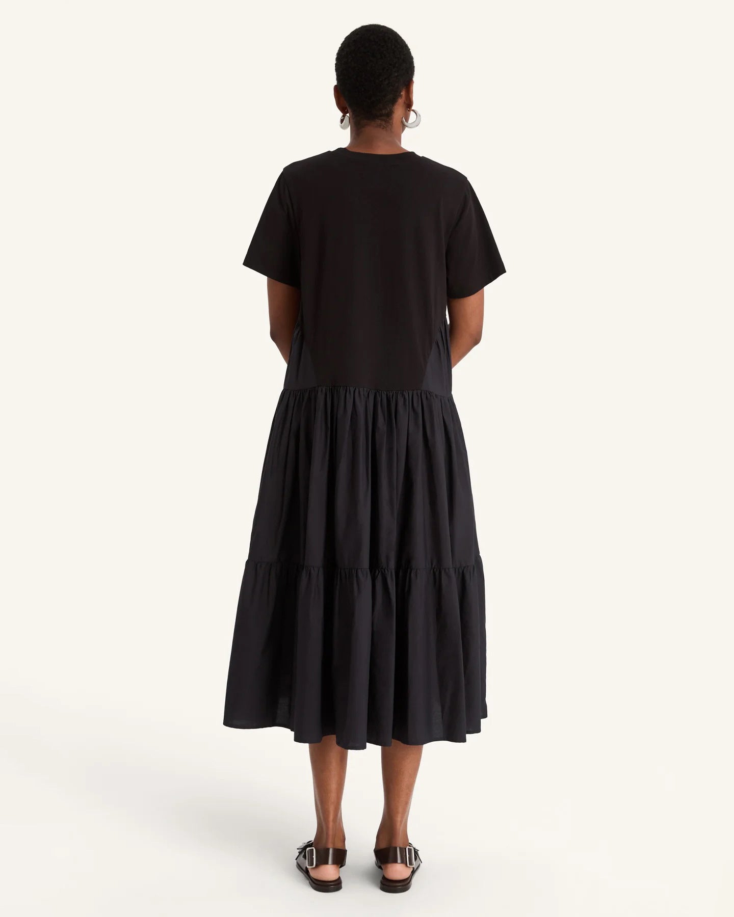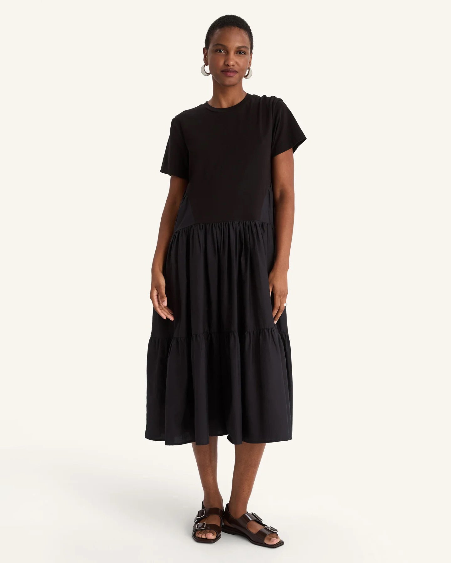 Combining the effortless comfort of cotton jersey with the fluid elegance of poplin, the IRENE Dress represents a refined take on versatile style. The bodice and short sleeves are crafted from soft, breathable cotton jersey, while the skirt features a tiered construction in airy cotton poplin that billows gracefully with each step. Gathered detailing introduces subtle texture, lending visual interest to the midi-length silhouette.
