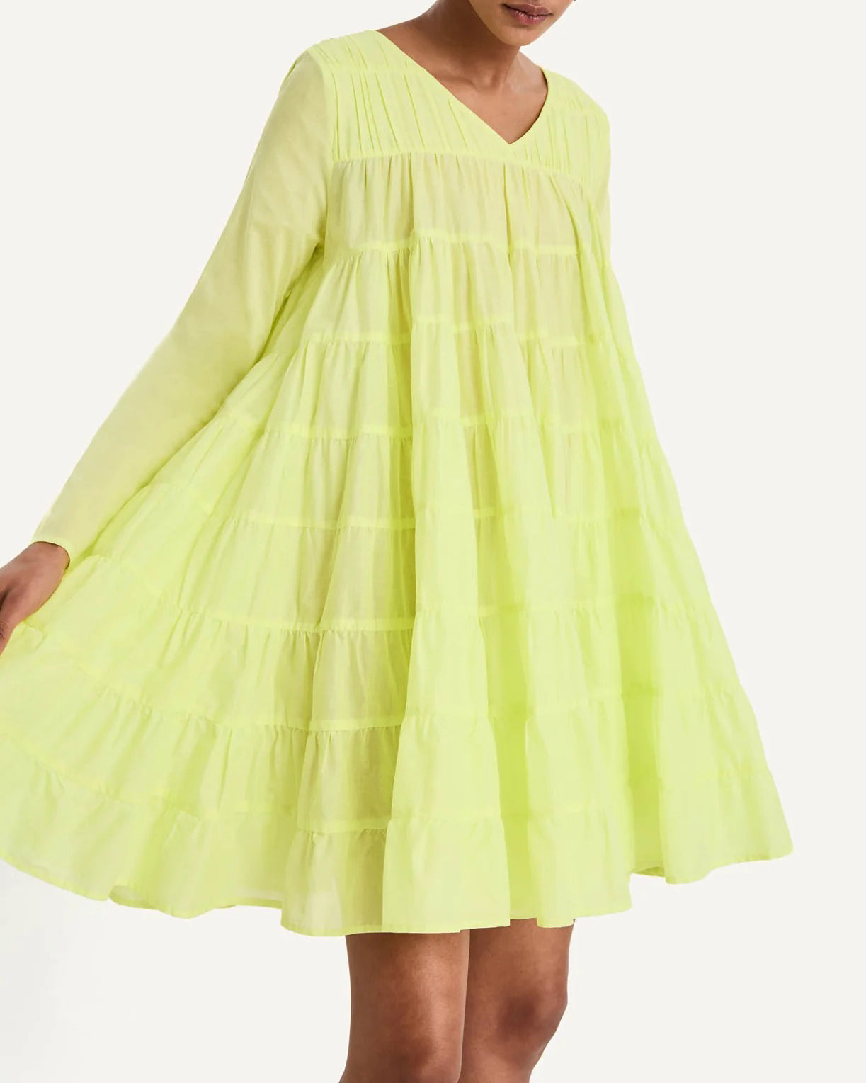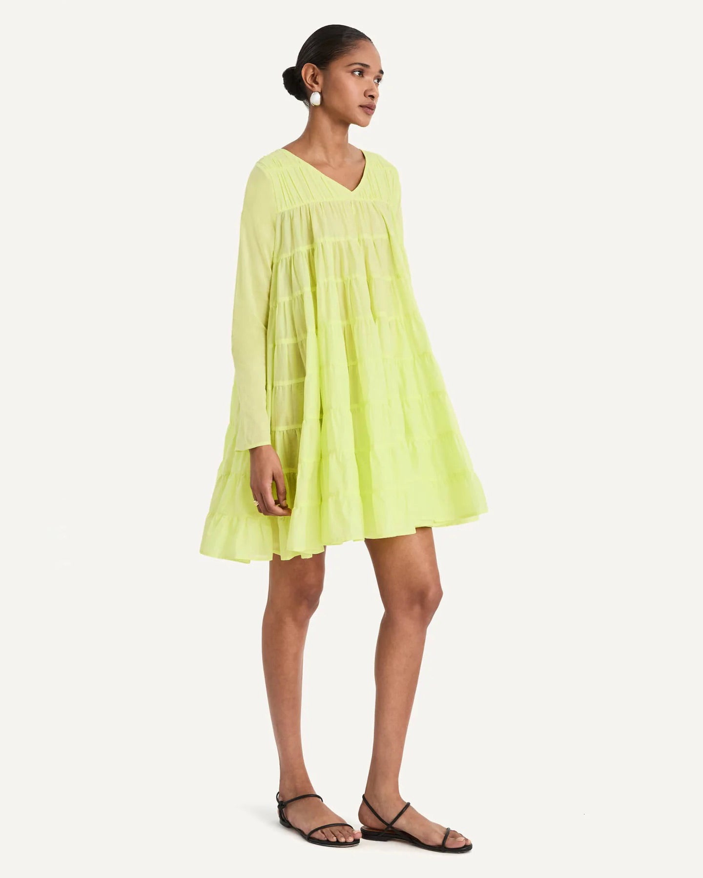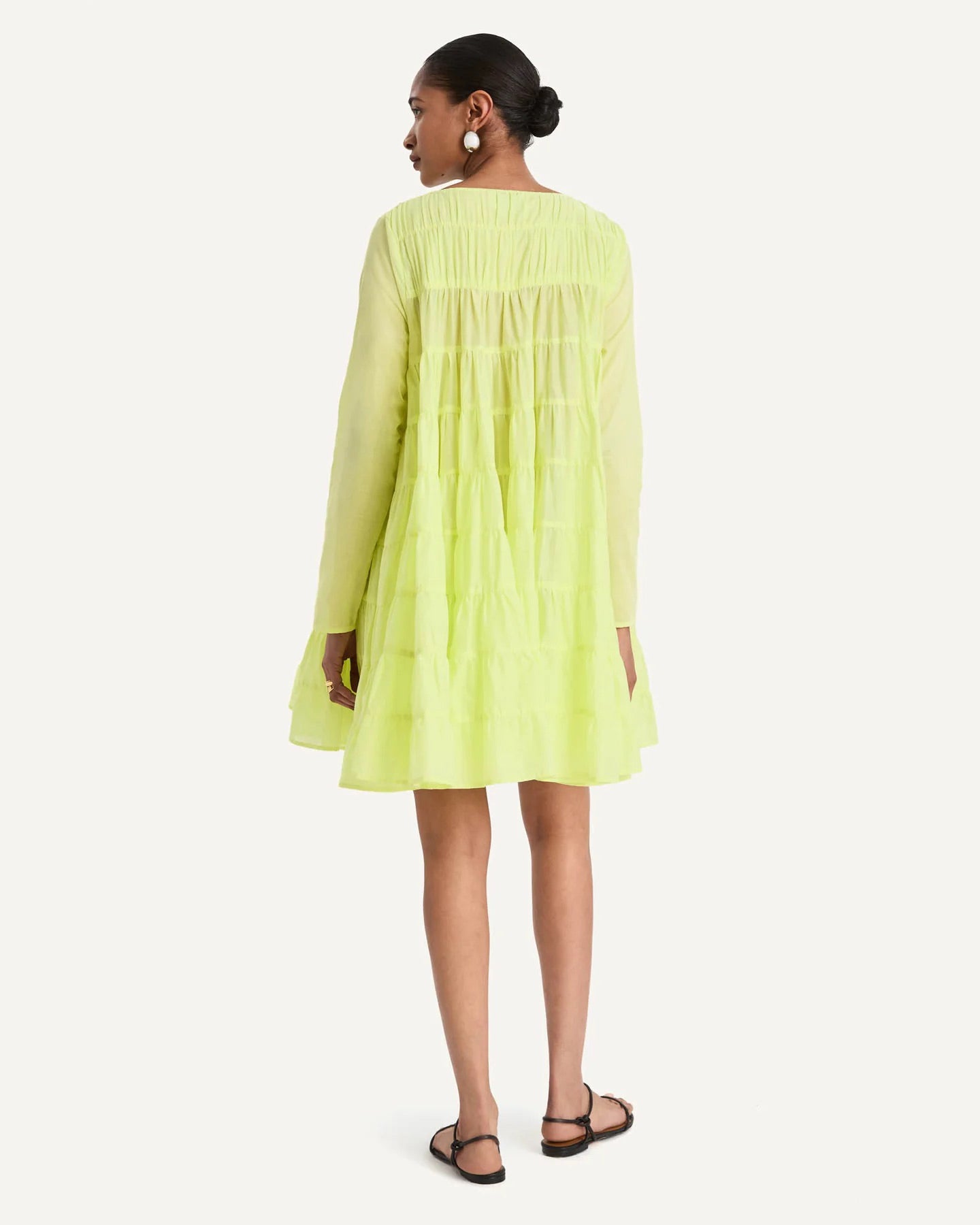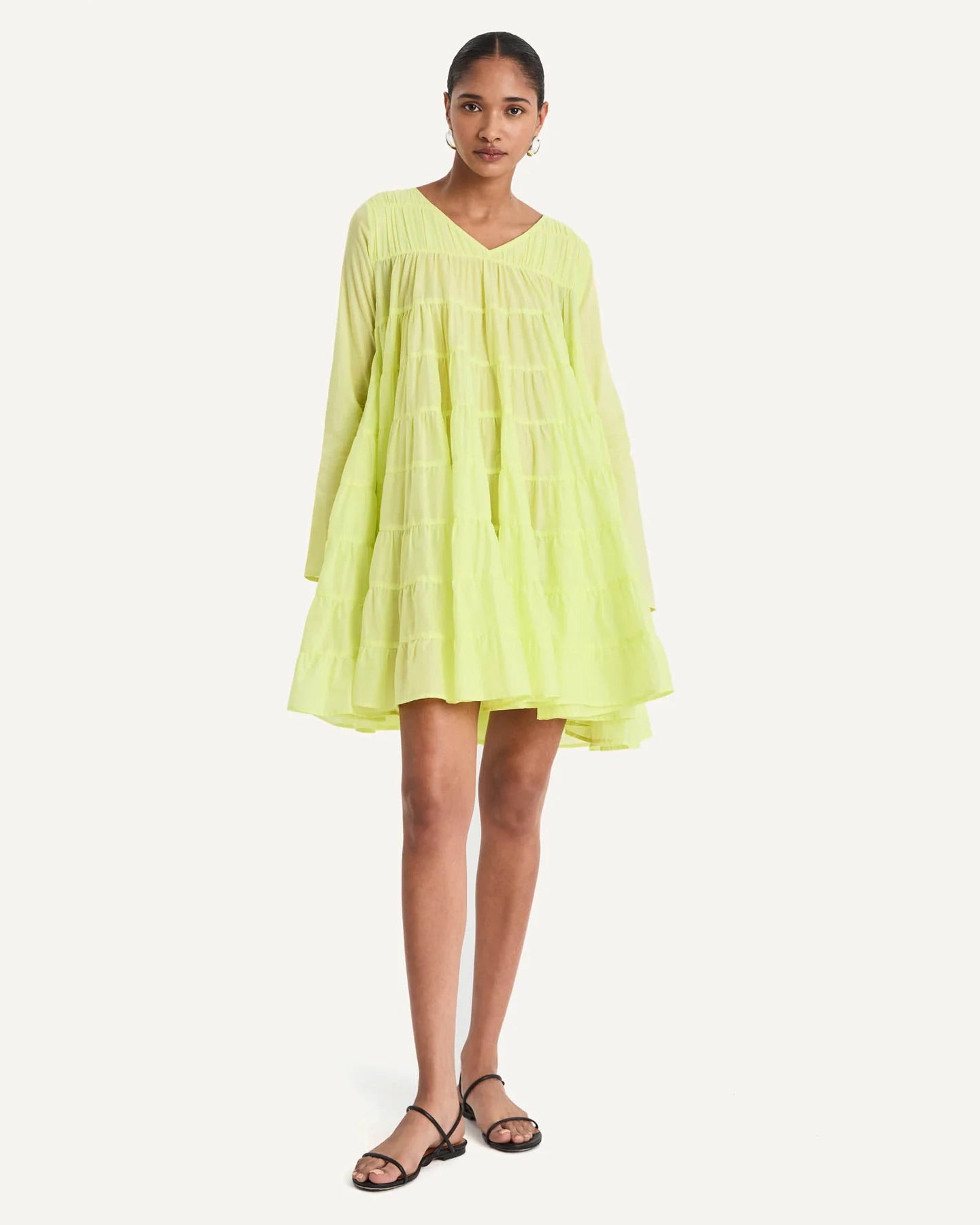 The SOLIS Dress is a delicate and airy vision crafted from 100% cotton voile. Its mini length falls gracefully above the knee, complemented by gathered tiers that create a fluid, unfettered silhouette. Long straight sleeves bring balance to the design, while a V-neckline lends an elegant touch. Pockets add a hint of nonchalance to this effortlessly chic piece. Designed with versatility in mind, the SOLIS includes a removable slip dress, allowing you to style it as a dress or overlay for multiple looks. With its weightless construction and timeless femininity, this dress promises to be a cherished addition to your wardrobe.