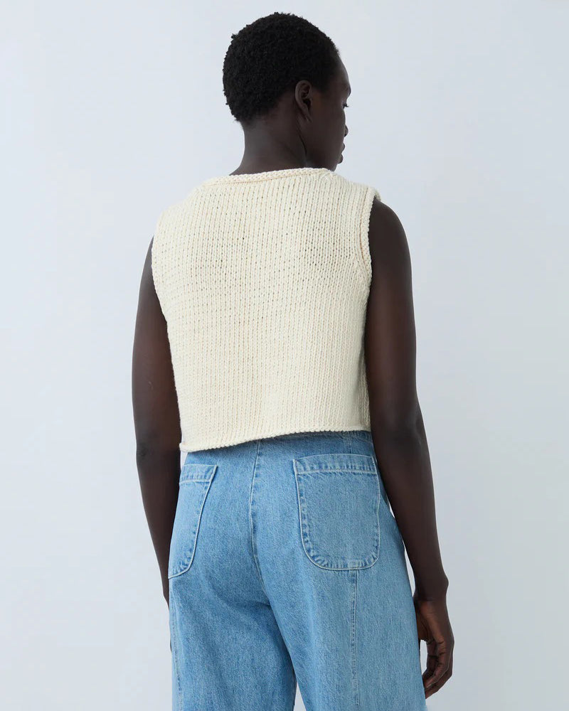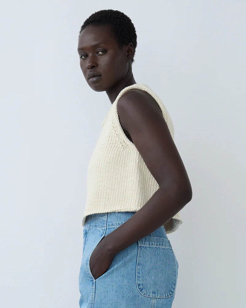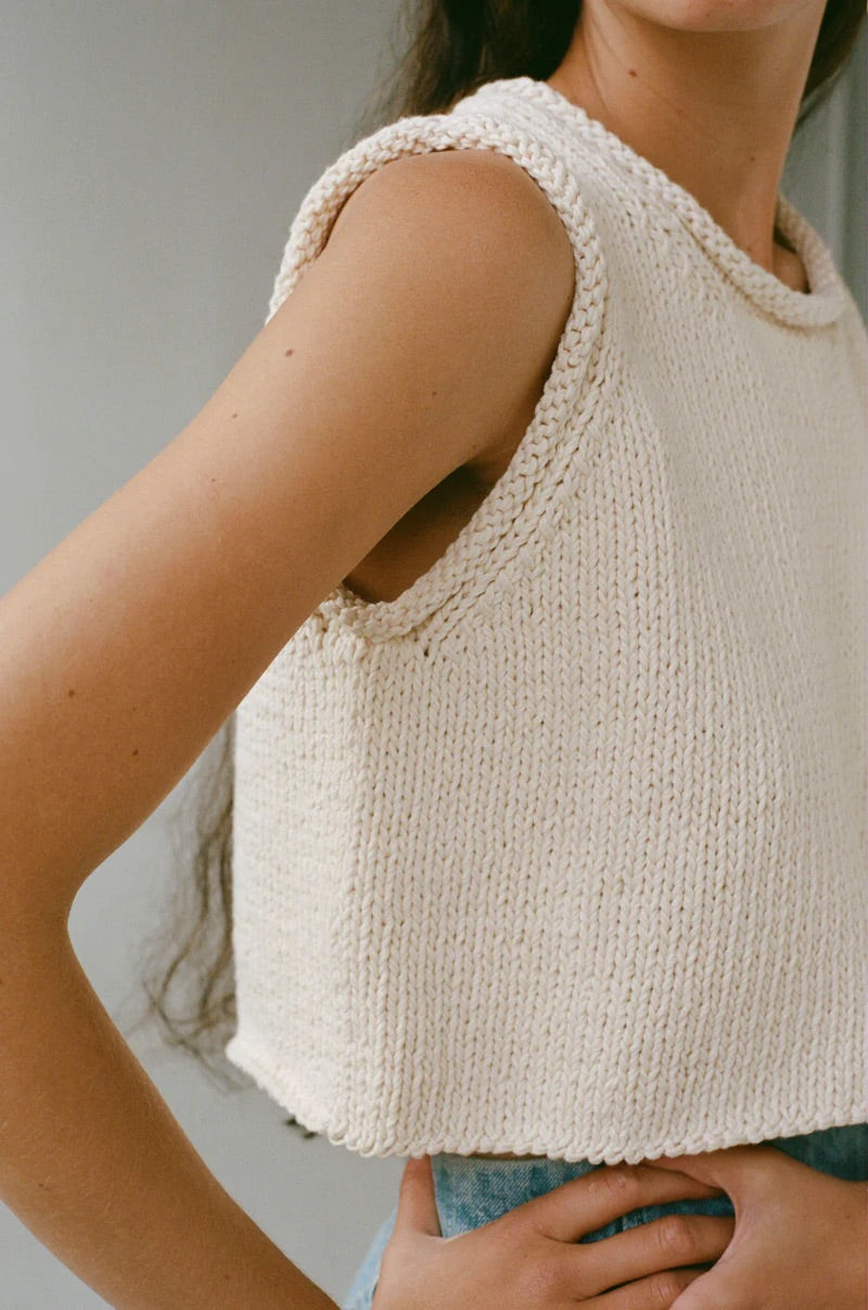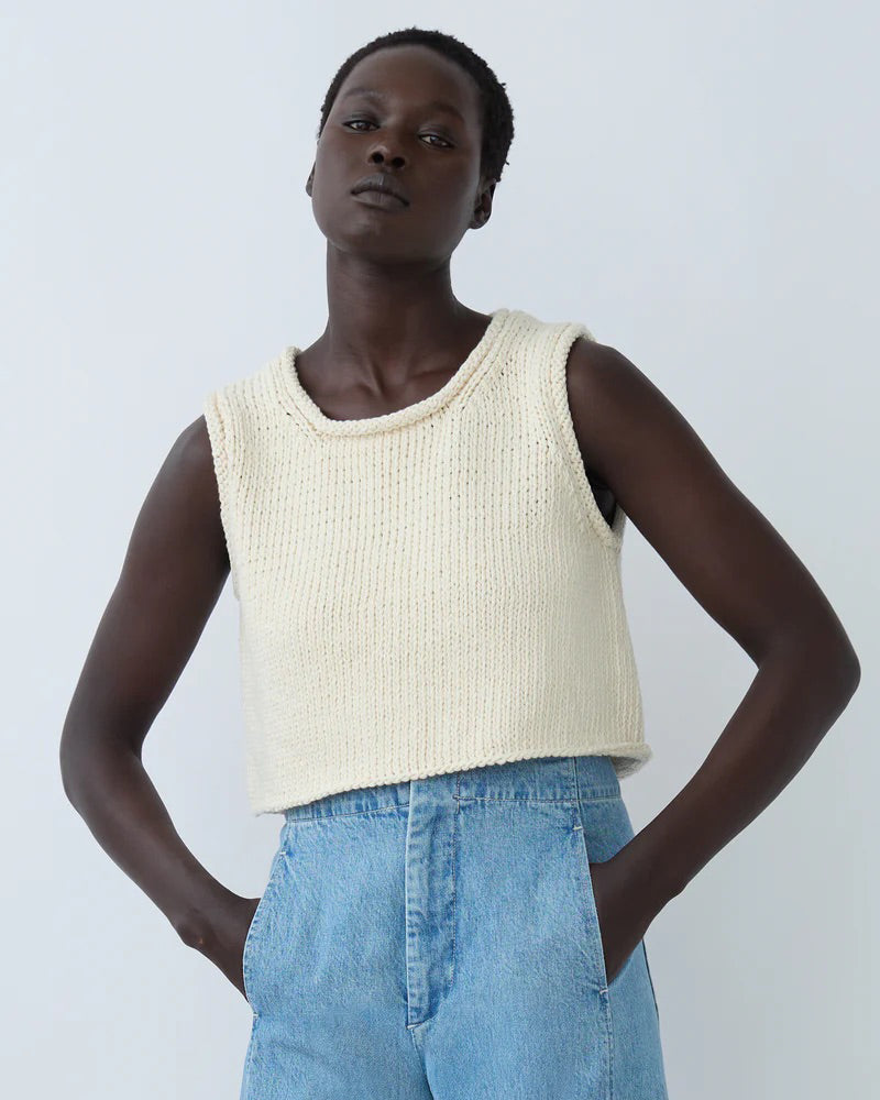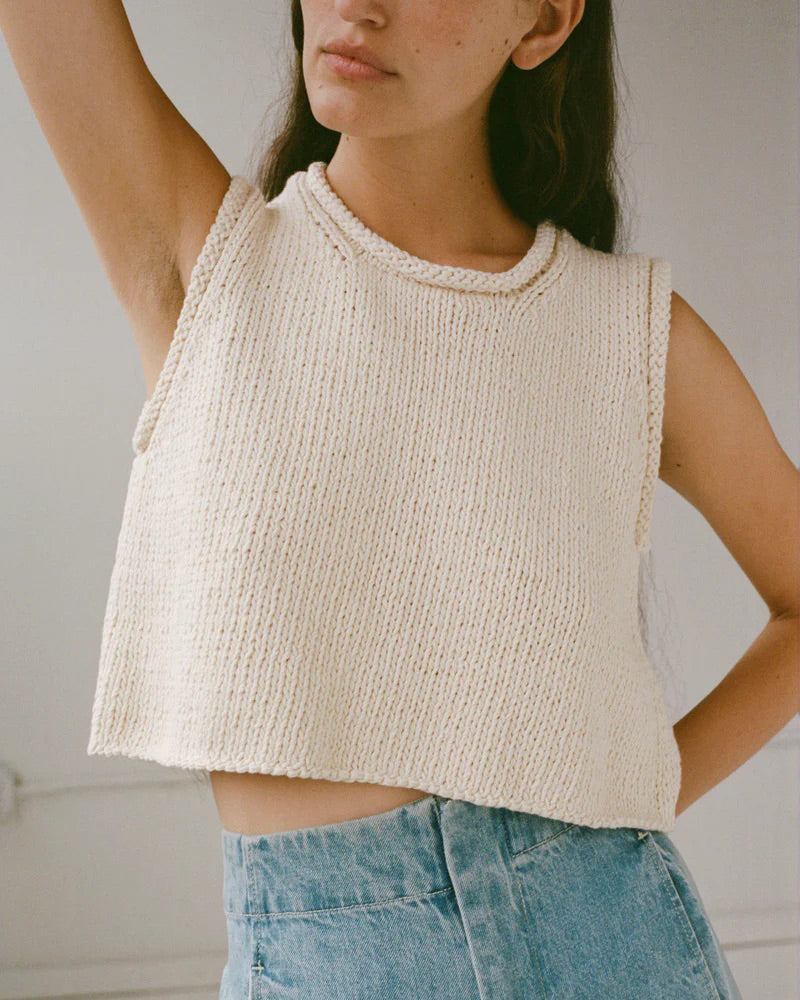 The Brisa Top is a handknit cotton shell style top in textural organic cotton. Envisioned to be worn alone as a cropped, structured layer that floats across the body with ease, or layered up like a vest. Roll neckline and sleeve details in a textural organic knit pattern.