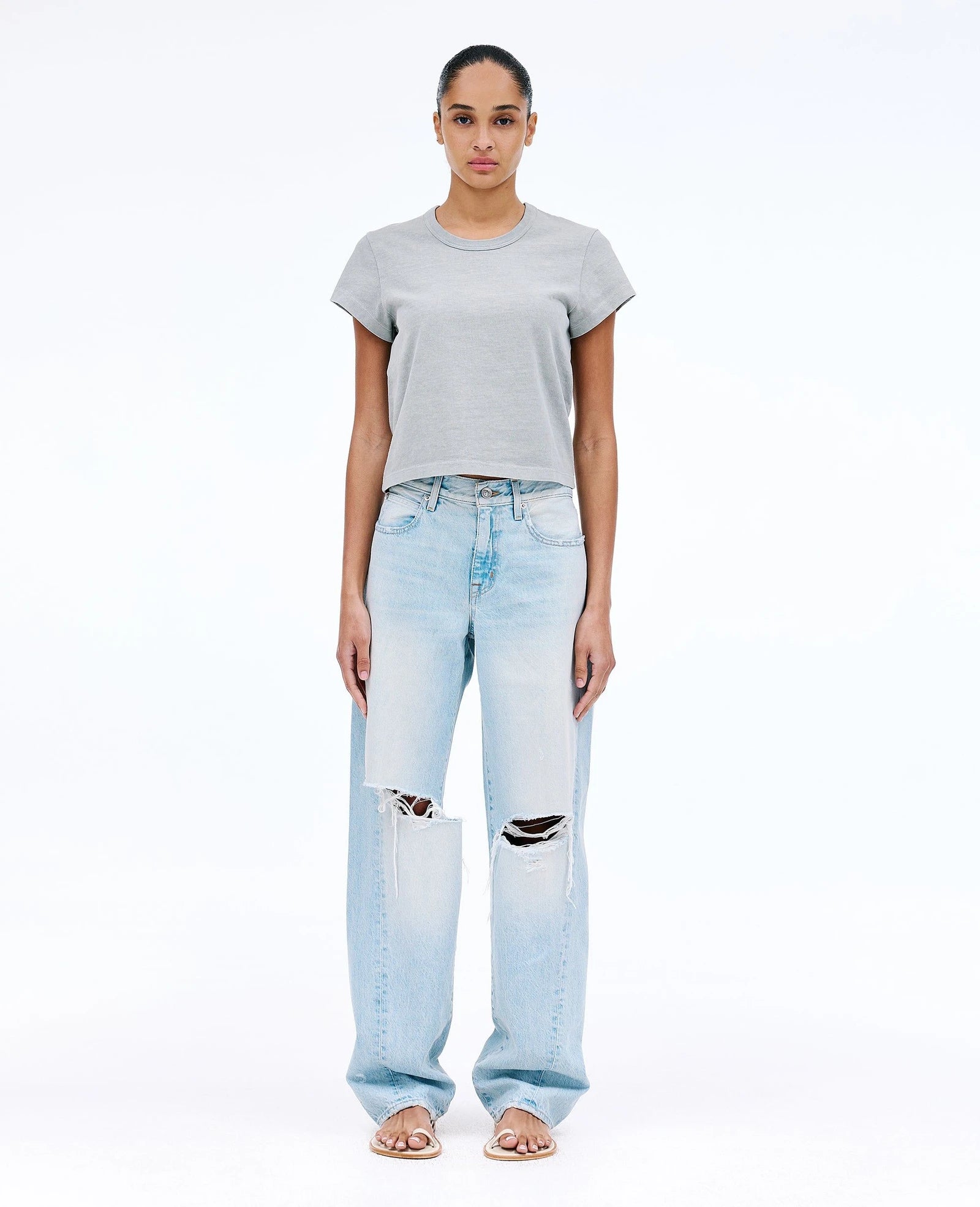 Heartbreak Hotel wash is is made from 100% rigid cotton and features a powdery blue stone wash and distressed knee rips for a vintage inspired finish