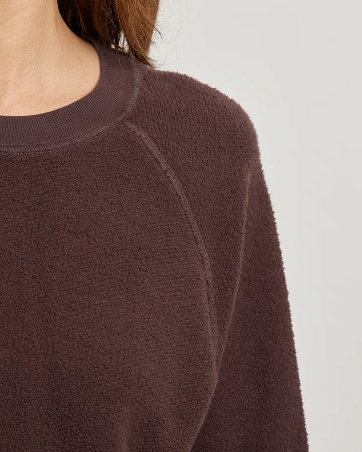 The classic sweatshirt “inside out” with exposed seam detailing and buttery soft fleece.