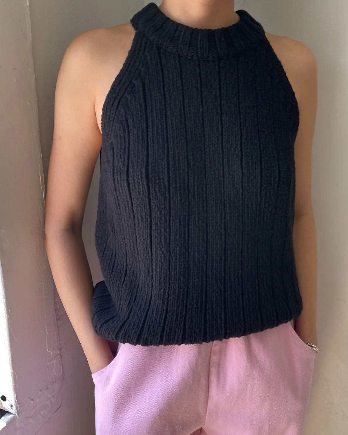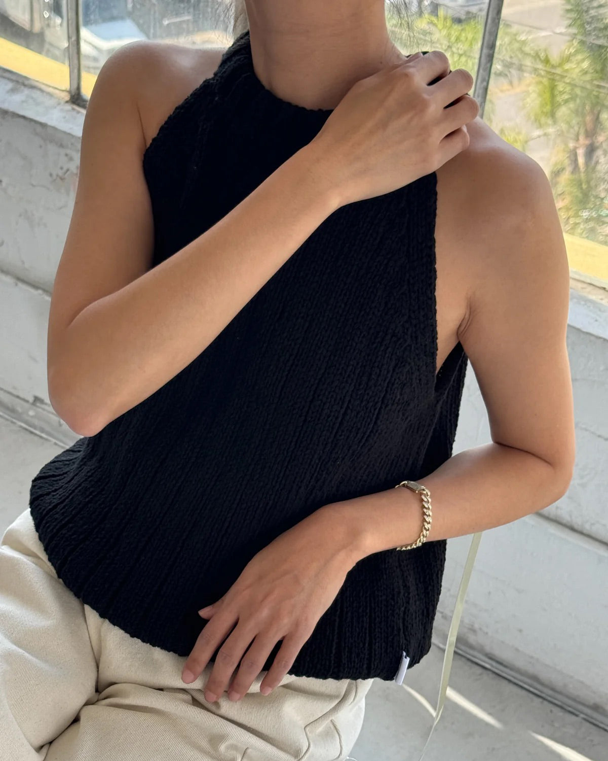 A refreshing and elevated take on the halter top. It follows a modern silhouette that draws inspiration from the classic halter straps we all know and love. Made of cotton, it features thick ribbed details throughout and maintains the perfect length to pair with your favorite bottoms.