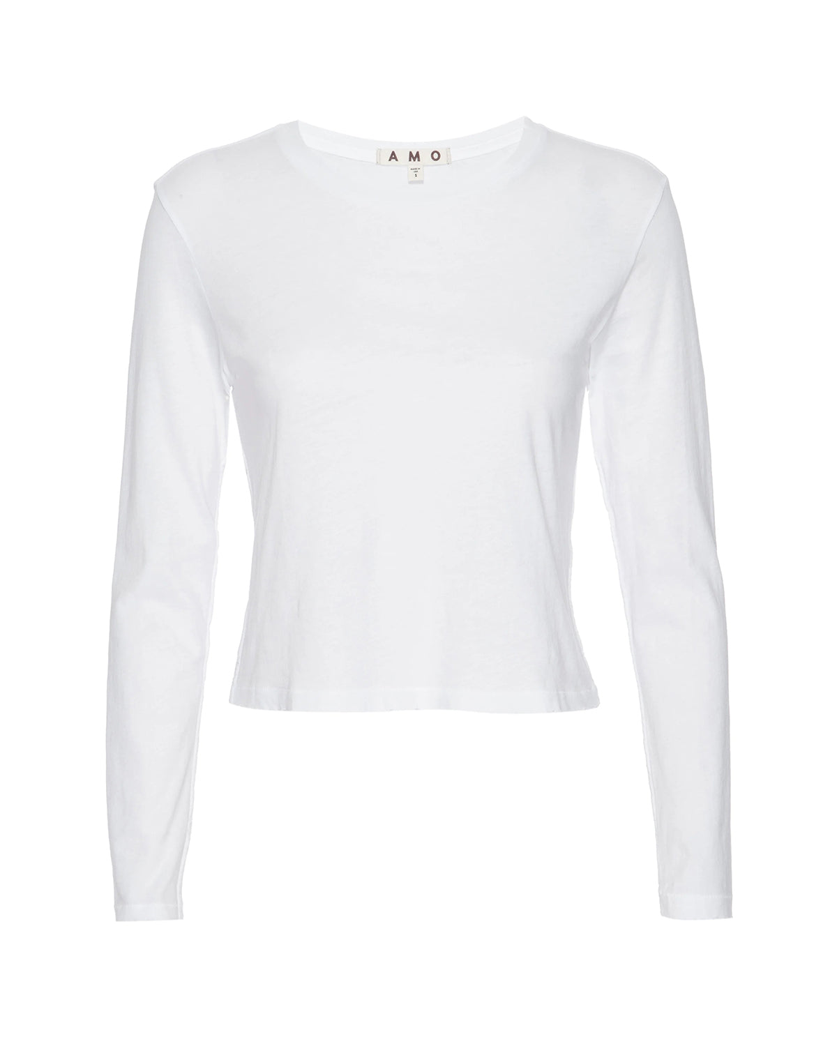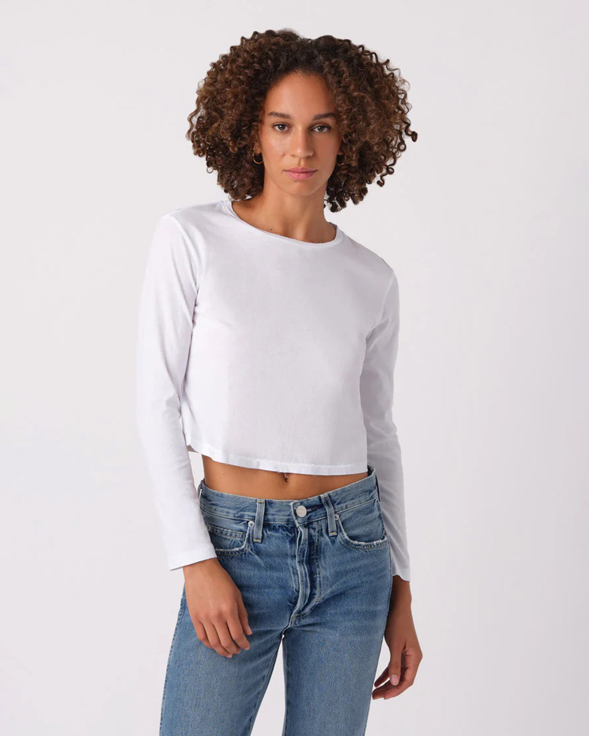 The perfect tee to wear with high waisted jeans! Cropped fit features long sleeves and signature double needle side seam detail. Tonal topstitching and subtle distressing around edges for a worn-in feel.