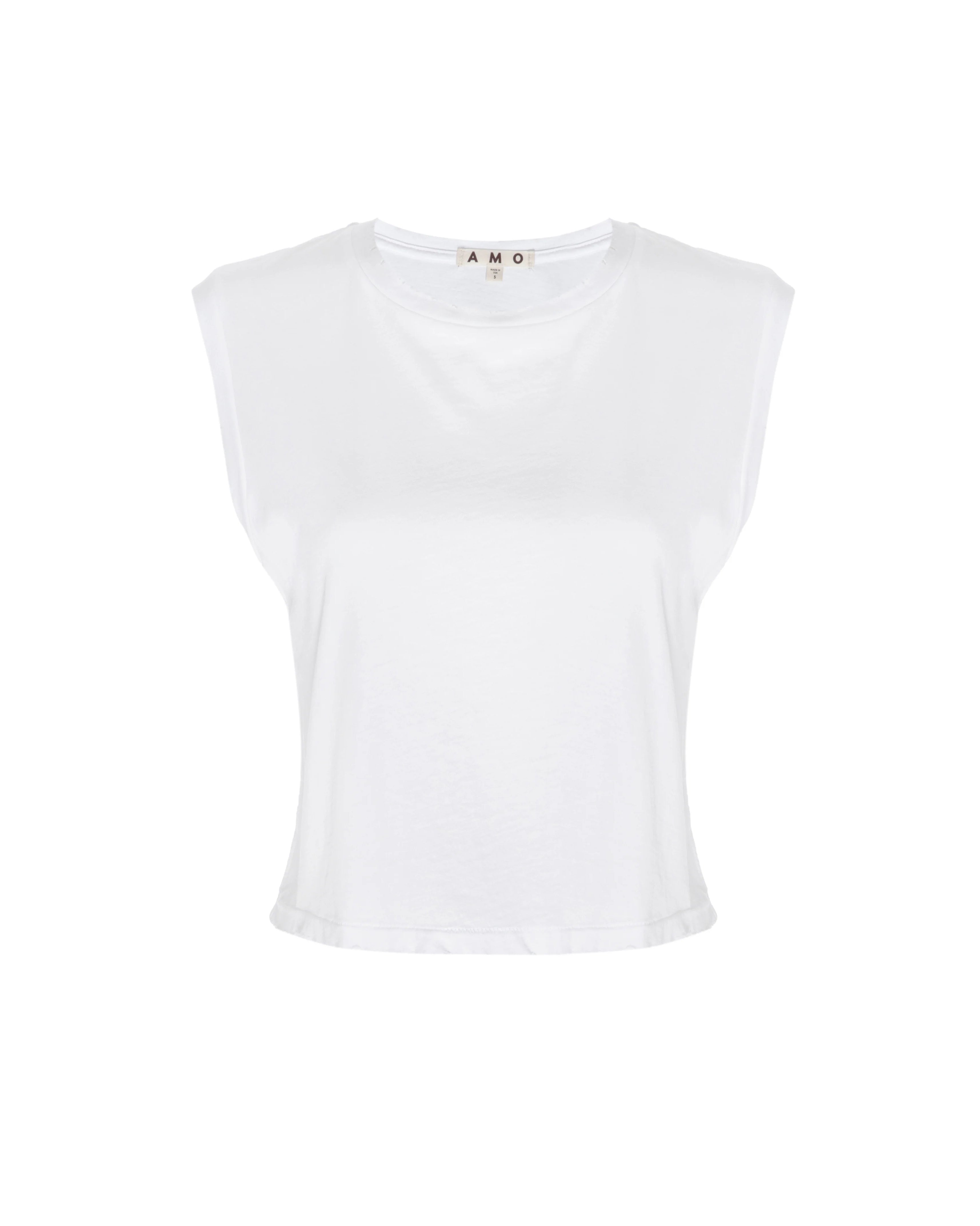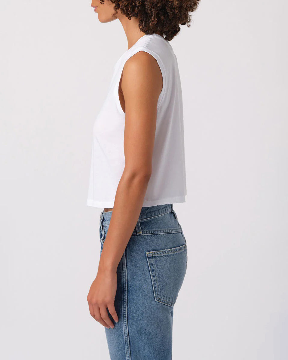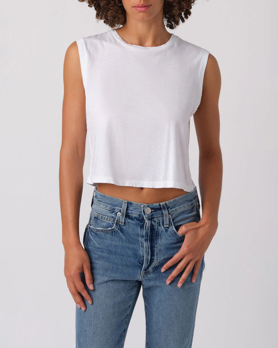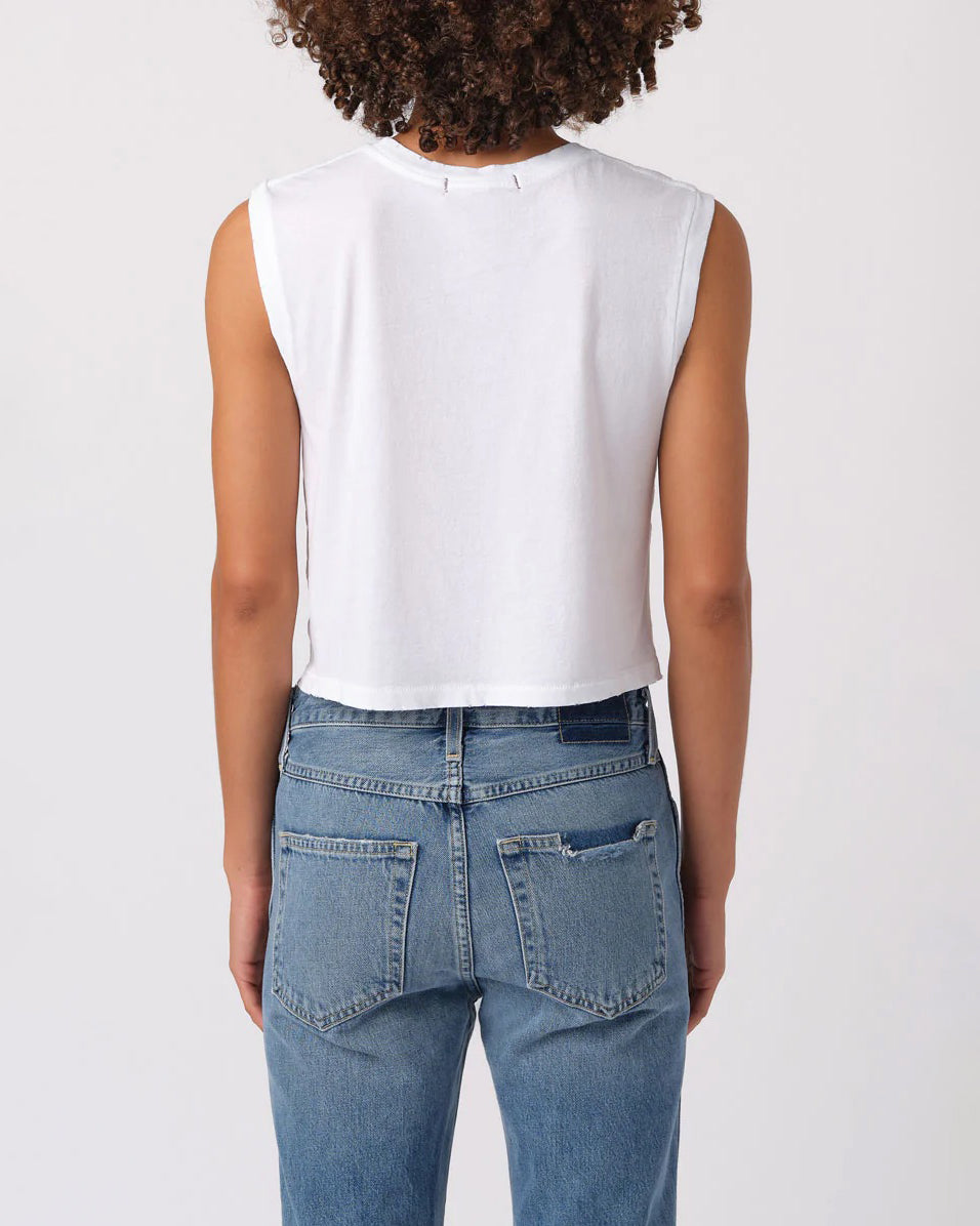 The perfect cropped, sleeveless tee to wear with high waisted jeans or shorts. Features our signature double needle side seam detail, tonal topstitching and subtle distressing around edges for a soft, worn-in feel.
