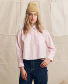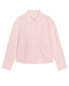 A playful twist on classic shirting. Cut from crisp cotton Oxford, this cropped shirt features a boxy silhouette, traditional tailoring details, and a subtle “TG” monogram embroidered near the hem. It’s the kind of piece that feels both polished and undone—perfect for pairing with denim or satin separates.
