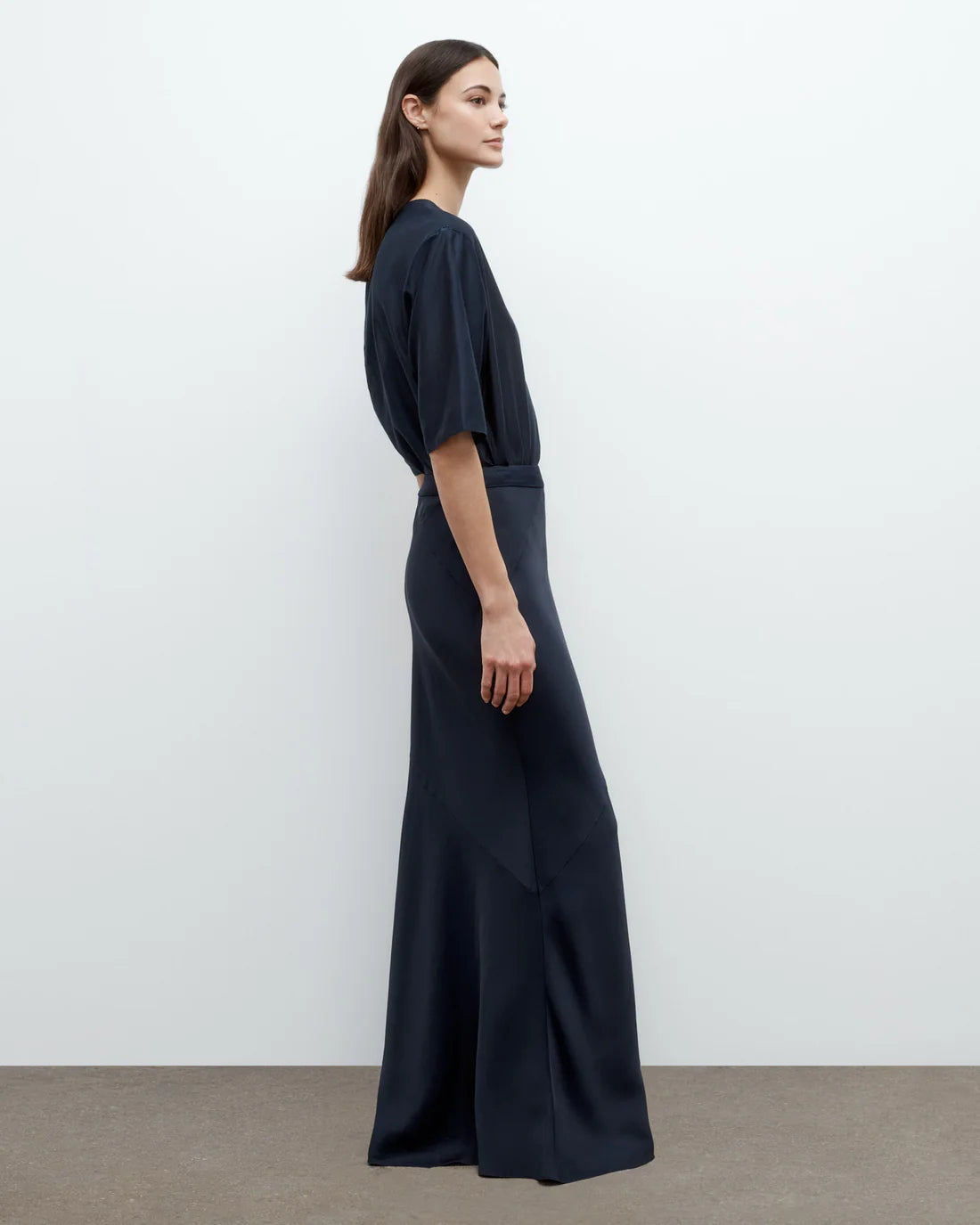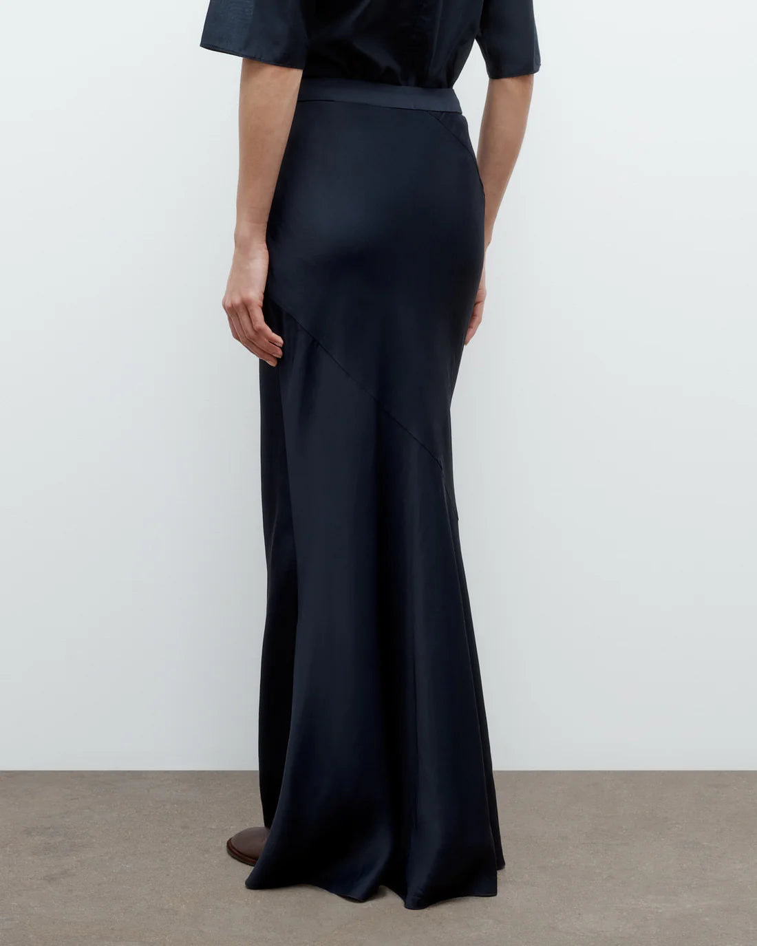 Mid-rise, floor length maxi skirt in coated viscose linen. We combined a European flax linen and viscose coating, creating a fabric with a deep color saturation, elegant drape and satiny sheen. My Endless Love has a paneled construction and drapes elegantly from the hips. Complete with a concealed zip at the side, hook fastening, waistband and train at the back.