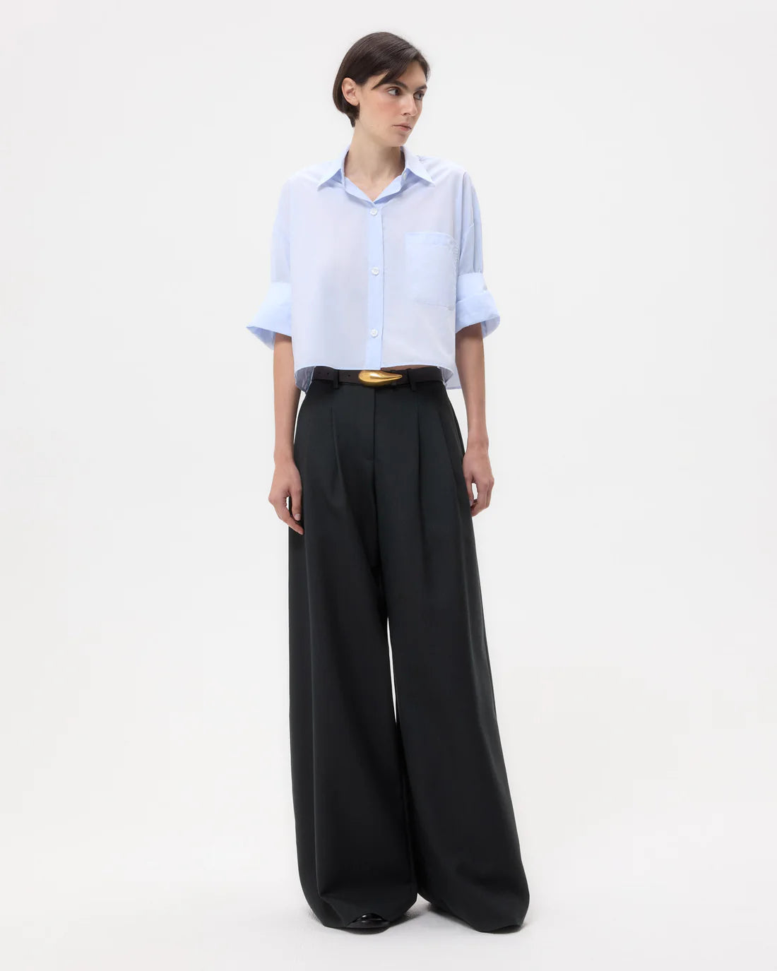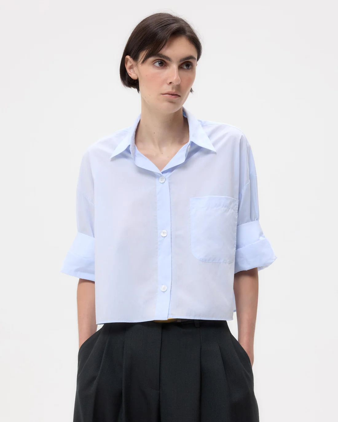 TWP’s signature short sleeved button down crafted in superfine Italian cotton shirting. The Next Ex is a cropped, boxy silhouette, complete with a chest patch pocket, button up placket, spread collar, and our signature double roll button cuffs.