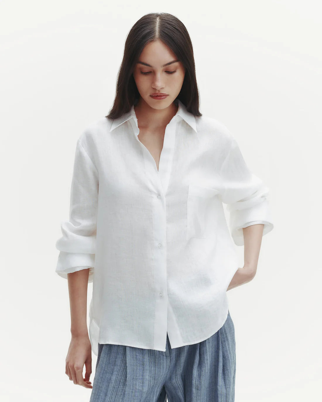 Relaxed button down shirt in Delave linen. This fabric is lightweight, with a soft hand and chambray effect. The Next Morning has a center box pleat at the back. Complete with an exposed button up placket, chest patch pocket, spread collar and single roll button cuffs.