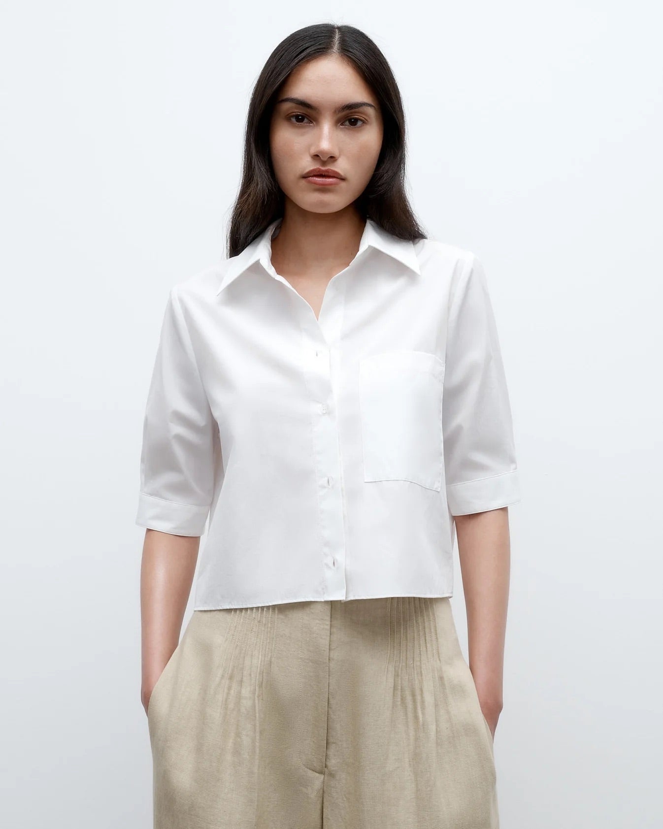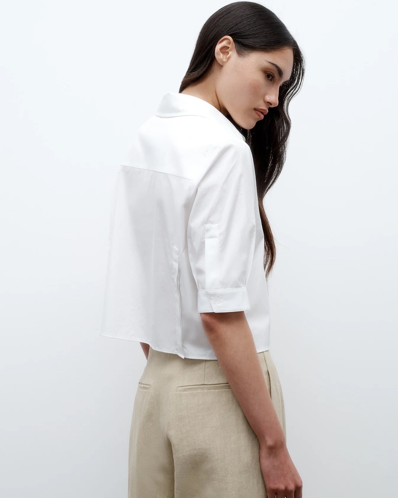 Cropped, half sleeve button down shirt in cotton poplin. This fabric is lightweight with a smooth texture and crisp hand feel. Short Lived is a boxy fit. Complete with a chest patch pocket, exposed placket, pleats at the sleeves and french cuffs.