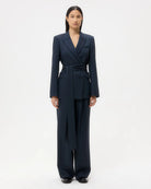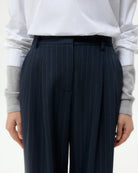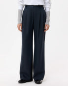 High-rise, wide-leg trousers in stretch wool. Fabric is viscose/wool blend with a touch of stretch for comfort. Relaxed through the hip and leg with front pleats for added volume. Complete with belt loops, side pockets, and a concealed zip-fly with hook-and-eye closure.